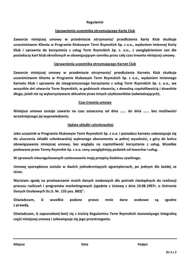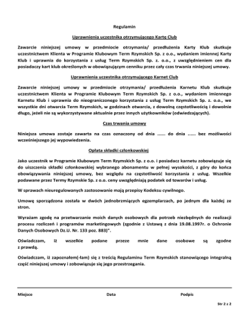 Regulamin Uprawnienia uczestnika otrzymującego Kartę Club Zawarcie niniejszej umowy w przedmiocie otrzymania/ przedłużenia Karty Klub skutkuje uczestnictwem Klienta w Programie Klubowym Term Rzymskich Sp. z o.o., wydaniem imiennej Karty Klub i uprawnia do korzystania z usług Term Rzymskich Sp. z. o.o., z uwzględnieniem cen dla posiadaczy kart klub określonych w obowiązującym cenniku przez cały czas trwania niniejszej umowy. Uprawnienia uczestnika otrzymującego Karnet Club Zawarcie niniejszej umowy w przedmiocie otrzymania/ przedłużenia Karnetu Klub skutkuje uczestnictwem Klienta w Programie Klubowym Term Rzymskich Sp. z o.o., wydaniem imiennego Karnetu Klub i uprawnia do nieograniczonego korzystania z usług Term Rzymskich Sp. z. o.o., we wszystkie dni otwarcia Term Rzymskich, w godzinach otwarcia, z dowolną częstotliwością i dowolnie długo, jeżeli nie są wykorzystywane aktualnie przez innych użytkowników (odwiedzających). Czas trwania umowy Niniejsza umowa zostaje zawarta na czas oznaczony od dnia ...... do dnia ...... bez możliwości wcześniejszego jej wypowiedzenia. Opłata składki członkowskiej Jako uczestnik w Programie Klubowym Term Rzymskich Sp. z o.o. i posiadacz karnetu zobowiązuje się do uiszczenia składki członkowskiej wybranego abonamentu w pełnej wysokości, z góry do końca obowiązywania niniejszej umowy, bez względu na częstotliwość korzystania z usług. Wszelkie podawane przez Termy Rzymskie Sp. z o.o. ceny uwzględniają podatek od towarów i usług. W sprawach nieuregulowanych zastosowanie mają przepisy Kodeksu cywilnego. Umowę sporządzona została w dwóch jednobrzmiących egzemplarzach, po jednym dla każdej ze stron. Wyrażam zgodę na przetwarzanie moich danych osobowych dla potrzeb niezbędnych do realizacji procesu rozliczeń i programów marketingowych (zgodnie z Ustawą z dnia 19.08.1997r. o Ochronie Danych Osobowych Dz.U. Nr. 133 poz. 883)". Oświadczam, z prawdą. iż wszelkie podane przeze mnie dane osobowe są zgodne Oświadczam, iż zapoznałem(-łam) się z treścią Regulaminu Term Rzymskich stanowiącego integralną część niniejszej umowy i zobowiązuje się jego przestrzegania. Miejsce Data Podpis Str 2 z 2