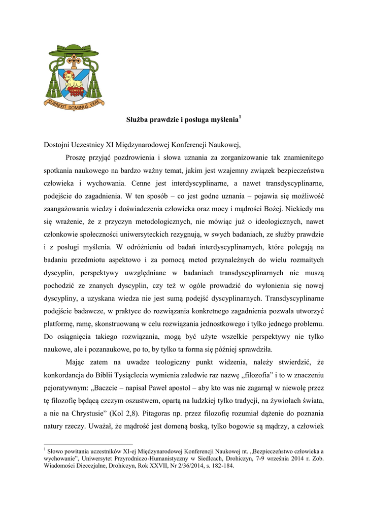 Służba prawdzie i posługa myślenia1 Dostojni Uczestnicy XI Międzynarodowej Konferencji Naukowej, Proszę przyjąć pozdrowienia i słowa uznania za zorganizowanie tak znamienitego spotkania naukowego na bardzo ważny temat, jakim jest wzajemny związek bezpieczeństwa człowieka i wychowania. Cenne jest interdyscyplinarne, a nawet transdyscyplinarne, podejście do zagadnienia. W ten sposób – co jest godne uznania – pojawia się możliwość zaangażowania wiedzy i doświadczenia człowieka oraz mocy i mądrości Bożej. Niekiedy ma się wrażenie, że z przyczyn metodologicznych, nie mówiąc już o ideologicznych, nawet członkowie społeczności uniwersyteckich rezygnują, w swych badaniach, ze służby prawdzie i z posługi myślenia. W odróżnieniu od badań interdyscyplinarnych, które polegają na badaniu przedmiotu aspektowo i za pomocą metod przynależnych do wielu rozmaitych dyscyplin, perspektywy uwzględniane w badaniach transdyscyplinarnych nie muszą pochodzić ze znanych dyscyplin, czy też w ogóle prowadzić do wyłonienia się nowej dyscypliny, a uzyskana wiedza nie jest sumą podejść dyscyplinarnych. Transdyscyplinarne podejście badawcze, w praktyce do rozwiązania konkretnego zagadnienia pozwala utworzyć platformę, ramę, skonstruowaną w celu rozwiązania jednostkowego i tylko jednego problemu. Do osiągnięcia takiego rozwiązania, mogą być użyte wszelkie perspektywy nie tylko naukowe, ale i pozanaukowe, po to, by tylko ta forma się później sprawdziła. Mając zatem na uwadze teologiczny punkt widzenia, należy stwierdzić, że konkordancja do Biblii Tysiąclecia wymienia zaledwie raz nazwę „filozofia” i to w znaczeniu pejoratywnym: „Baczcie – napisał Paweł apostoł – aby kto was nie zagarnął w niewolę przez tę filozofię będącą czczym oszustwem, opartą na ludzkiej tylko tradycji, na żywiołach świata, a nie na Chrystusie” (Kol 2,8). Pitagoras np. przez filozofię rozumiał dążenie do poznania natury rzeczy. Uważał, że mądrość jest domeną boską, tylko bogowie są mądrzy, a człowiek 1 Słowo powitania uczestników XI-ej Międzynarodowej Konferencji Naukowej nt. „Bezpieczeństwo człowieka a wychowanie”, Uniwersytet Przyrodniczo-Humanistyczny w Siedlcach, Drohiczyn, 7-9 września 2014 r. Zob. Wiadomości Diecezjalne, Drohiczyn, Rok XXVII, Nr 2/36/2014, s. 182-184. może tylko mądrości pragnąć, być jej miłośnikiem, czyli filozofem. Należy zauważyć, że Paweł apostoł wypowiedział się w ten sposób o filozofii dopiero po swoim nawróceniu. Dokonał się w nim zwrot, co więcej, odwrócenie perspektywy. Zaczął uważać za „stratę” i „śmiecie” to wszystko, co wcześniej stanowiło dla niego najwyższy ideał, niemal rację jego bytu (por. Flp 3,7-8). Zmiana ta nastąpiła nie na skutek własnej refleksji, lecz w wyniku wielkiego wydarzenia, którym było spotkanie ze Zmartwychwstałym. Nie zmieniła go zatem myśl, lecz wydarzenie, nieodparta obecność Chrystusa zmartwychwstałego, w którą nie będzie mógł już nigdy zwątpić, tak bowiem silna była oczywistość tego spotkania. Tak więc zwrot w życiu Pawła apostoła, poczucie bezpieczeństwa i ta przemiana całego jego jestestwa, to nie był owoc procesu psychologicznego, dojrzewania czy ewolucji intelektualnej i moralnej – jej przyczyna przyszła z zewnątrz: była wynikiem spotkania z Jezusem Chrystusem. Poznał prawdę, która dała mu poczucie bezpieczeństwa i zmieniła jego postępowanie. Wcześniej zadawał cierpienie i zabijał innych w imię Boga, teraz zaś w imię Boga sam był gotów cierpieć i oddać życie za innych. Wcześniej, zakochany w pełnieniu swej misji, walczył przeciw ludziom, zaś teraz, w jedności z Chrystusem, walczy o ludzi. To krótkie zestawienie dziedzin poznania opartego na rozumie i na wierze, na nauce i religii, ma na celu łamanie „fałszywych dogmatów”, dowartościowanie myślenia odważnego i krytycznego, a jednocześnie kompleksowego i twórczego. Dlatego też surowe ostrzeżenie Pawła apostoła nie powinno umniejszać wzajemnej sympatii i szacunku uczonych z zakresu teologii, nauk ścisłych, empirycznych, humanistycznych a tym bardziej filozoficznych, dla których filozofia – jak sama nazwa wskazuje – stanowi „umiłowanie mądrości”. Ostrzeżenia apostoła w żaden sposób nie należy uważać za odrzucenie rozumu i mądrości ludzkiej, lecz należy dostrzec ich właściwe zestawienie z mądrością i mocą Bożą w stosunku do wiary nadprzyrodzonej: „A moja mowa – powie apostoł w innym miejscu – i moje głoszenie nauki nie miały nic z uwodzących przekonywaniem słów mądrości, lecz były ukazywaniem ducha i mocy, aby wiara wasza opierała się nie na mądrości ludzkiej, lecz na mocy Bożej” (1Kor 2,4-5). Filozofia i inne nauki mogą być zatem bardzo pomocne w odsłanianiu i ukazywaniu ducha i mocy Bożej, będących ostoją bezpieczeństwa człowieka i kształtować aksjologiczną bazę wychowawczą.. Życzę Organizatorom i Uczestnikom XI Międzynarodowej Konferencji Naukowej, by – przebywając w naszym domu seminaryjnym – przeżyli chwile intelektualnego zadowolenia, doznali pełnego doznania naszej życzliwości, które pozwoli bezpośrednio doświadczać wpływu bezpieczeństwa człowieka na jego wychowanie oraz ścisłej zależności bezpieczeństwa człowieka od jego wychowania. 2