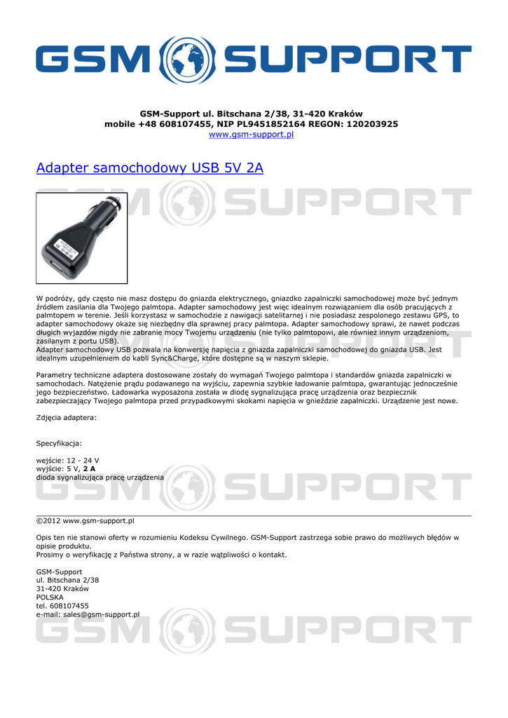 GSM-Support ul. Bitschana 2/38, 31-420 Kraków mobile +48 608107455, NIP PL9451852164 REGON: 120203925 www.gsm-support.pl Adapter samochodowy USB 5V 2A W podróży, gdy często nie masz dostępu do gniazda elektrycznego, gniazdko zapalniczki samochodowej może być jednym źródłem zasilania dla Twojego palmtopa. Adapter samochodowy jest więc idealnym rozwiązaniem dla osób pracujących z palmtopem w terenie. Jeśli korzystasz w samochodzie z nawigacji satelitarnej i nie posiadasz zespolonego zestawu GPS, to adapter samochodowy okaże się niezbędny dla sprawnej pracy palmtopa. Adapter samochodowy sprawi, że nawet podczas długich wyjazdów nigdy nie zabranie mocy Twojemu urządzeniu (nie tylko palmtopowi, ale również innym urządzeniom, zasilanym z portu USB). Adapter samochodowy USB pozwala na konwersję napięcia z gniazda zapalniczki samochodowej do gniazda USB. Jest idealnym uzupełnieniem do kabli Sync&Charge, które dostępne są w naszym sklepie. Parametry techniczne adaptera dostosowane zostały do wymagań Twojego palmtopa i standardów gniazda zapalniczki w samochodach. Natężenie prądu podawanego na wyjściu, zapewnia szybkie ładowanie palmtopa, gwarantując jednocześnie jego bezpieczeństwo. Ładowarka wyposażona została w diodę sygnalizująca pracę urządzenia oraz bezpiecznik zabezpieczający Twojego palmtopa przed przypadkowymi skokami napięcia w gnieździe zapalniczki. Urządzenie jest nowe. Zdjęcia adaptera: Specyfikacja: wejście: 12 - 24 V wyjście: 5 V, 2 A dioda sygnalizująca pracę urządzenia ©2012 www.gsm-support.pl Opis ten nie stanowi oferty w rozumieniu Kodeksu Cywilnego. GSM-Support zastrzega sobie prawo do możliwych błędów w opisie produktu. Prosimy o weryfikację z Państwa strony, a w razie wątpliwości o kontakt. GSM-Support ul. Bitschana 2/38 31-420 Kraków POLSKA tel. 608107455 e-mail: [email protected] Powered by TCPDF (www.tcpdf.org)