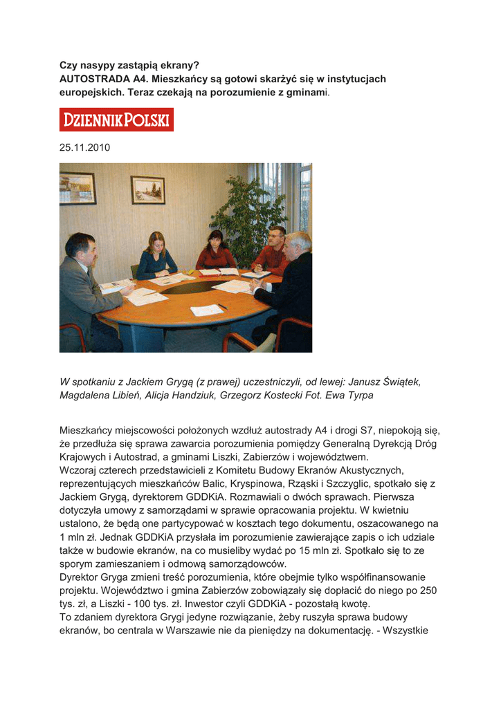 Czy nasypy zastąpią ekrany? AUTOSTRADA A4. Mieszkańcy są gotowi skarżyć się w instytucjach europejskich. Teraz czekają na porozumienie z gminami. 25.11.2010 W spotkaniu z Jackiem Grygą (z prawej) uczestniczyli, od lewej: Janusz Świątek, Magdalena Libień, Alicja Handziuk, Grzegorz Kostecki Fot. Ewa Tyrpa Mieszkańcy miejscowości położonych wzdłuż autostrady A4 i drogi S7, niepokoją się, że przedłuża się sprawa zawarcia porozumienia pomiędzy Generalną Dyrekcją Dróg Krajowych i Autostrad, a gminami Liszki, Zabierzów i województwem. Wczoraj czterech przedstawicieli z Komitetu Budowy Ekranów Akustycznych, reprezentujących mieszkańców Balic, Kryspinowa, Rząski i Szczyglic, spotkało się z Jackiem Grygą, dyrektorem GDDKiA. Rozmawiali o dwóch sprawach. Pierwsza dotyczyła umowy z samorządami w sprawie opracowania projektu. W kwietniu ustalono, że będą one partycypować w kosztach tego dokumentu, oszacowanego na 1 mln zł. Jednak GDDKiA przysłała im porozumienie zawierające zapis o ich udziale także w budowie ekranów, na co musieliby wydać po 15 mln zł. Spotkało się to ze sporym zamieszaniem i odmową samorządowców. Dyrektor Gryga zmieni treść porozumienia, które obejmie tylko współfinansowanie projektu. Województwo i gmina Zabierzów zobowiązały się dopłacić do niego po 250 tys. zł, a Liszki - 100 tys. zł. Inwestor czyli GDDKiA - pozostałą kwotę. To zdaniem dyrektora Grygi jedyne rozwiązanie, żeby ruszyła sprawa budowy ekranów, bo centrala w Warszawie nie da pieniędzy na dokumentację. - Wszystkie środki jakie otrzymujemy, to pieniądze przeznaczone na konkretne inwestycje. Gdybym miał fundusze, to budowalibyśmy ekrany - tłumaczy dyrektor, który zobowiązał się do zorganizowania do połowy grudnia spotkania w tej sprawie z samorządowcami. Jak zaznaczył Janusz Świątek, sołtys Szczyglic i radny Rady Gminy Zabierzów, termin jest ważny, samorządy będą uchwalać budżety i muszą wiedzieć, czy mają te kwoty w nich ujmować. Mieszkańcy sąsiadujący z autostradą są zdesperowani. Na budowę ekranów czekają 20 lat. Zaznaczają, że nie chcą nikogo szantażować, ale są gotowi do podjęcia ostatecznych kroków: blokady drogi do lotniska w Balicach i złożenia skargi do instytucji europejskich za nieprzestrzeganie przez państwo dyrektywy unijnej dotyczącej hałasu w środowisku oraz niewdrażanie uchwalonego przez Sejmik Województwa Małopolskiego "Programu ochrony środowiska przed hałasem do 2013 r.". Zobowiązuje on zarządców autostrady do zbudowania ekranów do 2013 r. - Nie widzimy szans na dotrzymanie tego terminu, skoro jeszcze nie rozpoczęto projektowania - denerwują się uczestnicy wczorajszego spotkania w GDDKiA. Nasze życie jest koszmarem, tiry jeżdżą przez całą dobę - w dzień i w nocy. Huk przedostaje się przez szczelnie zamknięte okna i w mieszkaniach mamy spore przekroczenia norm hałasu - mówią Alicja Handziuk, Grzegorz Kostecki i Magdalena Libień z Kryspinowa, uczestniczący we wczorajszym spotkaniu. Ich domy stoją tuż przy autostradzie. Nie rozumieją ciągłego tłumaczenia się brakiem pieniędzy, jakby ich życie nie było nic warte. Sami zaczęli szukać możliwości zdobycia pieniędzy na budowę ekranów. Można je pozyskać w Narodowym Funduszu Ochrony Środowiska i Gospodarki Wodnej. Jednak, jak stwierdził dyrektor Gryga, dotacja jest limitowana i rocznie można otrzymać 1 mln zł, co przy oszacowanych kosztach około 60 mln zł na 11-kilometrowym odcinku nie jest dużą kwotą. Dodatkowym problemem jest, że GDDKiA nie może być beneficjentem tych funduszy. Nasi rozmówcy zapowiadają podjęcie rozmów z różnymi politykami w sprawie zmiany przepisów i zwiększenia limitu. GDDKiA zaczęła szukać tańszych rozwiązań i zleciła wykonanie pomiarów po to, aby dowiedzieć się jak sprawdziłyby się konstrukcje z betonowymi elementami na ziemnych nasypach. - Byłyby tańsze, bo nie wymagałyby budowy dróg serwisowych i przebudowy skrzyżowań, wykupu gruntów, ale mogłyby one powstać tylko na niektórych odcinkach - powiedział Michał Polus, naczelnik Wydziału Ochrony Środowiska w GDDKiA. Eksperyment prowadzony jest z myślą o ochronie szkoły podstawowej. Mieszkańcy obawiają się, że dźwięk będzie przedostawał się do ich domów. Będą domagać się gwarancji, że gdyby nie był skuteczny, to GDDKiA się z niego wycofa. Jak powiedział nam Michał Polus, do połowy grudnia powinny być znane wyniki badań i wtedy okaże się, czy jest sens wykonywać takie zasłony. Ewa Tyrpa [email protected]