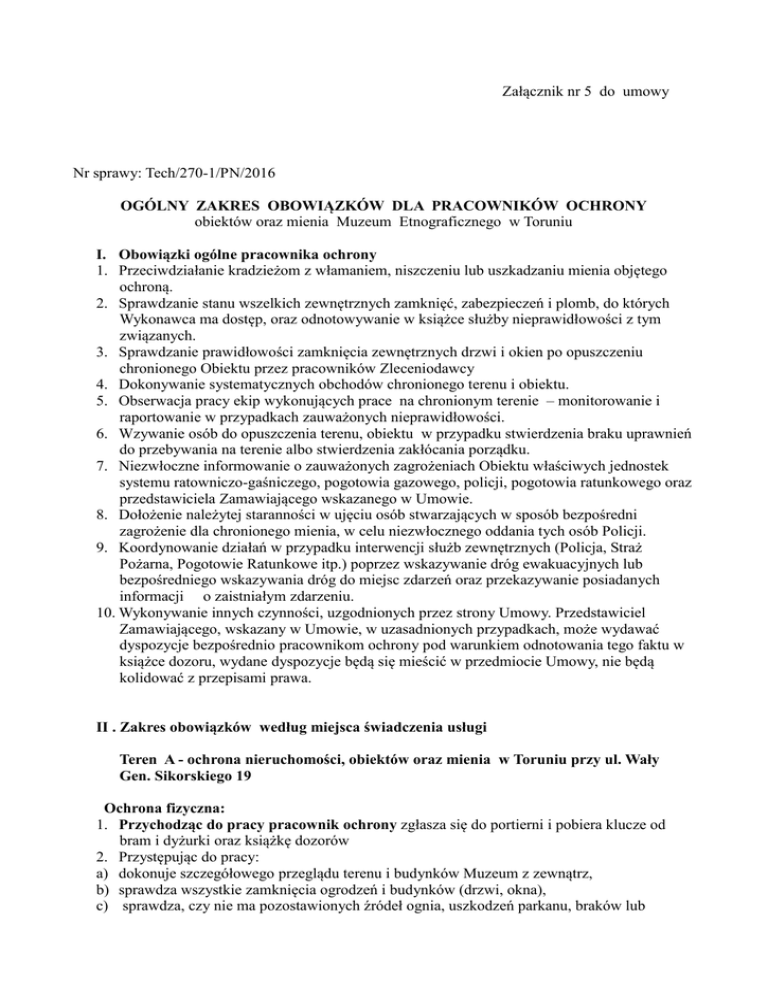 Załącznik nr 5 do umowy Nr sprawy: Tech/270-1/PN/2016 OGÓLNY ZAKRES OBOWIĄZKÓW DLA PRACOWNIKÓW OCHRONY obiektów oraz mienia Muzeum Etnograficznego w Toruniu I. Obowiązki ogólne pracownika ochrony 1. Przeciwdziałanie kradzieżom z włamaniem, niszczeniu lub uszkadzaniu mienia objętego ochroną. 2. Sprawdzanie stanu wszelkich zewnętrznych zamknięć, zabezpieczeń i plomb, do których Wykonawca ma dostęp, oraz odnotowywanie w książce służby nieprawidłowości z tym związanych. 3. Sprawdzanie prawidłowości zamknięcia zewnętrznych drzwi i okien po opuszczeniu chronionego Obiektu przez pracowników Zleceniodawcy 4. Dokonywanie systematycznych obchodów chronionego terenu i obiektu. 5. Obserwacja pracy ekip wykonujących prace na chronionym terenie – monitorowanie i raportowanie w przypadkach zauważonych nieprawidłowości. 6. Wzywanie osób do opuszczenia terenu, obiektu w przypadku stwierdzenia braku uprawnień do przebywania na terenie albo stwierdzenia zakłócania porządku. 7. Niezwłoczne informowanie o zauważonych zagrożeniach Obiektu właściwych jednostek systemu ratowniczo-gaśniczego, pogotowia gazowego, policji, pogotowia ratunkowego oraz przedstawiciela Zamawiającego wskazanego w Umowie. 8. Dołożenie należytej staranności w ujęciu osób stwarzających w sposób bezpośredni zagrożenie dla chronionego mienia, w celu niezwłocznego oddania tych osób Policji. 9. Koordynowanie działań w przypadku interwencji służb zewnętrznych (Policja, Straż Pożarna, Pogotowie Ratunkowe itp.) poprzez wskazywanie dróg ewakuacyjnych lub bezpośredniego wskazywania dróg do miejsc zdarzeń oraz przekazywanie posiadanych informacji o zaistniałym zdarzeniu. 10. Wykonywanie innych czynności, uzgodnionych przez strony Umowy. Przedstawiciel Zamawiającego, wskazany w Umowie, w uzasadnionych przypadkach, może wydawać dyspozycje bezpośrednio pracownikom ochrony pod warunkiem odnotowania tego faktu w książce dozoru, wydane dyspozycje będą się mieścić w przedmiocie Umowy, nie będą kolidować z przepisami prawa. II . Zakres obowiązków według miejsca świadczenia usługi Teren A - ochrona nieruchomości, obiektów oraz mienia w Toruniu przy ul. Wały Gen. Sikorskiego 19 Ochrona fizyczna: 1. Przychodząc do pracy pracownik ochrony zgłasza się do portierni i pobiera klucze od bram i dyżurki oraz książkę dozorów 2. Przystępując do pracy: a) dokonuje szczegółowego przeglądu terenu i budynków Muzeum z zewnątrz, b) sprawdza wszystkie zamknięcia ogrodzeń i budynków (drzwi, okna), c) sprawdza, czy nie ma pozostawionych źródeł ognia, uszkodzeń parkanu, braków lub -2d) uszkodzeń w sprzęcie p.poż, uszkodzeń budynków, e) wszystkie zauważone usterki zgłasza w portierni Muzeum i wpisuje w książce dozoru. 3. W czasie pełnienia dyżuru wielokrotnie obchodzi obszar Parku Etnograficznego oraz teren otaczający budynki Muzeum (minimum co 45 minut - 1 godz.). Pracownik w dyżurce przebywa tylko w celu spożycia posiłku, ogrzania się, chwilowego odpoczynku chwilowego odpoczynku, kontaktu telefonicznego z portiernią. 4. Pracownik zgłasza w portierni meldunek z przebiegu służby, zawiadamia portiernię o każdorazowym wyjściu i powrocie z obchodu oraz dokonuje zapisu w książce dozoru. 5. Pilnuje aby po zamknięciu Muzeum na jego terenie nie przebywały osoby obce bez zgody Dyrektora. Nie wpuszcza na teren Muzeum po godzinach pracy osób nieupoważnionych. 6. Wyprowadza z terenu obiektu osoby nietrzeźwe oraz naruszające przepisy porządkowe, bhp i ppoż. 7. W przypadkach wymagających natychmiastowej interwencji pracownik w porozumieniu z portiernią alarmuje: a) jeśli zajście dotyczy spraw pożarowych - Straż Pożarną, b) jeśli zajście wymaga interwencji policji - Policję, c) zawiadamia o zajściu osoby wskazane przez Zleceniodawcę lub jeśli zajście jest poważniejsze - Dyrektora Muzeum. 8. W przypadkach awaryjnych uszkodzeń pracownik winien zgłosić się do portierni o pomoc i zabezpieczyć małe uszkodzenie we własnym zakresie. 9. Zamyka i otwiera (w razie potrzeby np. gdy nie otwiera się elektronicznie) bramę wjazdową od strony ul. Uniwersyteckiej na dziedziniec gospodarczy Muzeum i na teren Skansenu. 10. W czasie pracy pracownik nie może opuścić terenu Muzeum, jak również nie może spać. 11. Przy każdorazowym wyjściu z pomieszczenia socjalnego zobowiązany jest je zamknąć, przy opuszczaniu terenu skansenu w celu sprawdzenia budynków Muzeum i terenu otaczającego zobowiązany jest również zamknąć bramy i furtki w ogrodzeniu. 12. Pracownik jest zobowiązany do wykonywania dorywczych prac porządkowych – w czasie zimowym odśnieżenia dojścia do głównych budynków Muzeum. W zakresie ochrony przeciwpożarowej pracownik ochrony musi: 1. Znać i przestrzegać dokładnie obowiązujące w Muzeum przepisy, instrukcje i zarządzenia w zakresie ochrony p.poż. 2. Znać lokalizację sprzętu p.poż ( hydrantów, gaśnic, skrzyni za sprzętem ) i znać środki alarmowania oraz sposób ich użycia. 3. Znać lokalizację zaworu głównego wodnego wzmacniającego ciśnienie w instalacji hydrantowej (dot. skansenu przy ul. Wały gen. Sikorskiego 19 w Toruniu) - do którego klucz znajduje się w portierni; w przypadku pożaru otworzyć zwór i wskazać Straży Pożarnej miejsce jego lokalizacji. 4. Przestrzegać zakazu palenia tytoniu i używania otwartego ognia na terenie całego skansenu ( z wyjątkiem miejsca wyznaczonego dla palących). 5. Utrzymywać pomieszczenie socjalne w czystości i porządku oraz pozostawiać je w takim stanie, aby nie mógł powstać pożar. Ochrona elektroniczna: ochrona antynapadowa. Muzeum posiada 3 piloty antynapadowe: jeden pilot znajduje się w portierni Muzeum mieszczącej się w arsenale, drugi posiada pracownik firmy ochroniarskiej- pełniący służbę, trzeci posiada osoba pracująca w sklepiku muzealnym. W razie napadu wciśnięcie przycisku w pilocie powoduje przesyłanie 
