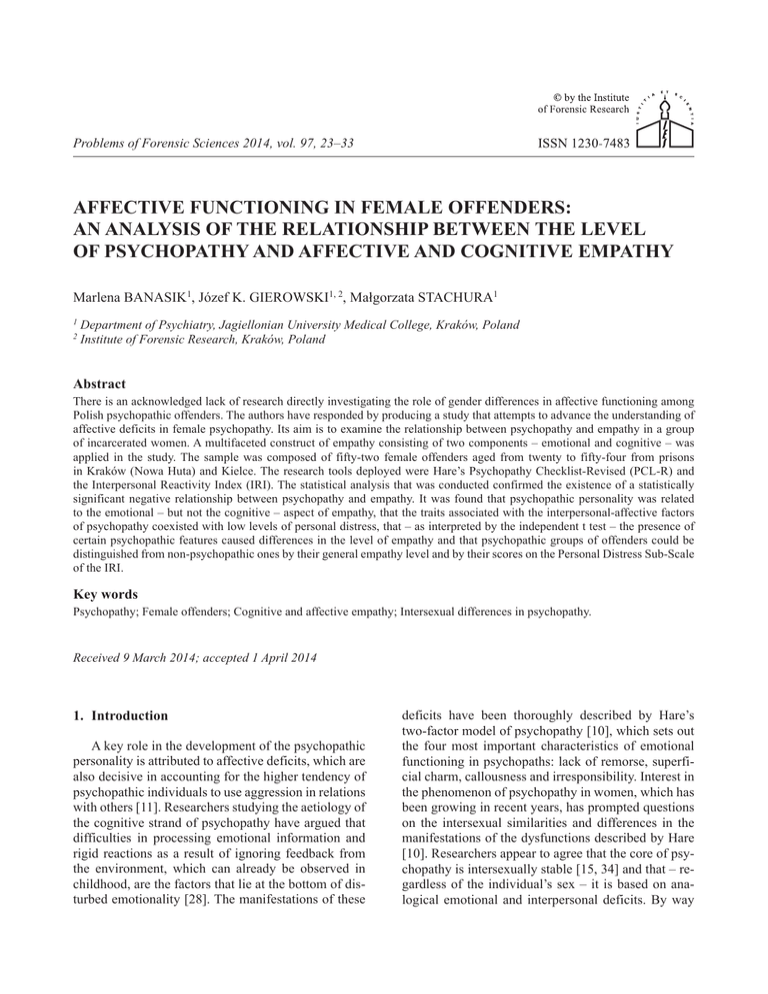 Problems of Forensic Sciences 2014, vol. 97, 23–33 Affective functioning in femAle offenders: An AnAlysis of the relAtionship between the level of psychopAthy And Affective And cognitive empAthy Marlena Banasik1, Józef k. Gierowski1, 2, Małgorzata stachura1 1 2 Department of Psychiatry, Jagiellonian University Medical College, Kraków, Poland Institute of Forensic Research, Kraków, Poland Abstract There is an acknowledged lack of research directly investigating the role of gender differences in affective functioning among Polish psychopathic offenders. The authors have responded by producing a study that attempts to advance the understanding of affective deficits in female psychopathy. Its aim is to examine the relationship between psychopathy and empathy in a group of incarcerated women. A multifaceted construct of empathy consisting of two components – emotional and cognitive – was applied in the study. The sample was composed of fifty-two female offenders aged from twenty to fifty-four from prisons in Kraków (Nowa Huta) and Kielce. The research tools deployed were Hare’s Psychopathy Checklist-Revised (PCL-R) and the Interpersonal Reactivity Index (IRI). The statistical analysis that was conducted confirmed the existence of a statistically significant negative relationship between psychopathy and empathy. It was found that psychopathic personality was related to the emotional – but not the cognitive – aspect of empathy, that the traits associated with the interpersonal-affective factors of psychopathy coexisted with low levels of personal distress, that – as interpreted by the independent t test – the presence of certain psychopathic features caused differences in the level of empathy and that psychopathic groups of offenders could be distinguished from non-psychopathic ones by their general empathy level and by their scores on the Personal Distress Sub-Scale of the IRI. Key words Psychopathy; Female offenders; Cognitive and affective empathy; Intersexual differences in psychopathy. Received 9 March 2014; accepted 1 April 2014 1. introduction A key role in the development of the psychopathic personality is attributed to affective deficits, which are also decisive in accounting for the higher tendency of psychopathic individuals to use aggression in relations with others [11]. Researchers studying the aetiology of the cognitive strand of psychopathy have argued that difficulties in processing emotional information and rigid reactions as a result of ignoring feedback from the environment, which can already be observed in childhood, are the factors that lie at the bottom of disturbed emotionality [28]. The manifestations of these deficits have been thoroughly described by Hare’s two-factor model of psychopathy [10], which sets out the four most important characteristics of emotional functioning in psychopaths: lack of remorse, superficial charm, callousness and irresponsibility. Interest in the phenomenon of psychopathy in women, which has been growing in recent years, has prompted questions on the intersexual similarities and differences in the manifestations of the dysfunctions described by Hare [10]. Researchers appear to agree that the core of psychopathy is intersexually stable [15, 34] and that – regardless of the individual’s sex – it is based on analogical emotional and interpersonal deficits. By way 24 M. Banasik, J. K. Gierowski, M. Stachura of contrast, the results of studies of the relationship between psychopathic characteristics and empathy have not been as coherent as one might have expected when analysing the theoretical assumptions of Hare’s model [10]. Among other things, it would appear that the results obtained depend on the tool used to measure empathy. Prompted by this apparent limitation, the authors decided to examine the nature of the relationship between psychopathy and the level of empathy in a group of fifty-two female offenders serving sentences in penal institutions in southern Poland. Davis’s Interpersonal Reactivity Index (IRI), a scale which addresses numerous aspects of emotional sensitivity and thus encompasses measurement of both the cognitive and emotional component of empathy, was selected to accomplish this task [3, 4]. 2. empathy Its leading researchers – Hoffman [12], Mehrabian and Epstein [22] – have described empathy as an affective reaction to the perceived experiences of another person. While these scholars represent what may be termed the emotional school of thought, others, such as Mellibruda [23], Mead [20] or Hogan [14], have taken a cognitive approach and have stressed the ability to formulate an accurate imaginative grasp of the internal world of others as the most important element in empathising. In a third approach, which is derived from both those set out above, empathy is understood as a multi-faceted, emotional-cognitive phenomenon. In this view, an organism acquires empathy by refining its psychological functions – mainly attention and memory in this case – through experience [33]. According to Davis [3, 4] the cognitive aspect of empathy is composed of an accurate perception of emotions, an ability to imagine and understand the emotional states of others and an affective component that embraces the emotional reaction described by Hoffman [12, 13] and by Mehrabian and Epstein [22]. In addition to Davis [4], who was mentioned earlier, similar opinions are held by the Polish researchers Cichy [2], Eliasz [7] and Trzebińska [32]. The notion that women possess a superior emotional attunement flows principally from research done on empathy among the general population. In this reading women are characterised as having a higher level of empathic skill than men [13, 21]. This is generally explained by referring to differences in socialisation between girls and boys and to expectations concerning certain social roles and tasks that depend on biological sex [13]. It is important from the societal poi