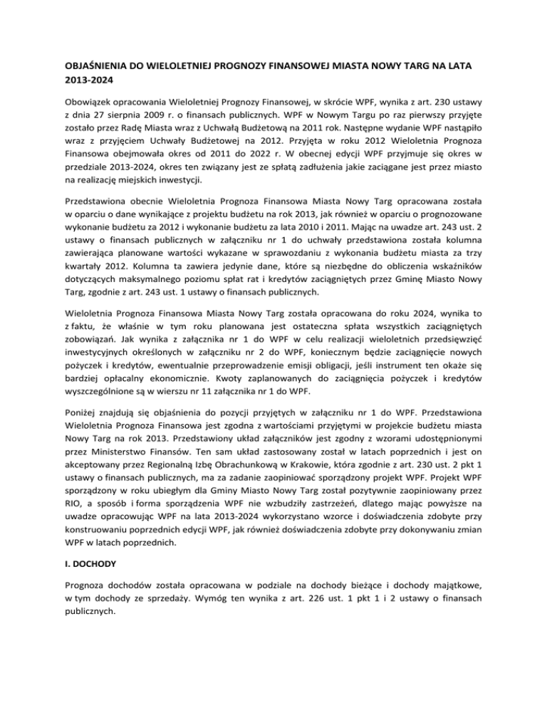 OBJAŚNIENIA DO WIELOLETNIEJ PROGNOZY FINANSOWEJ MIASTA NOWY TARG NA LATA 2013-2024 Obowiązek opracowania Wieloletniej Prognozy Finansowej, w skrócie WPF, wynika z art. 230 ustawy z dnia 27 sierpnia 2009 r. o finansach publicznych. WPF w Nowym Targu po raz pierwszy przyjęte zostało przez Radę Miasta wraz z Uchwałą Budżetową na 2011 rok. Następne wydanie WPF nastąpiło wraz z przyjęciem Uchwały Budżetowej na 2012. Przyjęta w roku 2012 Wieloletnia Prognoza Finansowa obejmowała okres od 2011 do 2022 r. W obecnej edycji WPF przyjmuje się okres w przedziale 2013-2024, okres ten związany jest ze spłatą zadłużenia jakie zaciągane jest przez miasto na realizację miejskich inwestycji. Przedstawiona obecnie Wieloletnia Prognoza Finansowa Miasta Nowy Targ opracowana została w oparciu o dane wynikające z projektu budżetu na rok 2013, jak również w oparciu o prognozowane wykonanie budżetu za 2012 i wykonanie budżetu za lata 2010 i 2011. Mając na uwadze art. 243 ust. 2 ustawy o finansach publicznych w załączniku nr 1 do uchwały przedstawiona została kolumna zawierająca planowane wartości wykazane w sprawozdaniu z wykonania budżetu miasta za trzy kwartały 2012. Kolumna ta zawiera jedynie dane, które są niezbędne do obliczenia wskaźników dotyczących maksymalnego poziomu spłat rat i kredytów zaciągniętych przez Gminę Miasto Nowy Targ, zgodnie z art. 243 ust. 1 ustawy o finansach publicznych. Wieloletnia Prognoza Finansowa Miasta Nowy Targ została opracowana do roku 2024, wynika to z faktu, że właśnie w tym roku planowana jest ostateczna spłata wszystkich zaciągniętych zobowiązań. Jak wynika z załącznika nr 1 do WPF w celu realizacji wieloletnich przedsięwzięć inwestycyjnych określonych w załączniku nr 2 do WPF, koniecznym będzie zaciągnięcie nowych pożyczek i kredytów, ewentualnie przeprowadzenie emisji obligacji, jeśli instrument ten okaże się bardziej opłacalny ekonomicznie. Kwoty zaplanowanych do zaciągnięcia pożyczek i kredytów wyszczególnione są w wierszu nr 11 załącznika nr 1 do WPF. Poniżej znajdują się objaśnienia do pozycji przyjętych w załączniku nr 1 do WPF. Przedstawiona Wieloletnia Prognoza Finansowa jest zgodna z wartościami przyjętymi w projekcie budżetu miasta Nowy Targ na rok 2013. Przedstawiony układ załączników jest zgodny z wzorami udostępnionymi przez Ministerstwo Finansów. Ten sam układ zastosowany został w latach poprzednich i jest on akceptowany przez Regionalną Izbę Obrachunkową w Krakowie, która zgodnie z art. 230 ust. 2 pkt 1 ustawy o finansach publicznych, ma za zadanie zaopiniować sporządzony projekt WPF. Projekt WPF sporządzony w roku ubiegłym dla Gminy Miasto Nowy Targ został pozytywnie zaopiniowany przez RIO, a sposób i forma sporządzenia WPF nie wzbudziły zastrzeżeń, dlatego mając powyższe na uwadze opracowując WPF na lata 2013-2024 wykorzystano wzorce i doświadczenia zdobyte przy konstruowaniu poprzednich edycji WPF, jak również doświadczenia zdobyte przy dokonywaniu zmian WPF w latach poprzednich. I. DOCHODY Prognoza dochodów została opracowana w podziale na dochody bieżące i dochody majątkowe, w tym dochody ze sprzedaży. Wymóg ten wynika z art. 226 ust. 1 pkt 1 i 2 ustawy o finansach publicznych. Założono w latach 2013-2022 coroczny wzrost dochodów bieżących (wiersz 1a), w tym w roku 2014 o 3,25%, w latach 2015-2018 średnio o 4%, a w latach 2019-2024 o 3%. Kwota dochodów bieżących w roku 2013 wynika z projektu budżetu na 2013 r. W pozycji dochody majątkowe (wiersz 1b) przyjęto planowane dochody ze środków z Unii Europejskiej, które wynikają z podpisanych umów na realizację zadań inwestycyjnych, ponadto w 2013 r. zaplanowano dochody z tytułu dotacji z budżetu państwa na budowę miejskiej pływalni. Zaplanowane dochody wynikają z zawartych już przez miasto umów o dofinansowanie lub umów, które zostaną zawarte (dotacja do miejskich stadionów, dotacja na utworzenie Strefy Aktywności Gospodarczej). W ramach dochodów majątkowych mieszczą się również dochody ze sprzedaży majątku (wiersz 1c). Planuje się pozyskanie dochodów z tytułu sprzedaży mieszkań komunalnych, w miarę potrzeb do sprzedaży wystawione zostaną również inne miejskie nieruchomości, w tym nieruchomości przy ul. Konfederacji Tatrzańskiej, kamienica przy ul. Harcerskiej, o ile nie zostanie zbyta w roku 2012. II. WYDATKI Wydatki podzielone są na 2 grupy: wydatki bieżące (wiersz 2 i 7b) i wydatki majątkowe (wiersz 10). Wydatki bieżące oszacowane zostały na podstawie wykonania lat poprzednich, w roku 2013 ujęta została kwota wydatków wynikających z projektu budżetu na 2013 rok. Zgodnie z art. 226 ust. 2 pkt 2 w ramach wydatków bieżących wyodrębniono wydatki na wynagrodzenia i składki od nich naliczane (wiersz 2a) oraz wydatki związane z funkcjonowaniem organów jednostki samorządu terytorialnego (rozdział 75011, 75022 i 75023 klasyfikacji budżetowej). Wyodrębniono również wydatki bieżące związane z realizacją przedsięwzięć wieloletnich (wiersz 2d), wykaz tych przedsięwzięć znajduje się w załączniku nr 2 do WPF, jak również wyodrębniono zgodnie z wymogami ustawowymi pozycję wydatków na obsługę poręczeń i gwarancji (wiersz 2c i 2d), w wierszu tym nie wykazuje się żadnych kwot, gdyż na chwilę obecną nie udzielono żadnych poręczeń i gwarancji i nie są one również planowane w latach następnych. Wyodrębniono również pozycję wydatków związanych z obsługą długu (wiersz 7b - odsetki od pożyczek i kredytów oraz prowizje). W wierszu tym przedstawiono koszty związane z zaciągniętym długiem w poszczególnych latach. Założono wzrost wydatków bieżących w latach 2014-2022 corocznie o 2%, z tym że wydatki bieżące w 2014 r. zostały pomniejszone w stosunku do roku 2013 o kwotę 1 mln zł, są to wydatki jednorazowe, które nie są planowane w latach następnych, jak np. odszko