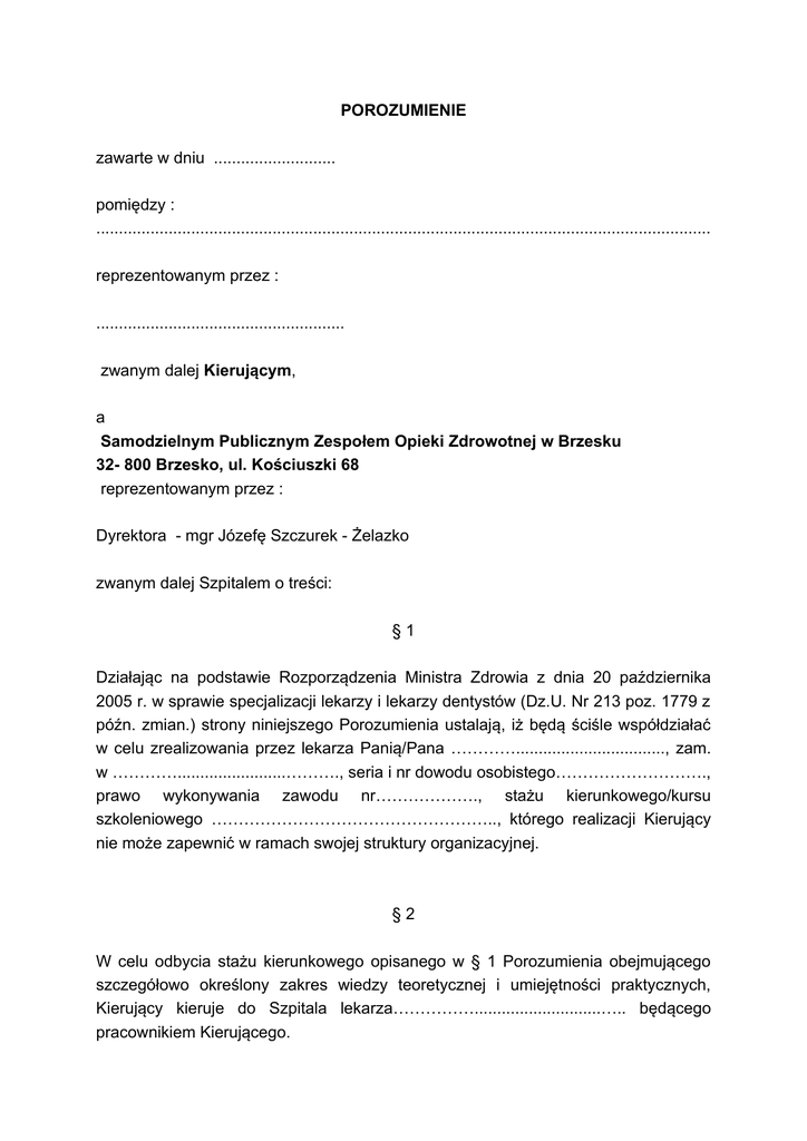 POROZUMIENIE zawarte w dniu ........................... pomiędzy : ........................................................................................................................................ reprezentowanym przez : ....................................................... zwanym dalej Kierującym, a Samodzielnym Publicznym Zespołem Opieki Zdrowotnej w Brzesku 32- 800 Brzesko, ul. Kościuszki 68 reprezentowanym przez : Dyrektora - mgr Józefę Szczurek - Żelazko zwanym dalej Szpitalem o treści: §1 Działając na podstawie Rozporządzenia Ministra Zdrowia z dnia 20 października 2005 r. w sprawie specjalizacji lekarzy i lekarzy dentystów (Dz.U. Nr 213 poz. 1779 z późn. zmian.) strony niniejszego Porozumienia ustalają, iż będą ściśle współdziałać w celu zrealizowania przez lekarza Panią/Pana …………................................., zam. w …………........................………., seria i nr dowodu osobistego………………………., prawo wykonywania zawodu nr………………., stażu kierunkowego/kursu szkoleniowego …………………………………………….., którego realizacji Kierujący nie może zapewnić w ramach swojej struktury organizacyjnej. §2 W celu odbycia stażu kierunkowego opisanego w § 1 Porozumienia obejmującego szczegółowo określony zakres wiedzy teoretycznej i umiejętności praktycznych, Kierujący kieruje do Szpitala lekarza……………............................….. będącego pracownikiem Kierującego. §3 Szpital zobowiązuje się do : 1) zapewnienia szkolącemu się realizacji programu stażu kierunkowego/kursu szkoleniowego, 2) zagwarantowania odpowiednich kwalifikacji opiekuna oraz personelu kształcącego. §4 Strony zgodnie ustalają, że szkolący się lekarz odbywa dyżury medyczne wyłącznie u Kierującego. §5 Koordynację prac z ustaleniem szczegółowego planu odbywania stażu/kursu szkoleniowego dokonywał będzie ze strony Kierującego Kierownik specjalizacji, a ze strony Szpitala staż kierunkowy/kurs szkoleniowy lekarz odbywać będzie pod kierunkiem lekarza specjalisty w danej dziedzinie medycyny, wyznaczonego przez Kierownika jednostki organizacyjnej Szpitala w której lekarz odbywa szkolenie. §6 Lekarz odbywający specjalizację zobowiązuje się do: 1) rzetelnego wykonywania powierzonych przez opiekuna szkolenia obowiązków, 2) dbania o powierzony przez Szpital sprzęt, materiały i inne wyposażenie Szpitala pod rygorem natychmiastowego rozwiązania przez Szpital niniejszej umowy. 3) Lekarz w okresie odbywania szkolenia zobowiązany jest do przestrzegania zasad oraz norm prawnych wynikających z przepisów i regulaminów Szpitala. 4) W okresie odbywania staży kierunkowych i kursów szkoleniowych lekarze podlegają służbowo i dyscyplinarnie Dyrektorowi Szpitala oraz wyznaczonemu opiekunowi. §7 Kierujący oświadcza, że odbywający specjalizację lekarz jest objęty ubezpieczeniem: 1) od odpowiedzialności cywilnej, 2) od następstw nieszczęśliwych wypadków na cały okres odbywania stażu kierunkowego lub kursu szkoleniowego. §8 Kierujący ponosi odpowiedzialność za szkody wyrządzone na terenie Szpitala, także wobec osób trzecich, przez lekarza oddelegowanego chyba, że powstały one z winy opiekuna. §9 1. Za wykonanie świadczeń medycznych w ramach odbywanego w Szpitalu stażu kierunkowego/kursu szkoleniowego lekarz nie otrzymuje od Szpitala wynagrodzenia. 2. Szpital nie pobiera od Kierującego opłat z tytułu prowadzenia stażu kierunkowego lub kursu szkoleniowego. 3. Wynagrodzenie za pracę lekarz oddelegowany otrzymuje od Kierującego. § 10 Porozumienie niniejsze zostaje zawarte na okres od dnia ………....................…. do dnia………............................... 2. Porozumienie niniejsze może zostać rozwiązane w każdym czasie za zgodą Stron. 3. Szpital może rozwiązać Porozumienie w trybie natychmiastowym w przypadku, gdy skierowany lekarz nie wypełnia obowiązków wynikających z niniejszego porozumienia, a w szczególności obowiązków wskazanych w § 6 niniejszego Porozumienia. 1. § 11 Porozumienie niniejsze wygasa w przypadku zaistnienia okoliczności uniemożliwiających realizację Porozumienia, za które Strony nie ponoszą odpowiedzialności. § 12 Wszelkie zmiany Porozumienia wymagają zgody obu Stron i muszą być wprowadzone pisemnie w formie aneksu. § 13 W sprawach nie uregulowanych niniejszą umową mają zastosowanie przepisy: 1. Rozporządzenia Ministra Zdrowia z dnia 20 października 2005 r. w sprawie specjalizacji lekarzy i lekarzy dentystów (Dz.U. Nr 213 poz. 1779 z późn. zmian.), 2. Ustawy z dnia 5 grudnia 1996 r. o zawodach lekarza i lekarza dentysty (t.j. Dz.U. z 2008 r. Nr 136 poz. 857 z późn. zmian.) 3. Kodeksu Cywilnego oraz innych obowiązujących w tym zakresie przepisów prawa. § 14 Porozumienie sporządzono w dwóch jednobrzmiących egzemplarzach, po jednym dla każdej ze Stron. Kierujący Szpital