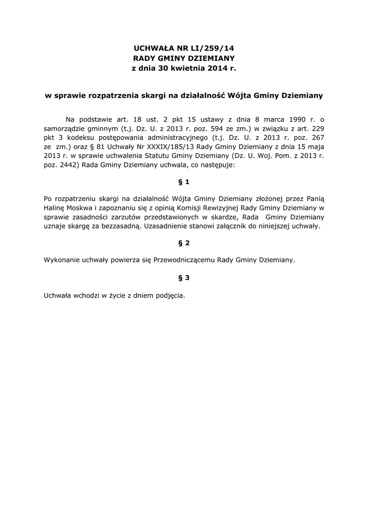 UCHWAŁA NR LI/259/14 RADY GMINY DZIEMIANY z dnia 30 kwietnia 2014 r. w sprawie rozpatrzenia skargi na działalność Wójta Gminy Dziemiany Na podstawie art. 18 ust. 2 pkt 15 ustawy z dnia 8 marca 1990 r. o samorządzie gminnym (t.j. Dz. U. z 2013 r. poz. 594 ze zm.) w związku z art. 229 pkt 3 kodeksu postępowania administracyjnego (t.j. Dz. U. z 2013 r. poz. 267 ze zm.) oraz § 81 Uchwały Nr XXXIX/185/13 Rady Gminy Dziemiany z dnia 15 maja 2013 r. w sprawie uchwalenia Statutu Gminy Dziemiany (Dz. U. Woj. Pom. z 2013 r. poz. 2442) Rada Gminy Dziemiany uchwala, co następuje: §1 Po rozpatrzeniu skargi na działalność Wójta Gminy Dziemiany złożonej przez Panią Halinę Moskwa i zapoznaniu się z opinią Komisji Rewizyjnej Rady Gminy Dziemiany w sprawie zasadności zarzutów przedstawionych w skardze, Rada Gminy Dziemiany uznaje skargę za bezzasadną. Uzasadnienie stanowi załącznik do niniejszej uchwały. §2 Wykonanie uchwały powierza się Przewodniczącemu Rady Gminy Dziemiany. §3 Uchwała wchodzi w życie z dniem podjęcia. Załącznik do Uchwały Nr LI/259/14 Rady Gminy Dziemiany z dnia 30 kwietnia 2014 r. UZASADNIENIE W dniu 21 marca 2014 r. do Wojewody Pomorskiego wpłynęło pismo Pani Haliny Moskwa na działalność Wójta Gminy Dziemiany, które zostało przekazane do rozpoznania Radzie Gminy Dziemiany w dniu 31 marca 2014 r. Skarżąca zarzuca Urzędowi Gminy Dziemiany „krzywdzące-niszczące” ją działania i „marnowanie” pieniędzy gminnych. Stosownie do postanowień Statutu Gminy Dziemiany, w dniu 2 kwietnia 2014 r. Przewodniczący Rady Gminy Dziemiany przekazał przedmiotową skargę Komisji Rewizyjnej Rady Gminy Dziemiany, w celu wyrażenia opinii co do jej zasadności W wyniku wszechstronnego rozpatrzenia materiału przekazanego przez skarżącą oraz dodatkowego materiału dowodowego zgromadzonego przez Komisję Rewizyjną, w dniu 10 kwietnia 2014 r. wyrażona została opinia o bezzasadności skargi, a sprawę przekazano do rozpoznania Radzie Gminy Dziemiany na sesji w dniu 30 kwietnia 2014 r. Podczas rozpatrywania skargi Pani Haliny Moskwa stwierdzono, iż znaczna część zarzutów wobec działania Wójta Gminy Dziemiany dotycząca zalewania posesji skarżącej, na jej wniosek, została zbadana już wcześniej, na posiedzeniu Komisji Rewizyjnej, które odbyło się w dniu 7 lutego 2012 r. W wyniku czego podjęto działania mające na celu usunięcie tego problemu, w konsekwencji czego przystąpiono do realizacji inwestycji polegającej na utwardzeniu nawierzchni ulicy Lipowej i Św. Rocha, prace zostały zakończone, w konsekwencji czego problem zalewania nieruchomości został rozwiązany. W kolejnej części zarzutów, skarżącą pisze o nieprawidłowościach, które jej zdaniem miały miejsce przy realizacji inwestycji utwardzenia drogi gminnej. Jednak w wyniku badania skargi, w oparciu o zgromadzony materiał dowodowy, dostarczony przez skarżącą jak również zgromadzony przez Komisję Rewizyjną we własnym zakresie, w szczególności w oparciu o projekt budowlany, pozwolenie na budowę wydane przez Starostę Kościerskiego oraz dokumenty komisyjnego odbioru inwestycji, nie stwierdzono nieprawidłowości podczas realizacji wyżej wymienionej inwestycji. Zgodnie z art. 4 ustawy z dnia 7 lipca 1994 r. prawo budowlane (tj. Dz.U. z 2013 r. poz. 1409 ze zm.) każdy ma prawo zabudowy nieruchomości gruntowej, jeżeli wykaże prawo do dysponowania nieruchomością na cele budowlane, pod warunkiem zgodności zamierzenia budowlanego z przepisami. O zgodności inwestycji z przepisami świadczy między innymi fakt, iż inwestycja była realizowana na podstawie prawomocnego pozwolenia budowlanego. W procesie wydawania decyzji o pozwoleniu na budowę organ administracji – Starosta Kościerski musi zbadać zgodność zamierzenia z przepisami w innym wypadku nie może wydać decyzji zgodnej z wnioskiem inwestora. Ponadto w imieniu inwestora prawidłowość realizacji inwestycji, zgodnie z art. 25 i 26 ustawy prawo budowlane nadzorował inspektor nadzoru budowlanego. Natomiast podnoszone przez skarżącą zarzuty o wywołaniu zagrożenia oraz spreparowania protokołu wykraczają poza kompetencje Rady Gminy Dziemiany. Po zapoznaniu się ze skargą Pani Haliny Moskwa, biorąc pod uwagę opinię Komisji Rewizyjnej, Rada Gminy Dziemiany, działając na mocy art. 229 pkt 3 kodeksu postępowania administracyjnego (t.j. Dz. U. z 2013 r. poz. 267 ze zm.) uznała skargę za bezzasadną. Pouczenie: W przypadku gdy skarga, w wyniku jej rozpatrzenia, została uznana za bezzasadną i jej bezzasadność wykazano w odpowiedzi na skargę, a skarżący ponowił skargę bez wskazania nowych okoliczności - organ właściwy do jej rozpatrzenia może podtrzymać swoje poprzednie stanowisko z odpowiednią adnotacją w aktach sprawy - bez zawiadamiania skarżącego.