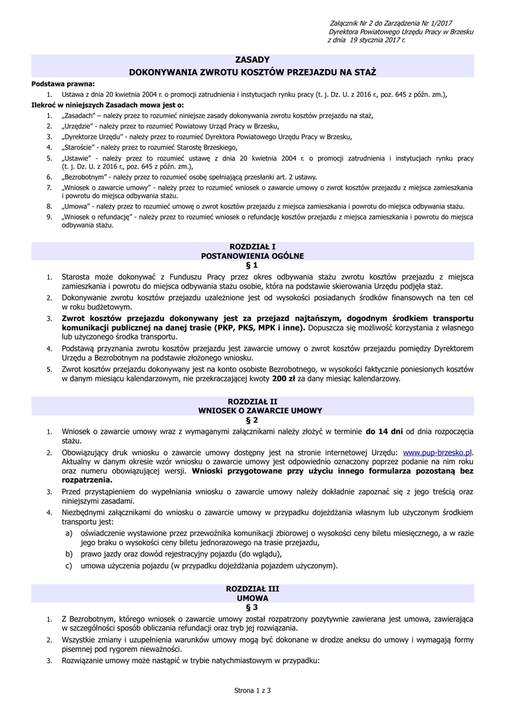 Załącznik Nr 2 do Zarządzenia Nr 1/2017 Dyrektora Powiatowego Urzędu Pracy w Brzesku z dnia 19 stycznia 2017 r. ZASADY DOKONYWANIA ZWROTU KOSZTÓW PRZEJAZDU NA STAŻ Podstawa prawna: 1. Ustawa z dnia 20 kwietnia 2004 r. o promocji zatrudnienia i instytucjach rynku pracy (t. j. Dz. U. z 2016 r., poz. 645 z późn. zm.), Ilekroć w niniejszych Zasadach mowa jest o: 1. „Zasadach" – należy przez to rozumieć niniejsze zasady dokonywania zwrotu kosztów przejazdu na staż, 2. „Urzędzie” - należy przez to rozumieć Powiatowy Urząd Pracy w Brzesku, 3. „Dyrektorze Urzędu” - należy przez to rozumieć Dyrektora Powiatowego Urzędu Pracy w Brzesku, 4. „Staroście” - należy przez to rozumieć Starostę Brzeskiego, 5. „Ustawie” - należy przez to rozumieć ustawę z dnia 20 kwietnia 2004 r. o promocji zatrudnienia i instytucjach rynku pracy (t. j. Dz. U. z 2016 r., poz. 645 z późn. zm.), 6. „Bezrobotnym” - należy przez to rozumieć osobę spełniającą przesłanki art. 2 ustawy. 7. „Wniosek o zawarcie umowy” - należy przez to rozumieć wniosek o zawarcie umowy o zwrot kosztów przejazdu z miejsca zamieszkania i powrotu do miejsca odbywania stażu. 8. „Umowa” - należy przez to rozumieć umowę o zwrot kosztów przejazdu z miejsca zamieszkania i powrotu do miejsca odbywania stażu. 9. „Wniosek o refundację” - należy przez to rozumieć wniosek o refundację kosztów przejazdu z miejsca zamieszkania i powrotu do miejsca odbywania stażu. ROZDZIAŁ I POSTANOWIENIA OGÓLNE §1 1. Starosta może dokonywać z Funduszu Pracy przez okres odbywania stażu zwrotu kosztów przejazdu z miejsca zamieszkania i powrotu do miejsca odbywania stażu osobie, która na podstawie skierowania Urzędu podjęła staż. 2. Dokonywanie zwrotu kosztów przejazdu uzależnione jest od wysokości posiadanych środków finansowych na ten cel w roku budżetowym. 3. Zwrot kosztów przejazdu dokonywany jest za przejazd najtańszym, dogodnym środkiem transportu komunikacji publicznej na danej trasie (PKP, PKS, MPK i inne). Dopuszcza się możliwość korzystania z własnego lub użyczonego środka transportu. 4. Podstawą przyznania zwrotu kosztów przejazdu jest zawarcie umowy o zwrot kosztów przejazdu pomiędzy Dyrektorem Urzędu a Bezrobotnym na podstawie złożonego wniosku. 5. Zwrot kosztów przejazdu dokonywany jest na konto osobiste Bezrobotnego, w wysokości faktycznie poniesionych kosztów w danym miesiącu kalendarzowym, nie przekraczającej kwoty 200 zł za dany miesiąc kalendarzowy. ROZDZIAŁ II WNIOSEK O ZAWARCIE UMOWY §2 1. Wniosek o zawarcie umowy wraz z wymaganymi załącznikami należy złożyć w terminie do 14 dni od dnia rozpoczęcia stażu. 2. Obowiązujący druk wniosku o zawarcie umowy dostępny jest na stronie internetowej Urzędu: www.pup-brzesko.pl. Aktualny w danym okresie wzór wniosku o zawarcie umowy jest odpowiednio oznaczony poprzez podanie na nim roku oraz numeru obowiązującej wersji. Wnioski przygotowane przy użyciu innego formularza pozostaną bez rozpatrzenia. 3. Przed przystąpieniem do wypełniania wniosku o zawarcie umowy należy dokładnie zapoznać się z jego treścią oraz niniejszymi zasadami. 4. Niezbędnymi załącznikami do wniosku o zawarcie umowy w przypadku dojeżdżania własnym lub użyczonym środkiem transportu jest: a) oświadczenie wystawione przez przewoźnika komunikacji zbiorowej o wysokości ceny biletu miesięcznego, a w razie jego braku o wysokości ceny biletu jednorazowego na trasie przejazdu, b) prawo jazdy oraz dowód rejestracyjny pojazdu (do wglądu), c) umowa użyczenia pojazdu (w przypadku dojeżdżania pojazdem użyczonym). ROZDZIAŁ III UMOWA §3 1. Z Bezrobotnym, którego wniosek o zawarcie umowy został rozpatrzony pozytywnie zawierana jest umowa, zawierająca w szczególności sposób obliczania refundacji oraz tryb jej rozwiązania. 2. Wszystkie zmiany i uzupełnienia warunków umowy mogą być dokonane w drodze aneksu do umowy i wymagają formy pisemnej pod rygorem nieważności. 3. Rozwiązanie umowy może nastąpić w trybie natychmiastowym w przypadku: Strona 1 z 3 a) niedotrzymania przez Bezrobotnego warunków umowy, b) przerwania przez Bezrobotnego z własnej winy odbywania u pracodawcy stażu, c) utraty statusu osoby bezrobotnej. 4. Wypowiedzenie umowy z przyczyn, o których mowa w ust. 3 pkt b) powoduje obowiązek zwrotu przez Bezrobotnego wypłaconych kosztów przejazdu, chyba że powodem tego przerwania było podjęcie zatrudnienia, innej pracy zarobkowej lub działalności gospodarczej. 5. Wypowiedzenie umowy z przyczyn, o których mowa w ust. 3 pkt c) powoduje obowiązek zwrotu przez Bezrobotnego wypłaconych kosztów przejazdu jeżeli przerwanie stażu nastąpiło z winy bezrobotnego. 6. Urząd może rozwiązać umowę w przypadku niewłaściwego udokumentowania poniesionych kosztów lub niezłożenia wniosku o refundację w wyznaczonym terminie. ROZDZIAŁ IV WNIOSEK O REFUNDACJĘ §4 1. Podstawą dokonania refundacji kosztów przejazdu jest comiesięczne składnie przez Bezrobotnego wniosku o refundację. Obowiązujący druk wniosku o refundację dostępny jest na stronie internetowej Urzędu: www.pup-brzesko.p. Aktualny w danym okresie wzór wniosku o refundację jest odpowiednio oznaczony poprzez podanie na nim roku oraz numeru obowiązującej wersji. Wnioski przygotowane przy użyciu innego formularza pozostaną bez rozpatrzenia. 2. Wnioski o refundację należy składać w nieprzekraczalnym terminie do 10 dnia każdego miesiąca za poprzedni miesiąc kalendarzowy. 3. W przypadku refundacji na podstawie biletu miesięcznego/innego tożsamego dokumentu do wniosku o refundację należy dołączyć bilet miesięczny lub inny tożsamy dokument. Bilet ten powinien zawierać w szczególności: 4. a) imię, nazwisko i adres osoby bezrobotnej, b) trasę przejazdu lub linię i strefę, c) miesiąc i rok na który wystawiony został bilet. W przypadku refundacji na podstawie faktury/ rachunku o