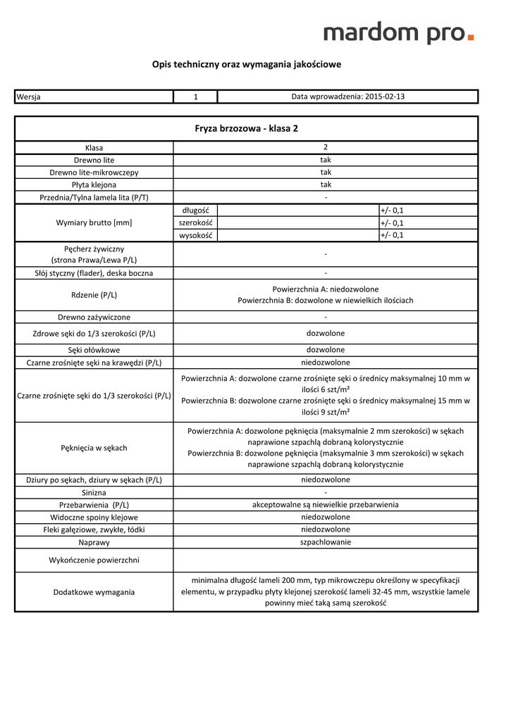 Opis techniczny oraz wymagania jakościowe Wersja 1 Data wprowadzenia: 2015-02-13 Fryza brzozowa - klasa 2 2 tak tak tak - Klasa Drewno lite Drewno lite-mikrowczepy Płyta klejona Przednia/Tylna lamela lita (P/T) Wymiary brutto [mm] długość szerokość wysokość +/- 0,1 +/- 0,1 +/- 0,1 Pęcherz żywiczny (strona Prawa/Lewa P/L) - Słój styczny (flader), deska boczna - Rdzenie (P/L) Powierzchnia A: niedozwolone Powierzchnia B: dozwolone w niewielkich ilościach Drewno zażywiczone - Zdrowe sęki do 1/3 szerokości (P/L) dozwolone Sęki ołówkowe Czarne zrośnięte sęki na krawędzi (P/L) dozwolone niedozwolone Czarne zrośnięte sęki do 1/3 szerokości (P/L) Powierzchnia A: dozwolone czarne zrośnięte sęki o średnicy maksymalnej 10 mm w ilości 6 szt/m² Powierzchnia B: dozwolone czarne zrośnięte sęki o średnicy maksymalnej 15 mm w ilości 9 szt/m² Pęknięcia w sękach Powierzchnia A: dozwolone pęknięcia (maksymalnie 2 mm szerokości) w sękach naprawione szpachlą dobraną kolorystycznie Powierzchnia B: dozwolone pęknięcia (maksymalnie 3 mm szerokości) w sękach naprawione szpachlą dobraną kolorystycznie Dziury po sękach, dziury w sękach (P/L) Sinizna Przebarwienia (P/L) Widoczne spoiny klejowe Fleki gałęziowe, zwykłe, łódki Naprawy niedozwolone akceptowalne są niewielkie przebarwienia niedozwolone niedozwolone szpachlowanie Wykończenie powierzchni Dodatkowe wymagania minimalna długość lameli 200 mm, typ mikrowczepu określony w specyfikacji elementu, w przypadku płyty klejonej szerokość lameli 32-45 mm, wszystkie lamele powinny mieć taką samą szerokość
