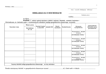 1 Kwidzyn , dnia ......................... ..................................................................... (imię i nazwisko składającego DEKLARACJA O DOCHODACH deklarację ) ................................................................... (dokładny adres) telefon........................................................ za okres .......................................................................... WAŻNE ! ( należy wpisać miesiące z jakich wpisano dochody- ostatnie 3 miesiące ) Oświadczam, że dochody moje i wymienionych członków mojego gospodarstwa domowego wyniosły: Miejsce pracy Nazwisko i imię Zatrudniony od – do Dochód brutto składki ZUS ze skł. ZUS Koszty uzyskania Dochód brutto Obciążenia wynagrodzenia potwierdzenie dochodów przez pracodawców Wynagrodzenie nie jest obciążone jest obciążone kwotą Wynagrodzenie nie jest obciążone jest obciążone kwotą Wynagrodzenie nie jest obciążone jest obciążone kwotą Wynagrodzenie nie jest obciążone jest obciążone kwotą Wynagrodzenie nie jest obciążone jest obciążone kwotą Łączny dochód całego gospodarstwa domowego za trzy miesiące Średni miesięczny dochód w gospodarstwie domowym wynosi ..................................zł, i ilość osób w lokalu ................................... 2 1. Za dochód brutto z zastrzeżeniem ust.3 , uważa się wszelkie przychody pomniejszone o koszty ich uzyskania i składki ZUS. W wypadku przychodów, od których są odliczane koszty ryczałtowe ich uzyskania , dochód ustala się po odliczeniu tych kosztów. 2. Do dochodów zalicza się w szczególności dochody z tytułu; 1. pracy, działalności gospodarczej, umów zlecenia lub o dzieło, 2. zasiłków pielęgnacyjnych, rodzinnych i wychowawczych, 3. świadczeń otrzymywanych z powodu odbywania przez członka gospodarstwa domowego służby wojskowej lub zastępczej, 4. środków za rozłąkę , 5. świadczeń wypłacanych załogom pływającym, 6. świadczeń z pomocy społecznej, 7. prowadzenia gospodarstwa rolnego, ustalane z zastosowaniem hektarów przeliczeniowych według zasad określonych w przepisach o podatku rolnym, 8. alimentów, stypendiów, emerytur i rent, w tym rent zagranicznych, 9. dywident i innych periodycznie uzyskiwanych dochodów, zwłaszcza z najmu lub dzierżawy, praw autorskich lub wykonywania wolnych zawodów oraz 10. oszacowane przez wnioskodawcę dochody z ryczałtu ewidencjonowanego i karty podatkowej. 3. Do dochodu nie wlicza się dodatków dla sierot zupełnych, zasiłków okresowych z pomocy społecznej oraz jednorazowych świadczeń w naturze z pomocy społecznej . Składana deklaracja powinna być wypełniona przez pracodawcę . Jeżeli pracodawca odmówi wypełnienia deklaracji, należy poprosić o wystawienie zaświadczenia o uzyskanych średnich dochodach za ostatnie 3 miesiące brutto( najlepiej z wyszczególnionymi składkami ZUS i kosztami uzyskania dochodów). Osoby prowadzące działalność gospodarczą do wniosku winny złożyć zaświadczenie z Urzędu Skarbowego o uzyskanych dochodach za rok ubiegły, zaświadczenie o prowadzeniu działalności gospodarczej i formie opodatkowania i zestawienie dochodów za ostanie 3 miesiące z prowadzonej działalności gospodarczej ( wystawione przez biuro rachunkowe lub kserokopię KPiR). Załączając niezbędne dokumenty należy na ich podstawie wpisać dochody do niniejszej deklaracji Składając osobiście niniejszą deklarację oświadczam, że jest mi wiadomo, że dokumenty na których podstawie zadeklarowałem(am) dochody, jestem zobowiązany(a) przechowywać przez okres 3 lat, a uprzedzony(a) o odpowiedzialności karnej z art.247 § 1 Kodeksu karnego potwierdzam własnoręcznym podpisem prawdziwość danych zamieszczonych w deklaracji . Wyrażam zgodę na przetwarzanie i przekazywanie moich danych osobowych ( z zachowaniem prawa wglądu i aktualizacji ) przez TBS sp. z o.o. w Kwidzynie w celach koniecznych do prawidłowego zarządzania i zgodnie z ustawa z 29.08.1997 r. o ochronie danych osobowych Dz.U.Nr 133 , poz.883 . ....................................................... (podpis)