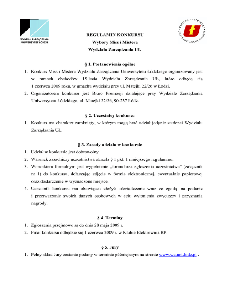 REGULAMIN KONKURSU Wybory Miss i Mistera Wydziału Zarządzania UŁ § 1. Postanowienia ogólne 1. Konkurs Miss i Mistera Wydziału Zarządzania Uniwersytetu Łódzkiego organizowany jest w ramach obchodów 15-lecia Wydziału Zarządzania UŁ, które odbędą się 1 czerwca 2009 roku, w gmachu wydziału przy ul. Matejki 22/26 w Łodzi. 2. Organizatorem konkursu jest Biuro Promocji działające przy Wydziale Zarządzania Uniwersytetu Łódzkiego, ul. Matejki 22/26, 90-237 Łódź. § 2. Uczestnicy konkursu 1. Konkurs ma charakter zamknięty, w którym mogą brać udział jedynie studenci Wydziału Zarządzania UŁ. § 3. Zasady udziału w konkursie 1. Udział w konkursie jest dobrowolny. 2. Warunek zasadniczy uczestnictwa określa § 1 pkt. 1 niniejszego regulaminu. 3. Warunkiem formalnym jest wypełnienie „formularza zgłoszenia uczestnictwa” (załącznik nr 1) do konkursu, dołączając zdjęcie w formie elektronicznej, ewentualnie papierowej oraz dostarczenie w wyznaczone miejsce. 4. Uczestnik konkursu ma obowiązek złożyć oświadczenie wraz ze zgodą na podanie i przetwarzanie swoich danych osobowych w celu wyłonienia zwycięzcy i przyznania nagrody. § 4. Terminy 1. Zgłoszenia przejmowe są do dnia 28 maja 2009 r. 2. Finał konkursu odbędzie się 1 czerwca 2009 r. w Klubie Elektrownia RP. § 5. Jury 1. Pełny skład Jury zostanie podany w terminie późniejszym na stronie www.wz.uni.lodz.pl . § 6. Nagrody 1. Miss Wydziału Zarządzania UŁ: korona, szarfa, nagrody ufundowane przez sponsorów. 2. Mister Wydziału Zarządzania UŁ: korona, szarfa, nagrody ufundowane przez sponsorów. 3. Fundatorzy nagród ponoszą odpowiedzialność za ich wręczenie. § 7. Postanowienia końcowe 1. Organizator zastrzega sobie prawo do przerwania, zmiany lub odwołania konkursu z przyczyn od niego niezależnych, oraz bez podawania przyczyny. 2. Osoby niespełniające wymogów określonych w niniejszym Regulaminie nie będą brane pod uwagę. 3. Zgłoszenie do konkursu jest równoważne z akceptację niniejszego Regulaminu. 4. Wszelkich dodatkowych informacji udziela Biuro Promocji Wydziału Zarządzania UŁ. Załącznik nr 1. Formularz zgłoszenia uczestnictwa.
