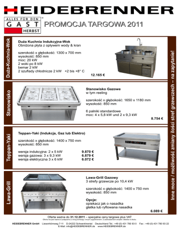 szerokość x głębokość: 1300 x 700 mm wysokość: 850 mm moc: 20 kW 2 woki po 8 kW bemar 2 kW 2 szuflady chłodnicze 2 kW +2 bis +8° C 12.165 € Stanowisko Gazowe w tym reeling szerokość x głębokość: 1650 x 1180 mm wysokość: 850 mm 6 palniki standardowe moc: 4 x 5,8 kW und 2 x 9,3 kW Teppan-Yaki (Indukcja, Gaz lub Elektro) szerokość x głębokość: 1400 x 750 mm wysokość: 850 mm wersja indukcyjna: 2 x 5 kW wersja gazowa: 3 x 9,3 kW wersja elektryczna 3 x 6 kW 9.870 € 6.879 € 6.072 € Lawa-Grill Gazowy 3 strefy grzewcze po 10,4 kW Lawa-Grill Teppan-Yaki 8.754 € szerokość x głębokość: 1400 x 750 mm wysokość: 850 mm Opcje: opiekacz jak o nasadka głatka lub ryflowana nasadka 6.089 € Oferta ważna do 31.12.2011 – specjalne ceny targowe plus VAT Oferta nie jest ważna w połączeniu z inną promocją / innym uzgodnieniem. Z zastrzeżeniem omyłek i błedów w druku. HEIDEBRENNER GmbH Liesenhörnweg 7-11 D-24222 Schwentinental Deutschland Tel.: +49 (0) 431 780 93 0 E-Mail: [email protected] www.HEIDEBRENNER.de Fax : +49 (0) 431 780 93 22 Inne moce / możliwość zmiany ilości stref grzewczech – na zapytanie! Duża Kuchnia Indukcyjna-Wok Obniżona płyta z opływem wody & kran Stanowisko Duża-Kuchnia-Wok PROMOCJA TARGOWA 2011