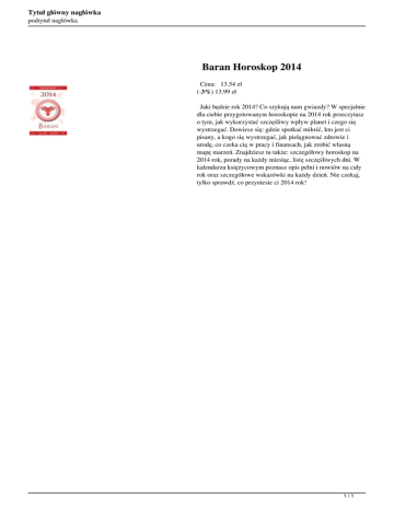 Tytuł główny nagłówka podtytuł nagłówka Baran Horoskop 2014 Cena: 13.54 zł (-3%) 13.99 zł Jaki będzie rok 2014? Co szykują nam gwiazdy? W specjalnie dla ciebie przygotowanym horoskopie na 2014 rok przeczytasz o tym, jak wykorzystać szczęśliwy wpływ planet i czego się wystrzegać. Dowiesz się: gdzie spotkać miłość, kto jest ci pisany, a kogo się wystrzegać, jak pielęgnować zdrowie i urodę, co czeka cię w pracy i finansach, jak zrobić własną mapę marzeń. Znajdziesz tu także: szczegółowy horoskop na 2014 rok, porady na każdy miesiąc, listę szczęśliwych dni. W kalendarzu księżycowym poznasz opis pełni i nowiów na cały rok oraz szczegółowe wskazówki na każdy dzień. Nie czekaj, tylko sprawdź, co przyniesie ci 2014 rok! 1/1 Powered by TCPDF (www.tcpdf.org)