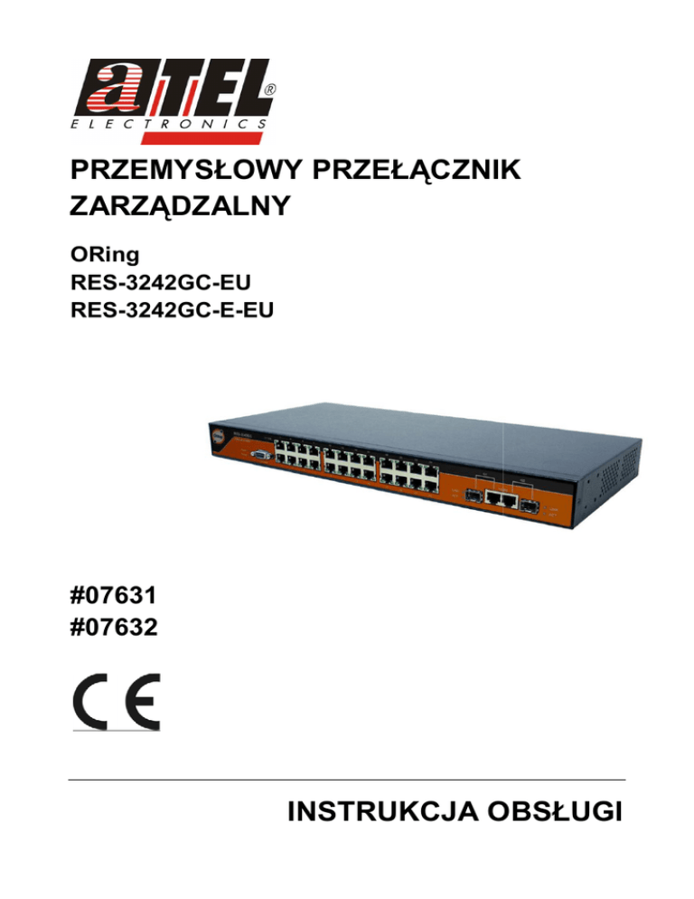 PRZEMYSŁOWY PRZEŁĄCZNIK ZARZĄDZALNY ORing RES-3242GC-EU RES-3242GC-E-EU #07631 #07632 Nie moŜna wy świetlić obrazu. Na k omputerze moŜe brak ować pamięci do otwarcia obrazu lub obraz moŜe by ć uszk odzony . Uruchom ponownie k omputer, a następnie otwórz plik ponownie. Jeśli czerwony znak x nadal będzie wy świetlany , k onieczne moŜe by ć usunięcie obrazu, a następnie ponowne wstawienie go. INSTRUKCJA NSTRUKCJA OBSŁUGI RES-3242GC(-E) wersja 1.0 SPIS TREŚCI Wstęp ...................................................................................................................................... 3 Właściwości ............................................................................................................................. 3 Bezpieczeństwo uŜytkowania .................................................................................................. 3 1. Zawartość opakowania ........................................................................................................ 4 2. Zasady bezpieczeństwa ...................................................................................................... 4 3. Budowa urządzenia ............................................................................................................. 5 3.1 Zasilanie ........................................................................................................................ 5 3.2 Panele urządzenia ......................................................................................................... 5 4. Instalacja ............................................................................................................................. 7 4.1 MontaŜ urządzenia ............................................................................................................ 7 4.2 Podłączenie urządzenia ................................................................................................. 7 5. Konfiguracja ........................................................................................................................ 8 6. Opcje zarządzania ............................................................................................................... 9 7. Konserwacja ........................................................................................................................ 9 8. Składowanie zuŜytego sprzętu........................................................................................... 10 9. Parametry techniczne ........................................................................................................ 11 2 RES-3242GC(-E) Wstęp Seria przełączników niezarządzanych RES-3242GC-EU została stworzona do zastosowania w przemysłowych sieciach Ethernet, a zwłaszcza do urządzeń pracujących w cięŜkich warunkach, toleruje szeroki zakres temperatur, zawiera ochronę przepięciową. Urządzenia umoŜliwiają ciągłą pracę dzięki moŜliwości podłączenia 2 niezaleŜnych źródeł zasilania. Szybki przepływ informacji o awarii pozwala zdiagnozować i naprawić usterkę, Przełączniki z serii RES-3242GC to najlepszy wybór do pracy np. w fabrykach, telekomunikacji, transporcie i tam gdzie potrzebna jest najwyŜsza ochrona danych wraŜliwych, które wymagają niezawodnego i bezpiecznego połączenia Ethernet. Właściwości Praca w 24x10/100Base-T(X) i 2xporty Gigabit Technologia redundantne Open-Ring SNMP v1/v2c/v3, serwer http, telnet- obsługa serwera Powiadomienia przez Syslog, e-mail i pułapek SNMP Wsparcie dla protokołu STP, RSTP, MSTP, IGNP filtrowanie i zarządzanie grupami multicastowymi Łatwe zarządzanie i ustawienie portu na Trunk Konfiguracja przez Web-based i narzędzi Windows(Open-Vision) Praca w temperaturze -10÷60°C; i -40÷70°C dla wersji E 19” rack Podwójne wejście zasilania DC; Obsługa protokołu LLDP Bezpieczeństwo uŜytkowania Urządzenie zostało zaprojektowane i wyprodukowane z najwyŜszą starannością o bezpieczeństwo osób instalujących i uŜytkujących. Dla zapewnienia bezpieczeństwa pracy, naleŜy stosować się do wszelkich wskazań zawartych w tej instrukcji jak i instrukcjach obsługi urządzeń towarzyszących (np. komputera PC). Przed przystąpieniem do instalacji urządzenia naleŜy dokładnie przeczytać całość tej instrukcji, w szczególności zaś punkty poświęcone bezpieczeństwu. NaleŜy zapewnić bezpieczne warunki pracy urządzenia (np. uŜywać tylko ekranowanych przewodów do połączenia z komputerem lub innym urządzeniem peryferyjnym). Dokonanie przez uŜytkownika jakichkolwiek własnych zmian w urządzeniu moŜe spowodować utratę moŜliwości jego legalnego uŜytkowania. Urządzenie zostało poddane obowiązkowej ocenie zgodności i spełnia zasadnicze wymagania zawarte w europejskich Dyrektywach Nowego Podejścia. Produkt jest oznakowany znakiem CE. 3 RES-3242GC(-E) 1. Zawartość opakowania Przełącznik RES-3242GC-EU zestaw montaŜowy, płyta CD, skrócona instrukcja obsługi w języku angielskim, niniejsza instrukcja obsługi. Podczas dostawy naleŜy upewnić się, Ŝe opakowanie nie jest uszkodzone. W przypadku stwierdzonych uszkodzeń naleŜy niezwłocznie skontaktować się z dostawcą. Prosimy równieŜ o sprawdzenie zgodności zawartości opakowania z powyŜej zamieszczoną listą. 2. Zasady bezpieczeństwa Urządzenie jest zgodne z przepisami w zakresie bezpieczeństwa uŜytkowania urządzeń elektrycznych. NaleŜy przestrzegać następujących zaleceń: − − − − − − − − − gniazdo sieciowe musi być uziemione zgodnie z obowiązującymi przepisami, przed przeniesieniem lub wykonywaniem innych operacji technicznych urządzenie naleŜy odłączyć od zasilania, nie stosować uszkodzonych lub zuŜytych przewodów zasilania, gdyŜ powodują one znaczne zagroŜenie dla bezpieczeństwa uŜytkownika, prace instalacyjne muszą być wykonywane przez odpowiednio przeszkolony personel techniczny, nie stoso