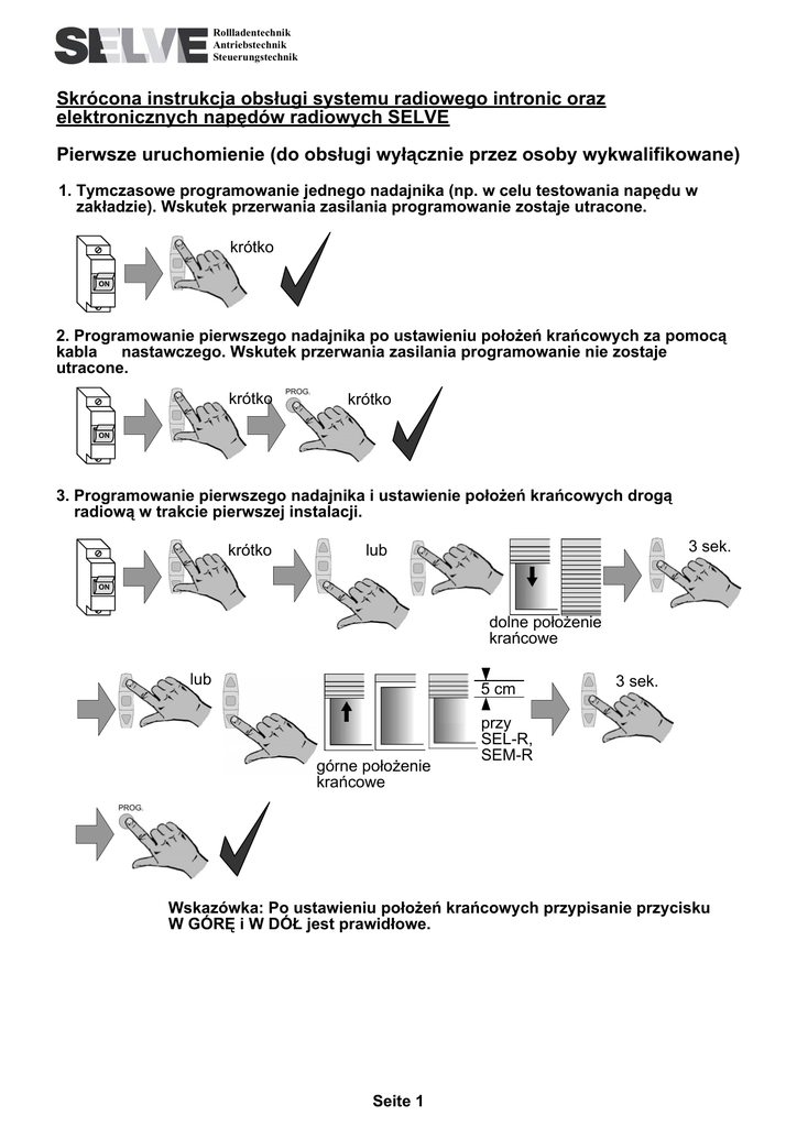 Rollladentechnik Antriebstechnik Steuerungstechnik Backenecker / PM Lüdenscheid, 25.07.2003 Seite: 1 von 1 Skrócona instrukcja obsługi systemu radiowego intronic oraz elektronicznych napędów radiowych SELVE Pierwsze uruchomienie (do obsługi wyłącznie przez osoby wykwalifikowane) 1. Tymczasowe programowanie jednego nadajnika (np. w celu testowania napędu w zakładzie). Wskutek przerwania zasilania programowanie zostaje utracone. krótko ON 2. Programowanie pierwszego nadajnika po ustawieniu położeń krańcowych za pomocą kabla nastawczego. Wskutek przerwania zasilania programowanie nie zostaje utracone. krótko krótko ON 3. Programowanie pierwszego nadajnika i ustawienie położeń krańcowych drogą radiową w trakcie pierwszej instalacji. krótko 3 sek. lub ON dolne położenie krańcowe lub 5 cm górne położenie krańcowe 3 sek. przy SEL-R, SEM-R Wskazówka: Po ustawieniu położeń krańcowych przypisanie przycisku W GÓRĘ i W DÓŁ jest prawidłowe. Seite 1 Rollladentechnik Antriebstechnik Steuerungstechnik Backenecker / PM Lüdenscheid, 25.07.2003 Seite: 1 von 1 Skrócona instrukcja obsługi systemu radiowego intronic oraz elektronicznych napędów radiowych SELVE Funkcje użytkownika 4. Programowanie dodatkowego nadajnika (konieczny jest jeden zaprogramowany). zaprogramowany nadajnik dodatkowy nadajnik 3 sek. kurz 5. Kasowanie nadajnika (konieczne są co najmniej dwa zaprogramowane nadajniki). zaprogramowany nadajnik nadajnik 3 sek. krótko 6. Ustawianie pozycji pośredniej. >3 sek. zwolnienie przycisku zapisuje pozycję w pamięci przycisnąć i przytrzymać 7. Ustawianie pozycji wentylacji / obrotu (nie występuje w przypadku elektronicznych napędów radiowych SELVE). >3 sek. zwolnienie przycisku zapisuje pozycję w pamięci przycisnąć i przytrzymać Seite 2 Rollladentechnik Antriebstechnik Steuerungstechnik Backenecker / PM Lüdenscheid, 25.07.2003 Seite: 1 von 1 Skrócona instrukcja obsługi systemu radiowego intronic oraz elektronicznych napędów radiowych SELVE Tryb serwisowy (do obsługi wyłącznie przez osoby wykwalifikowane) Wskazówka: Aby możliwe było dokonanie wszystkich kolejnych ustawień, jeden nadajnik musi być zaprogramowany za stałe. Przez 4 minuty napęd znajduje się w trybie serwisowym. Aby wyprowadzić napęd z trybu serwisowego (np. 3 napędy na jednym bezpieczniku) należy go uruchomić. 8. W przypadku zagubienia lub uszkodzenia nadajnika należy zaprogramować nowy nadajnik. Wszystkie inne nadajniki zostają skasowane z pamięci odbiornika. 3 sek. 3 sek. 3 sek. OFF OFF ON nowy nadajnik 3 sek. ON 9. Ponownie ustawić położenia krańcowe. 3 sek. 3 sek. 3 sek. OFF OFF ON 6 sek. ON 3 sek. lub dolne położenie krańcowe lub 5 cm górne położenie krańcowe 3 sek. przy SEL-R, SEM-R Hinweis: Nach der Einstellung der Endpunkte ist die Zuordnung der AUF- und AB-Taste richtig. 10. Przywrócić ustawienia fabryczne napędu. 3 Sek. 3 Sek. 3 Sek. 9 sek. OFF ON OFF ON Seite 3 Rollladentechnik Antriebstechnik Steuerungstechnik Backenecker / PM Lüdenscheid, 25.07.2003 Seite: 1 von 1 Skrócona instrukcja obsługi systemu radiowego intronic oraz elektronicznych napędów radiowych SELVE Tryb serwisowy (do obsługi wyłącznie przez osoby wykwalifikowane) 11. Podział na grupy. To ustawienie pozwala podzielić istniejącą grupę, obsługiwaną za pomocą jednego kanału nadawania, na kilka grup / kilka kanałów nadawania. okno 1 Przedtem: okno 2 okno 3 nadajnik Podział na grupy: 3 sek. 3 sek. 3 sek. OFF OFF ON okno 1 ON okno 2 3 sek. nadajnik 1 Potem: 9 sek. okno 1 nadajnik 1 okno 3 3 sek. 3 sek. nadajnik 2 nadajnik 3 okno 2 okno 3 nadajnik 2 Seite 4 nadajnik 3 W ciągu 2 minut każdy napęd porusza się "przypadkowo” przez 3 sekundy. W tym czasie napęd należy zatrzymać za pomocą odpowiedniego nadajnika.