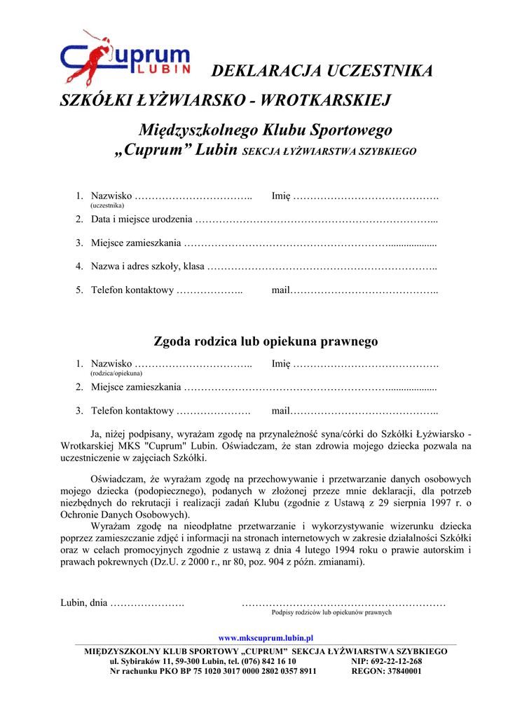 DEKLARACJA UCZESTNIKA SZKÓŁKI ŁYŻWIARSKO - WROTKARSKIEJ Międzyszkolnego Klubu Sportowego „Cuprum” Lubin SEKCJA ŁYŻWIARSTWA SZYBKIEGO 1. Nazwisko …………………………….. Imię ……………………………………. (uczestnika) 2. Data i miejsce urodzenia ……………………………………………………………... 3. Miejsce zamieszkania ……………………………………………………................... 4. Nazwa i adres szkoły, klasa ………………………………………………………….. 5. Telefon kontaktowy ……………….. mail…………………………………….. Zgoda rodzica lub opiekuna prawnego 1. Nazwisko …………………………….. Imię ……………………………………. (rodzica/opiekuna) 2. Miejsce zamieszkania ……………………………………………………................... 3. Telefon kontaktowy …………………. mail…………………………………….. Ja, niżej podpisany, wyrażam zgodę na przynależność syna/córki do Szkółki Łyżwiarsko Wrotkarskiej MKS "Cuprum" Lubin. Oświadczam, że stan zdrowia mojego dziecka pozwala na uczestniczenie w zajęciach Szkółki. Oświadczam, że wyrażam zgodę na przechowywanie i przetwarzanie danych osobowych mojego dziecka (podopiecznego), podanych w złożonej przeze mnie deklaracji, dla potrzeb niezbędnych do rekrutacji i realizacji zadań Klubu (zgodnie z Ustawą z 29 sierpnia 1997 r. o Ochronie Danych Osobowych). Wyrażam zgodę na nieodpłatne przetwarzanie i wykorzystywanie wizerunku dziecka poprzez zamieszczanie zdjęć i informacji na stronach internetowych w zakresie działalności Szkółki oraz w celach promocyjnych zgodnie z ustawą z dnia 4 lutego 1994 roku o prawie autorskim i prawach pokrewnych (Dz.U. z 2000 r., nr 80, poz. 904 z późn. zmianami). Lubin, dnia …………………. …………………………………………………… Podpisy rodziców lub opiekunów prawnych www.mkscuprum.lubin.pl ------------------------------------------------------------------------------------------------------------------------------------------------------------------------------------------------------------------------------------------------------------------------------------------------------------------------------------------------ MIĘDZYSZKOLNY KLUB SPORTOWY „CUPRUM” SEKCJA ŁYŻWIARSTWA SZYBKIEGO ul. Sybiraków 11, 59-300 Lubin, tel. (076) 842 16 10 NIP: 692-22-12-268 Nr rachunku PKO BP 75 1020 3017 0000 2802 0357 8911 REGON: 37840001 Regulamin Szkółki Łyżwiarsko - Wrotkarskiej W zajęciach Szkółki mogą uczestniczyć dzieci z klas III - VI szkoły podstawowej. Młodsze dzieci mogą uczestniczyć w zajęciach po zakwalifikowaniu przez trenera (decydują umiejętności jazdy na rolkach i łyżwach). Celem prowadzonych zajęć jest nauka i doskonalenie umiejętności z łyżwiarstwa, rozwój psychomotoryczny uczestników oraz upowszechnianie łyżwiarstwa w środowisku lokalnym. Zajęcia sportowe prowadzone są nieodpłatnie. 2. Każdy uczestnik Szkółki zobowiązany jest do posiadania: kasku ochronnego, ochraniaczy na kolana, łokcie i nadgarstki w przypadku zajęć na rolkach, kasku ochronnego i rękawiczek w przypadku zajęć na lodowisku. Na zajęciach obowiązuje strój sportowy, a kask musi być dopasowany tak, aby pełnił rolę ochronną. 3. Uczestnicy Szkółki ćwiczą w grupie i dniu wskazanym przez instruktora. Punktualnie rozpoczynają zajęcia. 4. Stawienie się dziecka na zajęciach sportowych jest równoznaczne z potwierdzeniem braku przeciwwskazań do uczestnictwa w nich. Obowiązkiem uczestnika zajęć jest informowanie instruktora o swojej każdorazowej niedyspozycji, pogorszeniu samopoczucia w trakcie ich trwania oraz innych ograniczeniach uniemożliwiających wykonywanie ćwiczeń. 5. Uczestnicy Szkółki są zobowiązani do wypełnienia Deklaracji Uczestnika Szkółki Łyżwiarsko Wrotkarskiej, przestrzegania Regulaminu Szkółki i Regulaminu Lodowiska oraz stosowania się do poleceń instruktora. Prowadzący zastrzegają sobie prawo do usunięcia z zajęć uczestników niestosujących się do regulaminu lub poleceń. 6. W zajęciach może uczestniczyć maksymalnie 40 osób na tafli lodowiska oraz 10-15 osób na torze. Prowadzący zastrzegają sobie prawo do zmiany liczby uczestników zajęć. 7. Instruktorzy prowadzą Szkółkę zgodnie ze swoją najlepszą wiedzą i doświadczeniem. Wszelkie upadki i wypadki uczestników są ryzykiem, które wiąże się z nauką jazdy na rolkach i łyżwach. Prowadzący nie biorą odpowiedzialności za ewentualne skutki tych wypadków. O wszelkich wypadkach należy powiadomić prowadzących zajęcia. Uczestnicy zajęć Szkółki Łyżwiarsko Wrotkarskiej muszą być ubezpieczeni od następstw nieszczęśliwych wypadków we własnym zakresie. 8. Prowadzący zajęcia nie ponoszą odpowiedzialności za szkody związane z uszkodzeniem lub kradzieżą osobistego wyposażenia uczestnika zajęć używanego na zajęciach sportowych w czasie ich trwania oraz bezpośrednio przed i po nich. 9. Za bezpieczeństwo w drodze na zajęcia, powrót po zajęciach oraz przygotowanie do wejścia uczestnika na tor wrotkarski i lodowisko odpowiadają rodzice. 10. Uczestnicy Szkółki mogą jednocześnie dobrowolnie zostać członkami klubu MKS Cuprum Lubin. Z członkostwem klubu wiąże się przywilej pierwszeństwa wstępu na zajęcia Szkółki oraz upominek na zakończenie sezonu łyżwiarskiego. Członkowie klubu opłacają miesięczną składkę w wysokości 10 złotych. 1. Kaski nie są ozdobą! Służą do zapewnienia bezpieczeństwa Dzieciom! ……………………………… …………………………………….. Data i podpis uczestnika Data i podpis rodzica/opiekuna www.mkscuprum.lubin.pl ------------------------------------------------------------------------------------------------------------------------------------