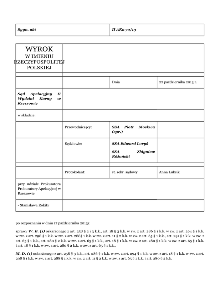 Sygn. akt II AKa 70/13 WYROK W IMIENIU RZECZYPOSPOLITEJ POLSKIEJ Dnia Sąd Apelacyjny Wydział Karny Rzeszowie 22 października 2013 r. II w w składzie: Przewodniczący: SSA Piotr (spr.) Sędziowie: SSA Edward Loryś SSA Różański Protokolant: Moskwa Zbigniew st. sekr. sądowy Anna Łuksik przy udziale Prokuratora Prokuratury Apelacyjnej w Rzeszowie - Stanisława Rokity po rozpoznaniu w dniu 17 października 2013r. sprawy W. B. (1) oskarżonego z art. 258 § 2 i 3 k.k., art. 18 § 3 k.k. w zw. z art. 286 § 1 k.k. w zw. z art. 294 § 1 k.k. w zw. z art. 298 § 1 k.k. w zw. z art. 288§ 1 k.k. w zw. z art. 11 § 2 k.k. w zw. z art. 65 § 1 k.k., art. 291 § 1 k.k. w zw. z art. 65 § 1 k.k., art. 280 § 2 k.k. w zw. z art. 65 § 1 k.k., art. 18 § 1 k.k. w zw. z art. 280 § 1 k.k. w zw. z art. 65 § 1 k.k. i art. 18 § 1 k.k. w zw. z art. 280 § 2 k.k. w zw. z art. 65 § 1 k.k., M. D. (1) oskarżonego z art. 258 § 3 k.k., art. 286 § 1 k.k. w zw. z art. 294 § 1 k.k. w zw. z art. 18 § 1 k.k. w zw. z art. 298 § 1 k.k. w zw. z art. 288 § 1 k.k. w zw. z art. 11 § 2 k.k. w zw. z art. 65 § 1 k.k. i art. 280 § 2 k.k. w zw. z art. 65 § 1 k.k., T. K. (1) oskarżonego art. 258 § 2 k.k., art. 18 § 3 k.k. w zw. z art. 286 § 1 k.k. w zw. z art. 294 § 1 k.k. w zw. z art. 298 § 1 k.k. w zw. z art. 288 § 1 k.k. w zw. z art. 11 § 2 k.k. w zw. z art.65 § 1 k.k. i art. 280 § 2 k.k. w zw. z art. 65 § 1 k.k., J. P. (1) oskarżonego z art. 258 § 2 k.k., art. 280 § 2 k.k. w zw. z art. 65 § 1 k.k., art. 18 § k.k. w zw. z art. 280 § 1 k.k. w zw. z art. 65 § 1 k.k., art. 280 § 2 k.k. w zw. z art. 65 § 1 k.k., A. P. oskarżonego z art. 258 § 1 k.k., art. 280 § 1 k.k. w zw. z art. 65 § 1 k.k., M. R. (1) oskarżonego z art. 258 § 2 k.k. i art. 280 § 2 k.k. w zw. z art. 65 § 1 k.k. na skutek apelacji wniesionych przez prokuratora Prokuratury Okręgowej w Tarnobrzegu w stosunku do oskarżonych W. B. (1), M. D. (1), T. K. (1), A. P. i M. R. (1) i obrońców oskarżonych W. B. (1), M. D. (1), J. P. (1), A. P. i M. R. (1) od wyroku Sądu Okręgowego w Tarnobrzegu z dnia 27 lutego 2013r., sygn. akt II K 21/12 I. z m i e n i a zaskarżony wyrok w ten sposób że: 1. uchyla orzeczenia o karach łącznych wymierzonych W. B. (1), M. D. (1), T. K. (1), J. P. (1), oparte na przepisach art. 85 i art. 86 § 1 i 2 k.k. oraz o zaliczeniu na poczet kar łącznych pozbawienia wolności okresów rzeczywistego pozbawienia wolności w sprawie, a także o opłatach wymierzonych tym oskarżonym, 2. odnośnie W. B. (1); a/ obniża wymiar kary pozbawienia wolności orzeczonej za czyn przypisany w pkt I. 4 do 7 (siedmiu) lat, b/ w zakresie czynu przypisanego temu oskarżonemu w pkt I.6 przyjmuje, że posługiwał się on przedmiotem odpowiadającym wyglądem broni palnej i uznaje go winnym popełnienia przestępstwa z art. 280 § 1 k.k. w zw. z art. 65 § 1 k.k. i za to na podstawie tych przepisów oraz art. 33 § 2 i 3 k.k. skazuje go na karę 6 (sześciu) lat pozbawienia wolności i karę grzywny w wysokości 300 (trzystu) stawek dziennych, ustalając wysokość jednej stawki na kwotę 45 (czterdziestu pięciu) złotych, c/ na podstawie art. 85 i art. 86 § 1 i 2 k.k. orzeczone w stosunku do W. B. (1) kary pozbawienia wolności i kary grzywny łączy i wymierza mu karę łączną 11 (jedenastu) lat pozbawienia wolności i karę łączną grzywny w wysokości 500 (pięciuset) stawek dziennych, ustalając wysokość jednej stawki dziennej na kwotę 45 (czterdziestu pięciu) złotych, d/ na podstawie art. 63 § 1 k.k. zalicza W. B. (1) na poczet orzeczonej kary łącznej pozbawienia wolności okres rzeczywistego pozbawienia wolności w sprawie od dnia 16 sierpnia 2011 r. do dnia 22 października 2013 r., 3. odnośnie M. D. (1); a/ w zakresie czynu przypisanego w pkt II.1 przyjmuje, że grupa którą kierował miała charakter zbrojny, b/ w zakresie czynu przypisanego w pkt II.3 przyjmuje, iż wyczerpuje on znamiona przestępstwa z art. 280 § 2 k.k. w zw. z art. 65 § 1 k.k. i przepisy te przyjmuje jako podstawę wymiaru kary, c/ w zakresie czynu przypisanego w pkt II. 4 przyjmuje, że W. B. (1) posługiwał się przedmiotem odpowiadającym wyglądem broni palnej i obniża wymiar kary pozbawienia wolności za to przestępstwo do 6 (sześciu) lat, c/ na podstawie art. 85 i art. 86 § 1 i 2 k.k. orzeczone w stosunku do M. D. (1) kary pozbawienia wolności i kary grzywny łączy i wymierza mu karę łączną 8 (ośmiu) lat pozbawienia wolności i karę łączną grzywny w wysokości 600 (sześciuset) stawek dziennych, ustalając wysokość jednej stawki dziennej na kwotę 55 (pięćdziesięciu pięciu) złotych, d/ na podstawie art. 63 § 1 k.k. zalicza M. D. (1) na poczet orzeczonej kary łącznej pozbawienia wolności okres rzeczywistego pozbawienia wolności w sprawie od dnia 8 września 2011 r. do dnia 22 października 2013 r., 4. odnośnie T. K. (1); a/ w zakresie czynu przypisanego w pkt III. 5 przyjmuje, że W. B. (1) posługiwał się przedmiotem odpowiadającym wyglądem broni palnej i uznaje go winnym popełnienia przestępstwa z art. 280 § 1 k.k. w zw. z art. 65 § 1 k.k. i za to na podstawie art. 280 § 1 k.k. przy zastosowaniu art. 60 § 3 k.k. i art. 60 § 6 pkt 3 k.k. skazuje go na karę 1 (jednego) roku i 4 (czterech) miesięcy pozbawienia wolności, a na podstawie art. 33 § 2 i 3 k.k. na karę grzywny w wymiarze 150 (stu pięćdziesięciu) stawek dziennych, ustalając wysokość jednej stawki na kwotę 35 (trzydziestu pięciu) złotych, b/ na podstawie art. 85 k.k. i art. 86 § 1 i 2 k.k. orzeczone w stosunku do T. K. (1) kary pozbawienia wolności i kary grzywny łączy i wymierza mu karę łączną 2 (dwóch) lat pozbawienia wolności i karę łączną grzywny w wysokości 250 (dwustu pięćdziesięciu) stawek dziennych, ustalając wysokość jednej stawki dziennej na kwotę 35 (trzydziestu pięciu) złotych, c/ na podstawie art. 63 § 1 k.k. zalicza T. K. (1) na poczet orzeczonej kary łąc