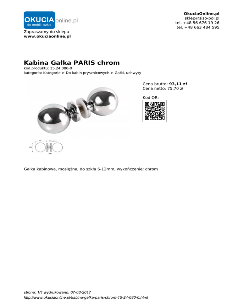 OkuciaOnline.pl [email protected] tel. +48 56 676 19 26 tel. +48 663 484 595 Zapraszamy do sklepu www.okuciaonline.pl Kabina Gałka PARIS chrom kod produktu: 15.24.080-0 kategoria: Kategorie > Do kabin prysznicowych > Gałki, uchwyty Cena brutto: 93,11 zł Cena netto: 75,70 zł Kod QR: Gałka kabinowa, mosiężna, do szkła 6-12mm, wykończenie: chrom strona: 1/1 wydrukowano: 07-03-2017 http://www.okuciaonline.pl/kabina-galka-paris-chrom-15-24-080-0.html