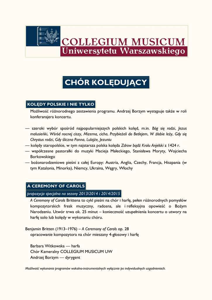 CHÓR KOLĘDUJĄCY KOLĘDY POLSKIE I NIE TYLKO Możliwość różnorodnego zestawienia programu. Andrzej Borzym występuje także w roli konferansjera koncertu. — szeroki wybór spośród najpopularniejszych polskich kolęd, m.in. Bóg się rodzi, Jezus malusieńki, Wśród nocnej ciszy, Mizerna, cicha, Przybieżeli do Betlejem, W żłobie leży, Gdy się Chrystus rodzi, Gdy śliczna Panna, Lulajże, Jezuniu — kolędy staropolskie, w tym najstarsza polska kolęda Zdrow bądź Krolu Anjelski z 1424 r. — współczesne pastorałki do muzyki Macieja Małeckiego, Stanisława Moryty, Wojciecha Borkowskiego — bożonarodzeniowe pieśni z całej Europy: Austria, Anglia, Czechy, Francja, Hiszpania (w tym Katalonia, Minorka), Niemcy, Ukraina, Węgry, Włochy A CEREMONY OF CAROLS propozycja specjalna na sezony 2013/2014 i 2014/2015 A Ceremony of Carols Brittena to cykl pieśni na chór i harfę, pełen różnorodnych pomysłów kompozytorskich fresk muzyczny, radosna, ale i refleksyjna opowieść o Bożym Narodzeniu. Utwór trwa ok. 25 minut – konieczność uzupełnienia koncertu o utwory na harfę solo lub kolędy w wykonaniu chóru. Benjamin Britten (1913–1976) – A Ceremony of Carols op. 28 opracowanie kompozytora na chór mieszany 4-głosowy i harfę Barbara Witkowska — harfa Chór Kameralny COLLEGIUM MUSICUM UW Andrzej Borzym — dyrygent Możliwość wykonania programów wokalno-instrumentalnych wyłącznie po indywidualnych uzgodnieniach.