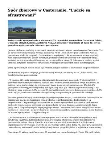 Spór zbiorowy w Castoramie. "Ludzie są sfrustrowani" Podwyższenie wynagrodzenia o minimum 4,5% to postulat pracowników Castorama Polska, w imieniu których Komisja Zakładowa NSZZ „Solidarność” rozpoczęła 29 lipca 2015 roku procedurę wejścia w spór zbiorowy z pracodawcą. Jeszcze niedawno pisaliśmy o sukcesach założono rok temu związku zawodowego w Castoramie. Tuż po zarejestrowaniu pomiędzy Komisją Zakładową NSZZ „Solidarność” przy Castorama Polska a pracodawcą udało się podpisać „Porozumienia o współpracy”. W porozumieniu strony uzgodniły m.in. organizowanie tzw. godzin otwartych, podczas których związkowcy z "Solidarności" mogą spotykać się z pracownikami Castoramy na terenie zakładu pracy. W dokumencie znalazły się też ustalenia dotyczące możliwości wywieszania w sklepach związkowych tablic informacyjnych. Jedną z poruszonych kwestii miało być również podjęcie rozmów o podwyżkach dla pracowników. Jak tłumaczy Wojciech Kasprzyk, przewodniczący Komisji Zakładowej NSZZ „Solidarność”, nie doszło jednak do porozumienia. – W grudniu 2014 roku pracodawca obiecał usiąść do negocjacji płacowych. W styczniu 2015 r. ponownie wezwaliśmy pracodawcę. Podczas serii rozmów przedstawiał nam swoje możliwości, za każdym razem podkreślając, że proponowany przez niego wzrost wynagrodzeń z 2% do 3,2% podwyżki uznaniowej jest maksymalny. Nie zgadzamy się z tym – tłumaczy przewodniczący. - My obstajemy przy minimum 4,5%, z czego 3% podwyżki miałoby dotyczyć każdego pracownika, a 1,5% miało być przyznawane uznaniowo dla najbardziej zaangażowanych pracowników – dodaje. Jak mówi przewodniczący zespołu negocjacyjnego Bogusław Wojtas, z dokumentów firmy wynika, że pracodawcę stać na podwyższenie wynagrodzeń, a jego tłumaczenia o braku środków są bezpodstawne. - Argumentując brak środków na wzrost wynagrodzeń pracodawca każdorazowo podkreśla że pracownicy otrzymują tzw. premię turbo (premia dla pracowników od zysku firmyprzyp. red.). Na prośbę zespołu negocjacyjnego zarząd Castorama Polska miał zweryfikować swoje możliwości i to uczynił , ale zweryfikował je, nie do swoich zysków a założonego przez siebie budżetu na wzrost wynagrodzeń ! – wyjaśnia Wojtas. - Jeśli rozmowy nie przyniosą oczekiwanego przez nas skutku to nie wykluczamy podjęcia akcji strajkowej. Frustracja ludzi jest bardzo duża i w związku z tym coraz więcej doświadczonych pracowników ucieka z firmy. Ponadto pracodawca w ostatnich komunikatach próbuje naszą organizację obarczyć winą za wszystko co złe, tworząc wokół siebie dobry PR. Dlatego w najbliższym czasie chcemy zawiadomić o zaistniałej sytuacji zarząd grupy Kingfisher – wyjaśnia przewodniczący. Obecnie na 72 sklepy sieci Castorama, 25 placówek jest uzwiązkowionych. Ponad 200 osób należy już do „Solidarności”. Castorama jako sieć sklepów z artykułami do majsterkowania, budowy i remontu działa na terenie Polski, Francji i Rosji. Należy do grupy Kingfisher. Castorama Polska zatrudnia ponad 10 tysięcy pracowników, a na terenie całego kraju działają 72 sklepy (69 – Castorama, 2 - Brico Depot). aja solidarnosc.org.pl
