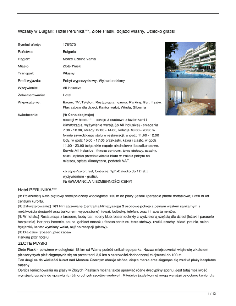 Wczasy w Bułgarii: Hotel Perunika***, Złote Piaski, dojazd własny, Dziecko gratis!