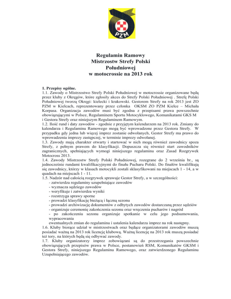Regulamin Ramowy Mistrzostw Strefy Polski Południowej w motocrossie na 2013 rok 1. Przepisy ogólne. 1.1. Zawody o Mistrzostwo Strefy Polski Południowej w motocrossie organizowane będą przez kluby z Okręgów, które zgłosiły akces do Strefy Polski Południowej . Strefę Polski Południowej tworzą Okręgi: kielecki i krakowski. Gestorem Strefy na rok 2013 jest ZO PZM w Kielcach, reprezentowany przez członka OKSM ZO PZM Kielce – Michała Korpasa. Organizacja zawodów musi być zgodna z przepisami prawa powszechnie obowiązującymi w Polsce, Regulaminem Sportu Motocyklowego, Komunikatami GKS M i Gestora Strefy oraz niniejszym Regulaminem Ramowym. 1.2. Ilość rund i daty zawodów - zgodnie z przyjętym kalendarzem na 2013 rok. Zmiany do kalendarza i Regulaminu Ramowego mogą być wprowadzone przez Gestora Strefy. W przypadku gdy jedna lub więcej imprez zostanie odwołanych, Gestor Strefy ma prawo do wprowadzenia imprezy zastępczej, w terminie imprezy odwołanej. 1.3. Zawody mają charakter otwarty i startować w nich mogą również zawodnicy spoza Strefy, z pełnym prawem do klasyfikacji. Dopuszcza się również start zawodników zagranicznych, spełniających wymogi niniejszego regulaminu oraz Zasad Rozgrywek Motocross 2013. 1.4. Zawody Mistrzostw Strefy Polski Południowej, rozegrane do 2 września br., są jednocześnie rundami kwalifikacyjnymi do finału Pucharu Polski. Do finałów kwalifikują się zawodnicy, którzy w klasach motocykli zostali sklasyfikowani na miejscach 1 - 14, a w quadach na miejscach 1 - 11. 1.5. Nadzór nad całością rozgrywek sprawuje Gestor Strefy, a w szczególności: - zatwierdza regulaminy uzupełniające zawodów - wyznacza sędziego zawodów - weryfikuje i zatwierdza wyniki - rozstrzyga sprawy sporne - prowadzi klasyfikację bieżącą i łączną sezonu - prowadzi archiwizację dokumentów z odbytych zawodów dostarczaną przez sędziów - organizuje ceremonię zakończenia sezonu oraz wręczenia pucharów i nagród - po zakończeniu sezonu organizuje spotkanie w celu jego podsumowania, wypracowania ewentualnych zmian do regulaminu i ustalenia kalendarza imprez na rok następny. 1.6. Kluby biorące udział w mistrzostwach oraz będące organizatorami zawodów muszą posiadać ważną na 2013 rok licencję klubową. Ważną licencję na 2013 rok muszą posiadać też tory, na których będą się odbywać zawody. 1.7. Kluby organizatorzy imprez zobowiązani są do przestrzegania powszechnie obowiązujących przepisów prawa w Polsce, postanowień RSM, Komunikatów GKSM i Gestora Strefy, niniejszego Regulaminu Ramowego, oraz zatwierdzonego Regulaminu Uzupełniającego zawodów. 2. Organizacja i przebieg zawodów 2.1. Organizator musi wydać regulamin uzupełniający zawodów, zgodny z mniejszym Regulaminem Ramowym. Regulamin uzupełniający musi zawierać co najmniej następujące dane: - nazwę organizatora, jego adres i telefon/faxie-mail - nazwę, termin oraz miejsce zawodów - imię i nazwisko sędziego oraz dyrektora zawodów - termin przyjmowania zgłoszeń - czas i miejsce pracy biura zawodów - godzina i miejsce startu oraz ogłoszenia wyników Regulamin uzupełniający zawodów musi być przesłany 4 tygodnie przed datą rozgrywania zawodów do Gestora Strefy celem zatwierdzenia. Zatwierdzony regulamin Gestor Strefy rozsyła do wszystkich Okręgów i klubów należących do Strefy i zamieszcza go na stronie internetowej Gestora Strefy. Zaleca się, aby Organizator wysłał regulamin także do klubów i Okręgów spoza Strefy. 2.2. Władze zawodów, wykaz osób funkcyjnych oraz ich obowiązki i kompetencje określa RSM. Wyznaczony przez Organizatora Dyrektor Zawodów musi posiadać co najmniej licencję sędziowską "O" sportu motocyklowego. Wyznaczony przez Gestora Sędzia Zawodów musi posiadać licencję "O" sportu motocyklowego.. Zawody muszą być zabezpieczone medycznie zgodnie z Regulaminem Medycznym PZM. 2.3 Zawody muszą być zabezpieczone medycznie zgodnie z Regulaminem Medycznym PZM. 2.4. Każdy organizator zawodów zobowiązany jest do wniesienia opłaty 500,00 zł przed zatwierdzeniem regulaminu uzupełniającego, tytułem partycypacji w kosztach organizacyjnych Strefy - na podstawie faktury lub noty uznaniowej wystawionej przez Gestora Strefy. 2.5. Jednorazową opłatę w wysokości 500,00 zł wnoszą także Okręgi, należące do Strefy, w terminie do 30.06.2013r. 3. Uczestnictwo w zawodach 3.1. Prawo startu mają zawodnicy z licencją "A" i "B" oraz "C". Uczestnicy startujący pierwszy raz (nie posiadający jeszcze licencji), muszą przystąpić na zawodach do egzaminu na certyfikat, Po jego pozytywnym zaliczeniu muszą wystąpić do właściwego Zarządu Okręgowego PZM o wystawienie licencji "C". W kolejnych zawodach obowiązuje ich już posiadanie licencji "C". Zasady uzyskiwania licencji zgodne z Zasadami Rozgrywek Motocross 2013. Egzamin teoretyczny należy przeprowadzić przed pierwszymi treningami w dniu zawodów. 3.2. Uczestnicy bez licencji, którzy nie ukończyli 18 lat, muszą przedłożyć pisemną zgodę rodziców lub opiekuna prawnego (z podaniem numeru dowodu osobistego osoby podpisującej zgodę), na udział w zawodach. 3.3. Zawodnik oraz uczestnik bez licencji musi przedłożyć w biurze zawodów: - wypełnioną i podpisana kartę zgłoszenia do zawodów - właściwą licencję ważną na 2013 rok - kartę zdrowia zawodnika sporów motorowych z wpisem o zdolności zawodnika - dokument tożsamości (tylko uczestnik bez licencji) - zaświadczenie o zdolności od lekarza sportowego (tylko uczestnik bez licencji) - dowód wpłaty wpisowego 3.4. Wpisowe do zawodów, zgodnie z Zasadami Rozgrywek Motocross 2013 wynosi 120zł dla wszystkich klas i od wszystkich uczestników i zawodników. Uczestnicy bez licencji wnoszą dodatkową opłatę za egzamin w wysokości 50 zł oraz dodatkową opłatę za ubezpieczenie w wysokości 25 zł za każdy dzień zawodów (zgodnie z BS/M/Ż/SIK z dnia 20.12.2012). 3.5. Orga