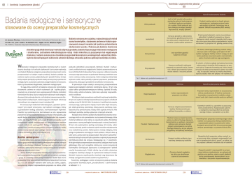 68 | 69 Badania reologiczne i sensoryczne stosowane do oceny preparatów kosmetycznych Badania sensoryczne są jedną z najważniejszych metod oceny kosmetyków, stosowane zarówno w trakcie opradr hab. inż., prof. nadzw. PK Barbara Tal – Figiel, dr inż. Wiesław Figiel cowywania nowych receptur jak i podczas potwierdzenia PK, WIiTCh, Katedra Inżynierii Chemicznej i Procesowej skuteczności wyrobu. Podczas gdy badania chemiczne charakteryzują skład chemiczny i wartość odżywczą produktu, badania fizyczne jego właściwości reologiczne i strukturalne, zaś badania mikrobiologiczne rodzaj i ilość mikroflory (o pozytywnym lub negatywnym działaniu), badania sensoryczne charakteryzują produkt kosmetyczny w kategoriach najbardziej zbliżonych do doznań będących codziennie udziałem każdego człowieka podczas aplikacji kosmetyku na skórę. dr Joanna Płocica, Laboratorium Kosmetyków Naturalnych Farmona Sp. z o.o. W łaściwości reologiczne preparatów kosmetycznych w dużym stopniu decydują o ich cechach użytkowych i tym samym wpływają na ich jakość. Badania reologiczne preparatów kosmetycznych można przeprowadzać na każdym etapie produkcji, badaniu poddaje się zarówno czyste surowce, półprodukty jak i produkt finalny. Istnieje ścisły związek pomiędzy wynikami analizy sensorycznej a pomiarami reologicznymi, co pozwala częściowo zastąpić badania sensoryczne, które są stosunkowo długotrwałe, badaniami reologicznymi. W ciągu kilku ostatnich lat badania sensoryczne kosmetyków stosowane zarówno w celach naukowych jak i aplikacyjnych, rozwinęły się od prostych ocen wykonywanych kilkoma metodami różnicowymi lub przy użyciu tradycyjnych opisowych skal kategorii, do pozycji, jaką zajmują obecnie, czyli odrębnej zaawansowanej dziedziny badań analitycznych, dostarczających unikalnych informacji niemożliwych do osiągnięcia innymi metodami [1]. W sensorycznych badaniach laboratoryjnych „aparatem pomiarowym” jest zespół sensoryczny, czyli wybrani oceniający, którzy są przeszkoleni według ustalonych, znormalizowanych kryteriów. Paneliści są systematycznie kontrolowani w celu zapewnienia poprawności przeprowadzonych przez nich badań. W przypadku, gdy wyniki badań obarczone są błędem, są niedokładne lub niepowtarzalne, nie mogą być brane pod uwagę. W takim przypadku nawet zastosowanie metod statystycznych do opracowywania wyników nie jest w stanie ich uwiarygodnić. Dlatego w większości dziedzin analitycznych istnieją standaryzowane procedury kalibracji każdej zastosowanej metody oraz każdego instrumentu pomiarowego, a także monitoringu pracy instrumentu [1-3]. poduszki, jednolitość, przyczepność, kleistość, tłustość i natłuszczenie, wchłanianie oraz wygładzanie. Badania przeprowadzono na terenie Politechniki Krakowskiej. Testy związane z doborem zespołu sensorycznego opracowano na podstawie literatury przedmiotu oraz norm z zakresu analizy sensorycznej. Celem wstępnej selekcji było wybranie osób, które potrafiły wykonać poprawnie podstawowe oznaczenia, dotyczące sprawdzenia wrażliwości sensorycznej. W pierwszym etapie selekcji sensorycznej przeprowadzono badania pod względem zdolności rozróżniania barwy. W tym celu użyto tablice pseudoizochromatyczne Ishihary. Spośród 38 osób, które wzięły udział w badaniu, tylko dwie wykazały nieprawidłowości wzrokowe. W kolejnym etapie sprawdzono wrażliwość węchową kandydatów. W tym celu wybrano metodę bezpośredniej oceny zapachu w kolbach według normy PN-EN ISO 5496. W szkoleniu i kwalifikacji do zespołu sensorycznego, wykorzystano między innymi takie olejki eteryczne, jak: olejek geraniowy, lawendowy, różany, paczuli, waniliowy, eukaliptusowy oraz pomarańczowy. Osoby, które uzyskały mniej niż 70% możliwych punktów, zostały wykluczone z dalszych oznaczeń. Następny test, któremu poddano kandydatów do zespołu sensorycznego miał na celu sprawdzenie czucia powierzchniowego, które może być odbierane przez skórę, np. opuszkami palców. Panelistów poproszono o ocenę peelingów kosmetycznych o rożnej ziarnistości. W tym celu wykorzystano peeling zawierający sól morską, cukier z trzciny cukrowej, pestki truskawek, łupinki orzechów makadamamia oraz rozdrobniony pumeks. Wykorzystano metodę trójkątną, która polega na podawaniu oceniającym trzech próbek, z których dwie są takie same, a jedna rożni się od pozostałych. Warunkiem zakwalifikowania do dalszych oznaczeń było uzyskanie co najmniej 4 poprawnych identyfikacji próbek dla zestawu składającego się z 5 powtórzeń. W drugim etapie przeprowadzono oznaczenia, badające zmysł czucia głębokiego, który jest szczególnie istotny przy ocenie konsystencji kosmetyków. Oceniających poproszono o uszeregowanie 9 próbek emulsji kosmetycznych. Próbki różniły się od siebie stężeniem emulgatora (lanoliny) użytego do wytwarzania badanych emulsji. Wartość krytyczna współczynnika korelacji rang Spearmana dla metody szeregowania została ustalona na poziomie 0,7. Parametry, podlegające ocenie sensorycznej podczas badania preparatów kosmetycznych, przedstawiono i zdefiniowano w tabelach 1 i 2. Analiza sensoryczna Analiza sensoryczna została wykonana przez zespół sensoryczny, była to grupa osób wybrana według określonych kryteriów, która po przejściu określonego szkolenia i treningu jest w stanie dostarczyć wnikliwej i precyzyjnej informacji o sensorycznej jakości produktu, będącego przedmiotem oceny. Ocenę badanych preparatów kosmetycznych przeprowadził zespół sensoryczny składający się z 30 osób, byli to wybrani oceniający z grupy 38 osobowej. Celem przeprowadzonych badań była ocena preparatów firmy Laboratorium Kosmetyków Naturalnych Farmona Sp. z o.o. Do oznaczeń wybrano takie cechy jak: barwę, zapach, konsystencję, stopień rozprowadzania preparatu na skórze, efekt 1/2014 e - w y d a ni e d o p o b r a n i a
