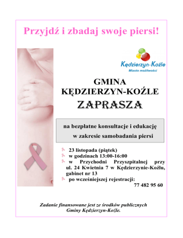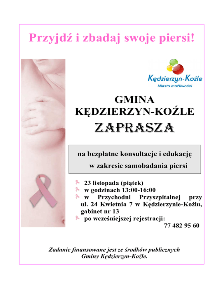 Przyjdź i zbadaj swoje piersi! GMINA KĘDZIERZYN-KOŹLE ZAPRASZA na bezpłatne konsultacje i edukację w zakresie samobadania piersi 23 listopada (piątek) w godzinach 13:00-16:00 w Przychodni Przyszpitalnej przy ul. 24 Kwietnia 7 w Kędzierzynie-Koźlu, gabinet nr 13 po wcześniejszej rejestracji: 77 482 95 60 Zadanie finansowane jest ze środków publicznych Gminy Kędzierzyn-Koźle.