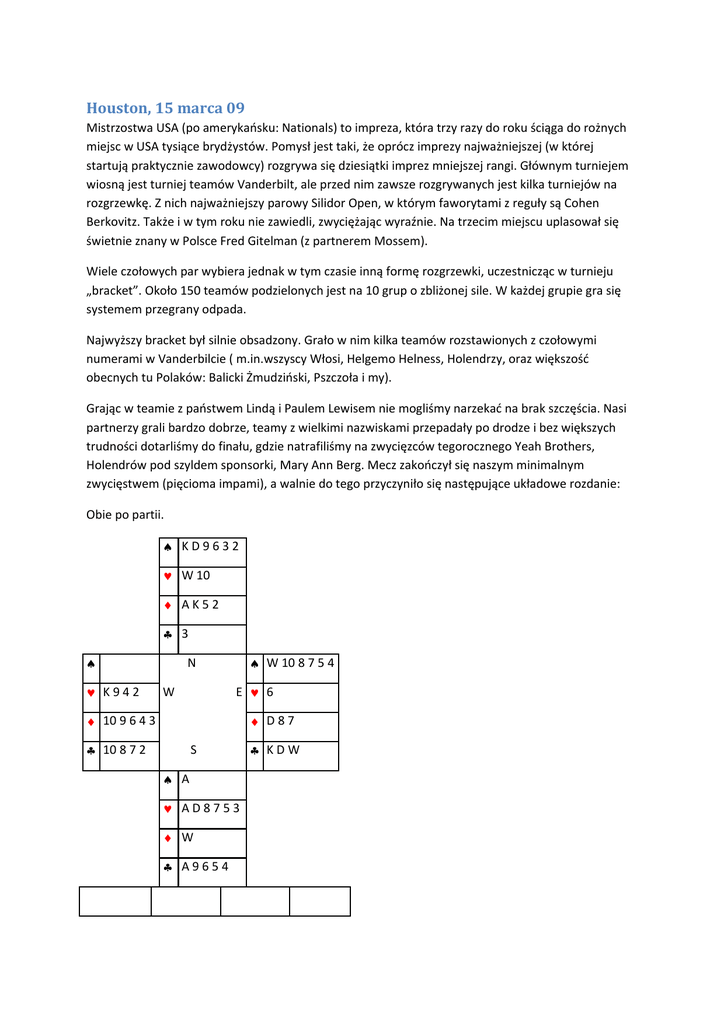 Houston, 15 marca 09 Mistrzostwa USA (po amerykańsku: Nationals) to impreza, która trzy razy do roku ściąga do rożnych miejsc w USA tysiące brydżystów. Pomysł jest taki, że oprócz imprezy najważniejszej (w której startują praktycznie zawodowcy) rozgrywa się dziesiątki imprez mniejszej rangi. Głównym turniejem wiosną jest turniej teamów Vanderbilt, ale przed nim zawsze rozgrywanych jest kilka turniejów na rozgrzewkę. Z nich najważniejszy parowy Silidor Open, w którym faworytami z reguły są Cohen Berkovitz. Także i w tym roku nie zawiedli, zwyciężając wyraźnie. Na trzecim miejscu uplasował się świetnie znany w Polsce Fred Gitelman (z partnerem Mossem). Wiele czołowych par wybiera jednak w tym czasie inną formę rozgrzewki, uczestnicząc w turnieju „bracket”. Około 150 teamów podzielonych jest na 10 grup o zbliżonej sile. W każdej grupie gra się systemem przegrany odpada. Najwyższy bracket był silnie obsadzony. Grało w nim kilka teamów rozstawionych z czołowymi numerami w Vanderbilcie ( m.in.wszyscy Włosi, Helgemo Helness, Holendrzy, oraz większość obecnych tu Polaków: Balicki Żmudziński, Pszczoła i my). Grając w teamie z państwem Lindą i Paulem Lewisem nie mogliśmy narzekać na brak szczęścia. Nasi partnerzy grali bardzo dobrze, teamy z wielkimi nazwiskami przepadały po drodze i bez większych trudności dotarliśmy do finału, gdzie natrafiliśmy na zwycięzców tegorocznego Yeah Brothers, Holendrów pod szyldem sponsorki, Mary Ann Berg. Mecz zakończył się naszym minimalnym zwycięstwem (pięcioma impami), a walnie do tego przyczyniło się następujące układowe rozdanie: Obie po partii. ♠ KD9632 ♥ W 10 ♦ AK52 ♣ 3 ♠ ♥ K942 ♠ W 10 8 7 5 4 N E ♥ 6 W ♦ 10 9 6 4 3 ♦ D87 ♣ 10 8 7 2 S ♠ A ♥ AD8753 ♦ W ♣ A9654 ♣ KDW W Berg pas pas pas pas N Jassem 1♠ 2♠ 3♦ (1) 4♥ E Mohan pas pas pas pas S Martens 2♥ 3♣ 3♥ pas (1) Czwarty kolor Martens zabił wist karowy figurą w stole zagrał trefla do asa i trefla przebił. Teraz próbował cofnąć się asem pik do ręki. Niespodzianka! Berg przebiła i szybko wyszła w atu. W kluczowym momencie tego rozdania na wysokości zadania stanął Martens. Waleta kier przejął w ręku damą, zagrał asa kier i oddał lewę na króla: ♠ ♥ K ♦ 9643 ♣ 10 8 ♠ KD96 ♥ ♦ A52 ♣ N W S ♠ ♥ 8753 ♦ ♣ 965 ♠ W 10 8 7 E ♥ ♦ D8 ♣ W Zadaniem przeciwników było niedopuszczenie Martensa do stołu. Dlatego też Mohan do kiera odblokował trefle, wyrzucając waleta! Gdyby partnerka miała w treflach dziesiątkę z dziewiątką, kontrakt można by obłożyć. Na nasze szczęście nie miała. A co by się stało, gdyby Martens nie przejął waleta kier damą w ręku? Byłby co prawda w stole, na asa karo wyrzuciłby trefla, a na pika wyrzuciłby kolejnego trefla: ♠ KD963 ♥ ♦ 52 ♣ N ♠ ♠ W 10 8 7 5 K 9 W E ♥ ♥ ♦ 964 ♦ D 10 8 S ♣ ♣ W ♠ ♥ AD875 ♦ ♣ 65 W przebija pika i zostaje jej singlowy król kier. Teraz W gra trefla do waleta partnera, a ten grając w pika promuje obkładającą lewę na króla kier. Na drugim stole licytacja przebiegała relayowo. Siedząca na pozycji W Linda Lewis dowiedziała się dokładnego układu dziadka i aby ograniczyć przebitki treflowe zawistowała znakomicie spod króla kier. Ten wist został wynagrodzony dość przewrotnie: obrończyni wzięła bowiem w rozdaniu lewy na wszystkie trzy pozostałe jej atuty. Rozgrywający wziął lewę w stole i chciał odblokować piki zgrywając asa. Nie udało się. Lewis przebiła i znakomicie wyszła w karo odcinając rozgrywającego od pików. As trefl, trefl przebity, król karo (wyrzucenie trefla) i król pik. ♠ ♥ ♦ ♣ ♠ KD963 ♥ ♦ 52 ♣ N ♠ W 10 8 7 5 K9 W E ♥ 10 9 6 ♦ D 10 8 S ♣ W ♠ ♥ AD875 ♦ ♣ 96 Z ręki wyrzucono przedostatniego trefla. Lewis przebiła po raz drugi. Zagrała trefla do partnera (trzecia lewa obrony) i pik wypromował partnerce obkładającą lewę na króla kier. Do turnieju Vanderbilt zgłosiło się 71 teamów. Pierwszego dnia spora teamy rozstawione z numerami od 1 do 43 mają dzień wolny. My jesteśmy rozstawieni z numerem 24. Trafiamy dość pechowo w pierwszej rundzie, bo na Amerykanki, wielokrotne mistrzynie świata kobiet. Balicki Żmudziński rozstawieni są z numerem dziesiątym, Leśniewski z Gawrysiem mają numer 11, a Pszczoła – czternasty.
