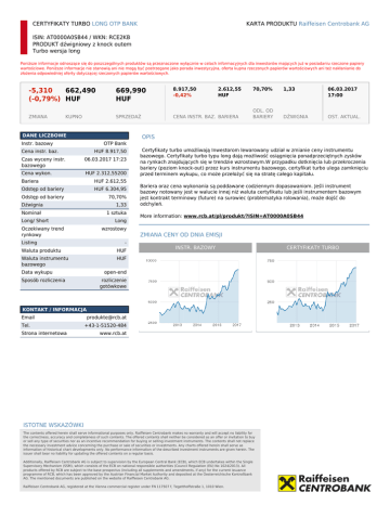 KARTA PRODUKTU Raiffeisen Centrobank AG CERTYFIKATY TURBO LONG OTP BANK ISIN: AT0000A0SB44 / WKN: RCE2KB PRODUKT dźwigniowy z knock outem Turbo wersja long Poniższe informacje odnoszące się do poszczególnych produktów są przeznaczone wyłącznie w celach informacyjnych dla inwestorów mających już w posiadaniu rzeczone papiery wartościowe. Poniższe informacje nie stanowią ani nie mogą być postrzegane jako porada inwestycyjna, oferta kupna rzeczonych papierów wartościowych ani też nakłanianie do złożenia odpowiedniej oferty dotyczącej rzeczonych papierów wartościowych. -5,310 662,490 (-0,79%) HUF 669,990 HUF 8.917,50 -0,42% ZMIANA SPRZEDAŻ CENA INSTR. BAZ. BARIERA KUPNO DANE LICZBOWE 2.612,55 HUF 70,70% 1,33 06.03.2017 17:00 ODL. OD BARIERY DŹWIGNIA OST. AKTUAL. OPIS Instr. bazowy OTP Bank Cena instr. baz. HUF 8.917,50 Czas wyceny instr. bazowego 06.03.2017 17:23 Cena wykon. HUF 2.312,55200 Bariera HUF 2.612,55 Odstęp od bariery HUF 6.304,95 Odstęp od bariery 70,70% Dźwignia 1,33 Nominał 1 sztuka Long/ Short Long Oczekiwany trend rynkowy Certyfikaty turbo umożliwają Inwestorom lewarowany udział w zmianie ceny instrumentu bazowego. Certyfikaty turbo typu long dają możliwość osiągnięcia ponadprzeciętnych zysków na rynkach znajdujących się w trendzie wzrostowym.W przypadku dotknięcia lub przekroczenia bariery (poziom knock-out) przez kurs instrumentu bazowego, certyfikat turbo ulega zamknięciu przed terminem wykupu, co może przełożyć się na stratę całego kapitału. Bariera oraz cena wykonania są poddawane codziennym dopasowaniom. Jeśli instrument bazowy notowany jest w walucie innej niż waluta certyfikatu lub jeśli instrumentem bazowym jest kontrakt terminowy (future) na surowiec (problematyka rolowania), może dojść do odchyleń. More information: www.rcb.at/pl/produkt/?ISIN=AT0000A0SB44 wzrostowy ZMIANA CENY OD DNIA EMISJI Listing - Waluta produktu HUF Waluta instrumentu bazowego HUF Data wykupu INSTR. BAZOWY open-end Sposób rozliczenia rozliczenie gotówkowe KONTAKT / INFORMACJA Email Tel. Strona internetowa [email protected] +43-1-51520-484 www.rcb.at ISTOTNE WSKAZÓWKI The contents offered herein shall serve informational purposes only. Raiffeisen Centrobank makes no warranty and will accept no liability for the correctness, accuracy and completeness of such contents. The offered contents shall neither be considered as an offer or invitation to buy or sell any type of securities nor as an incentive recommendation for buying or selling investment instruments. The contents shall not replace the necessary investment advice concerning the purchase or sale of securities or investments. Any charts offered herein shall serve as information of historical chart developments only. No performance information of the described investment instruments are given herein. The issuer shall bear no liability for updating the offered contents on a regular basis. Additionally, Raiffeisen Centrobank AG is subject to supervision by the European Central Bank (ECB), which ECB undertakes within the Single Supervisory Mechanism (SSM), which consists of the ECB on national responsible authorities (Council Regulation (EU) No 1024/2013). All products offered by RCB are subject to the base prospectus (including all supplements and amendments, if any) for the current issuance programme of RCB, which has been approved by the Austrian Financial Market Authority and deposited at the Oesterreichische Kontrollbank AG. The mentioned documents are published on the website of Raiffeisen Centrobank AG. Raiffeisen Centrobank AG, registered at the Vienna commercial register under FN 117507 f, Tegetthoffstraße 1, 1010 Wien. Powered by TCPDF (www.tcpdf.org) CERTYFIKATY TURBO