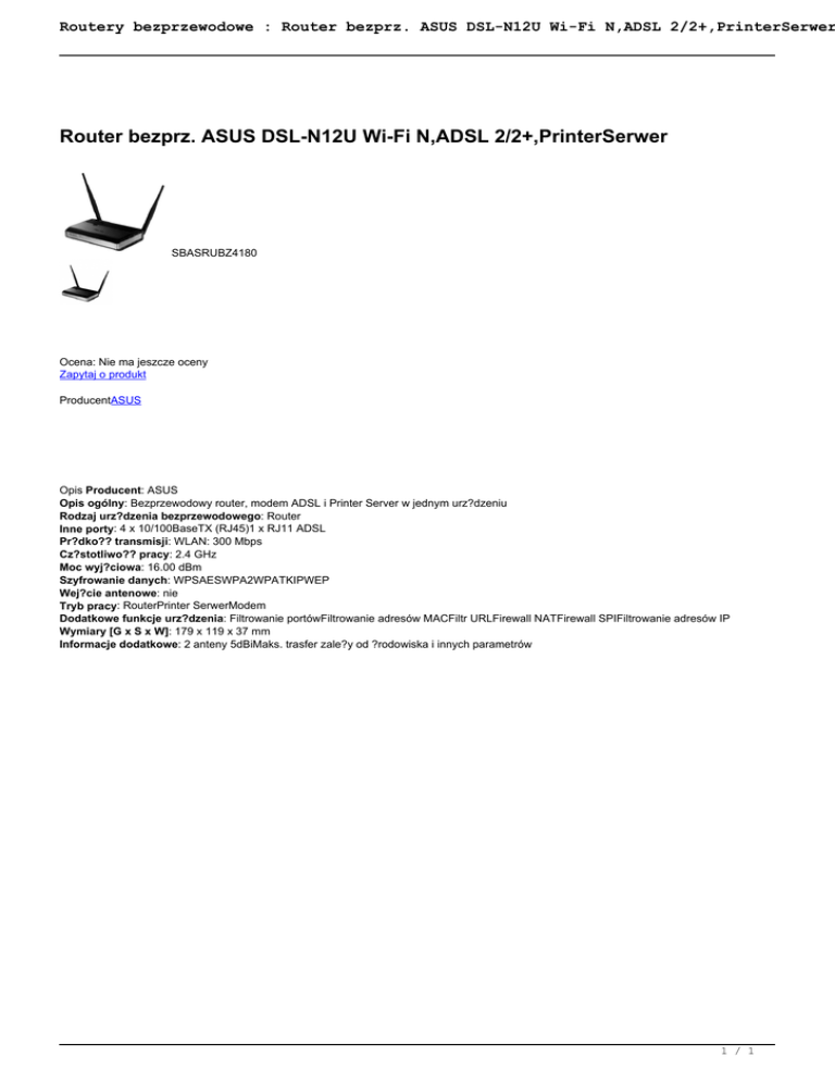 Routery bezprzewodowe : Router bezprz. ASUS DSL-N12U Wi-Fi N,ADSL 2/2+,PrinterSerwer Router bezprz. ASUS DSL-N12U Wi-Fi N,ADSL 2/2+,PrinterSerwer SBASRUBZ4180 Ocena: Nie ma jeszcze oceny Zapytaj o produkt ProducentASUS Opis Producent: ASUS Opis ogólny: Bezprzewodowy router, modem ADSL i Printer Server w jednym urz?dzeniu Rodzaj urz?dzenia bezprzewodowego: Router Inne porty: 4 x 10/100BaseTX (RJ45)1 x RJ11 ADSL Pr?dko?? transmisji: WLAN: 300 Mbps Cz?stotliwo?? pracy: 2.4 GHz Moc wyj?ciowa: 16.00 dBm Szyfrowanie danych: WPSAESWPA2WPATKIPWEP Wej?cie antenowe: nie Tryb pracy: RouterPrinter SerwerModem Dodatkowe funkcje urz?dzenia: Filtrowanie portówFiltrowanie adresów MACFiltr URLFirewall NATFirewall SPIFiltrowanie adresów IP Wymiary [G x S x W]: 179 x 119 x 37 mm Informacje dodatkowe: 2 anteny 5dBiMaks. trasfer zale?y od ?rodowiska i innych parametrów 1 / 1 Powered by TCPDF (www.tcpdf.org)