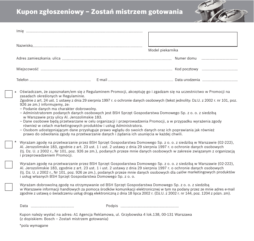 Kupon zgłoszeniowy ‒ Zostań mistrzem gotowania Imię Nazwisko Model piekarnika Adres zamieszkania: ulica Numer domu Miejscowość Kod pocztowy Telefon E-mail Data urodzenia * Oświadczam, że zapoznałam/em się z Regulaminem Promocji, akceptuję go i zgadzam się na uczestnictwo w Promocji na zasadach określonych w Regulaminie. Zgodnie z art. 24 ust. 1 ustawy z dnia 29 sierpnia 1997 r. o ochronie danych osobowych (tekst jednolity: Dz.U. z 2002 r. nr 101, poz. 926 ze zm.) informujemy, że: – Podanie danych ma charakter dobrowolny. – Administratorem podanych danych osobowych jest BSH Sprzęt Gospodarstwa Domowego Sp. z o. o. z siedzibą w Warszawie przy ulicy Al. Jerozolimskie 183. – Dane osobowe będą przetwarzane w celu organizacji i przeprowadzenia Promocji, a w przypadku wyrażenia zgody również w celach marketingowych produktów i usług Administratora. – Osobom udostępniającym dane przysługuje prawo wglądu do swoich danych oraz ich poprawiania jak również prawo do odwołania zgody na przetwarzanie danych i żądania ich usunięcia w każdej chwili. * Wyrażam zgodę na przetwarzanie przez BSH Sprzęt Gospodarstwa Domowego Sp. z o. o. z siedzibą w Warszawie (02-222), Al. Jerozolimskie 183, zgodnie z art. 23 ust. 1 i ust. 2 ustawy z dnia 29 sierpnia 1997 r. o ochronie danych osobowych (tj. Dz. U. z 2002 r., Nr 101, poz. 926 ze zm.), podanych przeze mnie danych osobowych w zakresie związanym z organizacją i przeprowadzeniem Promocji. Wyrażam zgodę na przetwarzanie przez BSH Sprzęt Gospodarstwa Domowego Sp. z o. o. z siedzibą w Warszawie (02-222), Al. Jerozolimskie 183, zgodnie z art. 23 ust. 1 i ust. 2 ustawy z dnia 29 sierpnia 1997 r. o ochronie danych osobowych (tj. Dz. U. z 2002 r., Nr 101, poz. 926 ze zm.), podanych przeze mnie danych osobowych dla celów marketingowych produktów i usług własnych BSH Sprzęt Gospodarstwa Domowego Sp. z o. o. Wyrażam dobrowolną zgodę na otrzymywanie od BSH Sprzęt Gospodarstwa Domowego Sp. z o. o. z siedzibą w Warszawie informacji handlowych za pomoca środków komunikacji elektronicznej w tym na podany przez ze mnie adres e-mail zgodnie z ustawą o świadczeniu usług drogą elektroniczną z dnia 18 lipca 2002 r. (Dz.U. z 2002 r. nr 144, poz. 1204 z pózn. zm). Data Podpis Kupon należy wysłać na adres: A1 Agencja Reklamowa, ul. Grzybowska 4 lok.138, 00-131 Warszawa (z dopiskiem: Bosch ‒ Zostań mistrzem gotowania) *pola wymagane