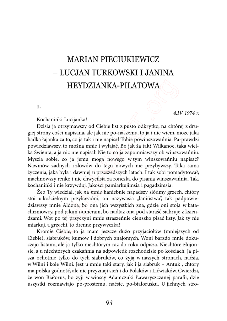 MARIAN PIECIUKIEWICZ – LUCJAN TURKOWSKI I JANINA HEYDZIANKA-PILATOWA 1. 4.IV 1974 r. Kochanińki Lucijanka! Dzisia ja otrzymawszy od Ciebie list z pusto odkrytko, na chtórej z drugiej strony cości napisana, ale jak nie po-naszemu, to ja i nie wiem, może jaka hadka łajanka za to, co ja tak i nie napisał Tobie powinszowańnia. Pa-prawdzi powiedziawszy, to można mnie i wyłajać. Bo jak ża tak? Wilkanoc, taka wielka Świenta, a ja nic nie napisał. Nie to co ja zapomniawszy ob winszowańniu. Myszla sobie, co ja jemu moga nowego w tym winszowańniu napisać? Nawinów żadnych i złowów do tego nowych nie przybywszy. Taka sama życzenia, jaka była i dawniej u przeszedszych latach. I tak sobi pomadytował; machnowszy renko i nie chwyciłsia za ronczka do pisania winszawańnia. Tak, kochanińki i nie krzywduj. Jakości pamiarkujimsia i pagadzimsia. Żeb Ty wiedział, jak na mnie haniebnie napadszy siódmy grzech, chtóry stoi u kościelnym przykazańni, on nazywasia „laniŭstwa”, tak padpowiedziawszy mnie Aldona, bo ona jich wszystkich zna, gdzie oni stoja w katachizmowcy, pod jakim numeram, bo nadtaż ona pod staraść siabruje z ksiendzami. Wot po tej przyczyni mnie straszeńnie cienszko pisać listy. Jak ty nie miarkuj, a grzechi, to drenne przywyczka! Kromie Ciebie, to ja mam jeszcze dużo przyjaciołów (mniejszych od Ciebie), siabruków, kumow i dobrych znajomych. Woni barzdo mnie dokuczajo listami, ale ja tylko niechtórym raz do roku odpisza. Niechtóre złujonsie, a u niechtórych czakańnia na adpowiedź rozchodzisie po kościach. Ja pisza ochotnie tylko do tych siabruków, co żyją w naszych stronach, naćsia, w Wilni i kole Wilni. Jest u mnie taki stary, jak i ja siabruk – Antuk1, chtóry ma polska godność, ale nie przyznaji sień i do Polaków i Lićwiaków. Ćwierdzi, że won Białorus, bo żyji w wioscy Adamczuki Ławaryszczanej parafii, dzie uszystki rozmawiajo po-prostemu, naćsie, po-białorusku. U jichnych stro- 93 nach czysta facecija. Lićwiaki bijo do głowy, że woni ni Polaki i ni Gudasy, a od wieków wiecznych byli Lićwiakami. Ksiendzy i insza agitatory, że tu była Polszcza, i wy Polaki. A chołchoźniki stare jim powiadajo, tak piszy mnie Antuk, że my bywszy polskoj wiary, takimi zastanimsia aż do śmierci i od swojego prostego jenzyka nie odmówimsia, a u paszporty niech sobie właść pisze, co chce, nam to i nia świerzbi i nia boli. Tak wot Antuk opisuje mnie dakumantnie przez ichna życia. Opisuji, jak tam u jich chołchoźniki sprawuja chściny, wasela, pogrzeby. Pamaleńku zaczynajo przachodzić z dawniejszego na nowy ład. Starsza pakaleńnia, to jeszcze trzymasia dawniejszego przyzwyczajenia i chreźbiny sprawujo jak i dawniej i dzieci wożo kścić do kościoła i w domu odbywasie tak jak to trzeba pochrzyścijansku: i śpiewajo i jedzo i dużo wódków pijo. Największa zdarzennia, to wasela. Na wasela schodzonsia nie tylko krewne, ale chołchoźniki z całej wioski. Pijo, hulajo, aż puki bryhadziry nie popendzo na robota. Ale jaka tam już robota z pjanych! Na pogrzeb tyż źbierajosie, z kantyczak przy niebożczykach śpiewajo, a już pochowawszy, na „żałobnym stole” pijo nie w swoj duch i zawanitujo cała wioska. Antuk pisze, co na waselu i pogrzebie rozhodzisie kale 100 litrów samogonu. Trzeba prawda powiedzieć, że właść sztrafuji i nawat do turmy sadzi samogonszczyków, ale dzie ty ich wszystkich połowisz? Zalezi w genste kszaki na rojstach i pendzi sobie. A na jich nicht nie donosi, bo kazionna dzichcinia (tak Lićwiaki nazywajo wódka) barzdo droga. Pośle Wilkanoca Antuk był przysławszy mnie list i opisuji, jak oni świenta przeprowadzili. „Ludzi żyjo dobrzo, jest co jeść i pić. A jajków, co było! To chiba wiencej, jak za Piłsudzkiego: i bili, i kaczali razdowali padszywancom, co tyż po-swojemu bawilisia jajkami. Ale było bardzo facetnie, jak przyjechał w nasza wioska „ksiondz” od bezbożników. Zjadszy świanconka ludzi zeszlisia na sabrania w kłubie. Ot ten „ksiondz” i dawaj nam mówić, chto wymyszlił Wilkanoc i mówił barzda wiele banialuków. Niechtury słuchali, a insza, co wiency byli podpiwszy, dawaj z jego padszkieliwać, zadawali różne śmieszne pytani, to on biedny, w ta pora, zaczoł źbiwaćsia z pantałyku. Mnie zrobiłosia szkoda jego i ja mówia jemu: „draugas, dawaj pójdzim troszki podmocujimsia świenconko, wypijisz naszaj krzakówki, to smaglej pójdzie sowieszczania”. Długo nie myślawszy, on obradowałsia i mówi: „nu to i gerai, eisim giarsi i valgiti”. Przewróciwszy to na nasza mowa wychodzi tak: „nu to dobrze, pójdziemy wypić i przekąsić”. – U nas jeszcze nie wyprowadziwszysia przywyczka, – piszy Antuk, chodzić na Wilkanoc u łałoŭniki, to i w tym roku przyszli pod moja okna i pośpiwali ze swojo muzyko. Nastańka moja poprosiła jich zajści w chata. Prawda, niema co mówić, nie pogardzili nami i zaszli. Tut im dali po szklancy samahonu i zakonski, a drystunu dali dziesiontak jajkow i kiłbasy cały motak. 94 Ty moża i zapomniwszy, że drystunam nazywasia ten, co nosi koszyk na jajki. To te łałowniki mówio temu biezbożnemu ksiendzu, „jaka tobie tu rakraacija siedzić z tymi starymi dziadukami, jich nie pszekrencisz na swoja wiara, chodź lepi z nami, w nasza mocia to i naspiwajimsia aż do chrypki i napjimsia samahonki różnych sortów, bo z różnych rojstów”. I co ty myślisz? On poszed z kompanija łałowników i podciongał jim: „Wasoły nam dziś dzień nastał”. Nu, co Tobie jeszcze napisać? A wiesz, że u nas młoda manszczyzny, a kobiety to i młoda i stara zdurniawszy naczysto. Pendzosie za moda! Manszczyzny chodzo obwłosiawszy, te co nie obłysiawszy. Fryzijery siedzo sobie, „Szporty” palo nic nie robion i w «oczko» grajo, czasami niektóre wróżo, ci zajdzie choć jeden dziaduk szyja pad polka podstrzygnąć i dzikie włosy na brwiach powycinać, chtóre lezo w woczy. A na kobiet, to hadko patrzeć. 