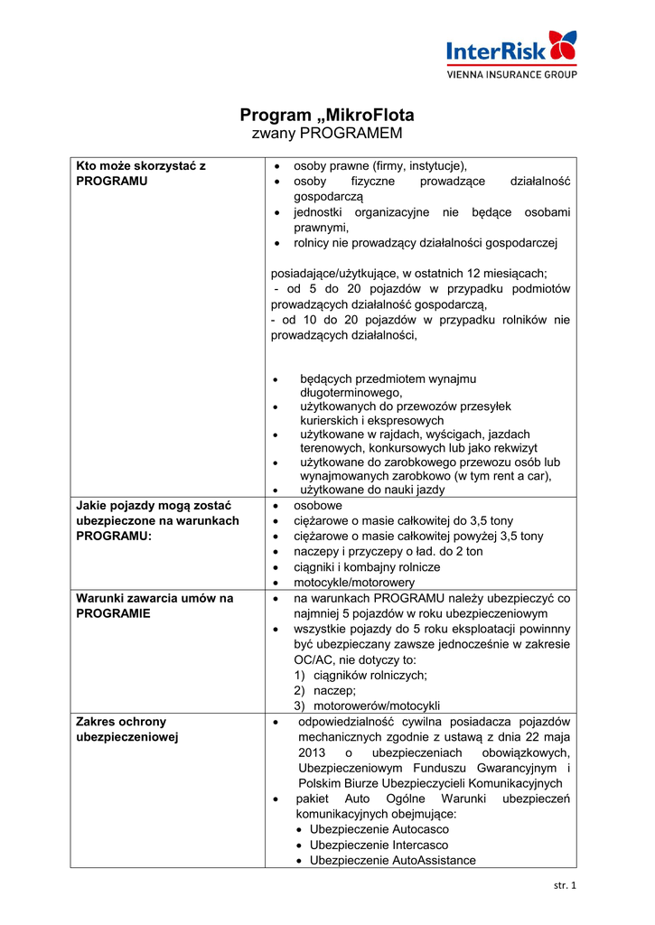 Program „MikroFlota zwany PROGRAMEM Kto może skorzystać z PROGRAMU osoby prawne (firmy, instytucje), osoby fizyczne prowadzące działalność gospodarczą jednostki organizacyjne nie będące osobami prawnymi, rolnicy nie prowadzący działalności gospodarczej posiadające/użytkujące, w ostatnich 12 miesiącach; - od 5 do 20 pojazdów w przypadku podmiotów prowadzących działalność gospodarczą, - od 10 do 20 pojazdów w przypadku rolników nie prowadzących działalności, Jakie pojazdy mogą zostać ubezpieczone na warunkach PROGRAMU: Warunki zawarcia umów na PROGRAMIE Zakres ochrony ubezpieczeniowej będących przedmiotem wynajmu długoterminowego, użytkowanych do przewozów przesyłek kurierskich i ekspresowych użytkowane w rajdach, wyścigach, jazdach terenowych, konkursowych lub jako rekwizyt użytkowane do zarobkowego przewozu osób lub wynajmowanych zarobkowo (w tym rent a car), użytkowane do nauki jazdy osobowe ciężarowe o masie całkowitej do 3,5 tony ciężarowe o masie całkowitej powyżej 3,5 tony naczepy i przyczepy o ład. do 2 ton ciągniki i kombajny rolnicze motocykle/motorowery na warunkach PROGRAMU należy ubezpieczyć co najmniej 5 pojazdów w roku ubezpieczeniowym wszystkie pojazdy do 5 roku eksploatacji powinnny być ubezpieczany zawsze jednocześnie w zakresie OC/AC, nie dotyczy to: 1) ciągników rolniczych; 2) naczep; 3) motorowerów/motocykli odpowiedzialność cywilna posiadacza pojazdów mechanicznych zgodnie z ustawą z dnia 22 maja 2013 o ubezpieczeniach obowiązkowych, Ubezpieczeniowym Funduszu Gwarancyjnym i Polskim Biurze Ubezpieczycieli Komunikacyjnych pakiet Auto Ogólne Warunki ubezpieczeń komunikacyjnych obejmujące: Ubezpieczenie Autocasco Ubezpieczenie Intercasco Ubezpieczenie AutoAssistance str. 1 Warunki szczególne Klauzule Likwidacja szkód Prowizja Procedura przystąpienia PROGRAMU do Ubezpieczenie AutoSzyby Ubezpieczenie następstw nieszczęśliwych wypadków kierowcy i pasażera Ochrona prawna Ubezpieczenie odpowiedzialności cywilnej w ruchu zagranicznym Zielona Karta ubezpieczenie pojazdów osobowych oraz ciężarowych o DMC do 3,5 ton w zakresie AC zawierane jest w : w Wariancie autoryzowanym dla pojazdów do 5 roku eksploatacji w Wariancie Praktycznym dla pojazdów od 6 do 13 roku eksploatacji. Likwidacja szkód odbywać się będzie w Sieci Partnerskiej InterRisk, zgodnie z Załącznikiem nr 1 do PROGRAMU warunki programu nie obejmują możliwości ustalenia jakichkolwiek zmian w procesie likwidacji szkody, zgodnie z zapisami umowy agencyjnej jednak nie więcej niż 12%, Menadżer Sprzedaży/osoba z Zespołu Sprzedaży Korporacyjnej na podstawie danych Klienta (nazwa, nr regon, ew. imię i nazwisko nr pesel), sprawdza w UFG czy Klient spełnia warunki przystąpienia do PROGRAMU, Zasady sprawdzania Klienta w UFG: 1) w przypadku podmiotów prawnych firmę należy sprawdzić po nr regon, w miejsce nazwy Klienta wpisujemy zawsze * (gwiazdkę). 2) w przypadku osób fizycznych prowadzących działalność gospodarczą należy Klienta sprawdzić po a) imieniu i nazwisku oraz nr pesel b) nr regon gdzie w miejsce nazwy Klienta wpisujemy zawsze * (gwiazdkę). następnie sumujemy wyniki uzyskane po nr pesel i po nr regon w przypadku flot obsługiwanych przez Agenta, Agent dostarcza do Menadżera Sprzedaży/osoby z Zespołu Sprzedaży Korporacyjnej wydruk z IPORTALU, potwierdzający spełnienie warunków przystąpienia do PROGRAMU przez Klienta oraz jego dane szkodowe, w przypadku gdy Klient spełnia warunki przystąpienia do PROGRAMU, Menadżer Sprzedaży/osoba z Zespołu Sprzedaży Korporacyjnej sprawdza czy Klient nie otrzymał oferty z innego Oddziału: str. 2 Zgłoszenie pojazdów wymienionych w Umowie. nie Minimalne Składki OC/Stawki AC: Maksymalne Sumy Ubezpieczenia Płatność składki Okres obowiązywania PROGRAMU ścieżka dostępu:………………….. w przypadku gdy inny Oddział złożył Klientowi ofertę, Menadżer Sprzedaży/osoba z Zespołu Sprzedaży Korporacyjnej powinien skontaktować się z Oddziałem, który przedstawił ofertę w celu przedstawienia identycznych warunków, jeśli Klient dotychczas nie otrzymał oferty z InterRisk lub od daty złożenia oferty minęło więcej niż 14 dni wcześniej a Klient z niej nie skorzystał, Menadżer Sprzedaży/osoba z Zespołu Sprzedaży Korporacyjnej przygotowuje ofertę, na podstawie danych uzyskanych z UFG, przy pomocy Kalkulatora stanowiącego załącznik nr 2 do PROGRAMU, warunki przygotowanej oferty Menadżer Sprzedaży/osoba z Zespołu Sprzedaży Korporacyjnej przedstawia Klientowi lub Agentowi, w przypadku flot agencyjnych , w przypadku zaakceptowania oferty przez Klienta Menadżer Sprzedaży/osoba z Zespołu Sprzedaży Korporacyjnej zobowiązany jest do niezwłocznego przygotowania Umowy, która stanowi załącznik nr 3 do Instrukcji, (należy pamiętać, że w Umowie należy podać wszystkie pojazdy posiadane oraz użytkowane przez Klienta na dzień podpisywania Umowy Generalnej) pozostałe warunki zawierania i obsługi ubezpieczeń odbywać się będą na zasadach określonych w INSTRUKCJI ZAWIERANIA I OBSŁUGI UBEZPIECZEŃ FLOTOWYCH Ubezpieczenia przez Klienta nowo zakupionego pojazdu, który będzie 21-wszym oraz kolejnym pojazdem, każdorazowo wymaga zgody DUK. DUK wydaje zgodę na podstawie przesłanego wniosku (zawierającego wszystkie dane pojazdu) oraz załączonego raportu Oceny polis z Umowy Klienta. Minimalne warunki taryfowe zostały określone w obowiązującym, na dzień taryfikacji MikroFloty Kalkulatorze, stanowiącym załącznik nr 2 do warunków PROGRAMU, Zgodnie z posiadanymi kompetencjami Menadżera Sprzedaży lub osoba z Zespołu Sprzedaży Korporacyjnej W przypadku wyższych wartości decyzja DUK. Zgodnie z INSTRUKCJĄ ZAWIERANIA I OBSŁUGI UBEZPIECZEŃ FLOTOWYCH Do odwołania str. 3 Bonusy Obsługa PROGRAMU Postanowienia Końcowe do każdej polisy, gdzie składka wynosi min. 1.000 zł za pojazd Klientowi zostanie wręczony BON zn
