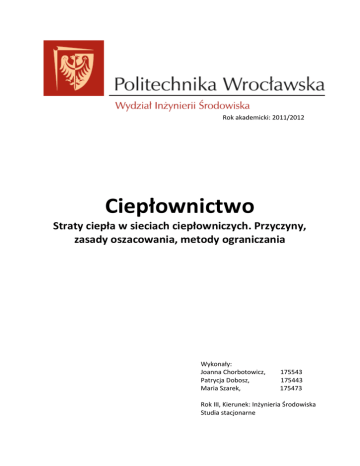 Rok akademicki: 2011/2012 Ciepłownictwo Straty ciepła w sieciach ciepłowniczych. Przyczyny, zasady oszacowania, metody ograniczania Wykonały: Joanna Chorbotowicz, Patrycja Dobosz, Maria Szarek, 175543 175443 175473 Rok III, Kierunek: Inżynieria Środowiska Studia stacjonarne Wstęp. Ciepło to jeden z ważnych elementów towarzyszących naszemu życiu, nad którymi właściwie nie zastanawiamy się na co dzień. Chcemy, aby w naszym mieszkaniu było ciepło, aby ciepła woda była dostępna zawsze wtedy, gdy jej potrzebujemy. Jednak zanim woda ciepłownicza dotrze do węzła ciepłowniczego, musi pokonać wiele przeszkód, które przyczyniają się do strat ciepła przy przesyle. W niniejszej pracy omówione zostały zagadnienia dotyczące strat ciepła w sieciach ciepłowniczych, straty, które występują podczas działania systemów rurociągów ciepłowniczych. Przedstawiono czynniki wpływające na zwiększone straty ciepła, możliwości ich szacowania, oraz zdolność optymalnego ograniczania. Ograniczanie strat ciepła w sieciach ciepłowniczych stało się bardzo ważnym aspektem. Europejska polityka energetyczna zaleca zwiększenie efektywności energetycznej. Pierwszym krokiem jest budowa skojarzonych systemów, w których wytwarzana jest zarówno energia elektryczna jak i ciepło. Głównie jednak należy zwrócić uwagę na dość wysokie straty ciepła na przesyle od źródła do odbiorcy. Zaczynając od źródła – ciepłownie to budynki, które produkują, a następnie transportują czynnik (zazwyczaj jest to woda o wysokiej temperaturze) dla sieci ciepłowniczych. Głównym zadaniem ciepłowni jest produkcja energii cieplnej dla systemu ciepłowniczego. Przyczyny strat ciepła. Straty ciepła są nieuniknionym zjawiskiem podczas wykorzystywania sieci ciepłowniczej. Wielkość strat przede wszystkim zależy od właściwości materiałów izolacyjnych rurociągów. Związane jest to ze zmienną temperaturą transportowanego czynnika. Gdy temperatura gruntu, czy otoczenia, odbiega znacznie od temperatury wewnątrz rurociągów, przy czym im wyższa różnica tym większe straty. Celem izolacji w przypadku sieci ciepłowniczych, nie jest tylko zmniejszenie strat, ale także zabezpieczenie przed oparzeniami – zapewniając utrzymanie na powierzchni przewodu, odpowiednio niskiej temperatury. W czasie kilkudziesięciu minionych lat – sieci, systemu rurociągów ciepłowniczych rozbudowywały się, przez co mają niejednorodną strukturę izolacji rur. Z upływem czasu, doskonalone były izolacje rur, produkowano lepsze materiały izolacyjne – dzięki temu można było ograniczyć, zmniejszyć straty ciepła. Zwiększające się straty ciepła, mogą świadczyć o długim czasie eksploatacji oraz zawilgoceniu materiału termoizolacyjnego – skruszeniu się włókien waty szklanej – te czynniki świadczą o zmniejszeniu się grubości warstwy izolacyjnej. Zjawisko destrukcji materiału izolacyjnego jest zależne od upływu czasu i jest to nieuniknione. Zazwyczaj przyczyną dużych strat ciepła, jest także zmieniające się zapotrzebowanie na ciepło dla odbiorców, oraz ewentualna zmiana parametrów czynnika. W ciepłowniach powinny być zainstalowane kotły ( tu powinno zwrócić się uwagę na ich typ oraz wielkość), które zależą od potrzeb cieplnych. Najważniejsze jest to, aby były tak dobrane, żeby przy zmiennym zapotrzebowaniu na ciepło – zapewniały elastyczność pracy kotłowni, oraz wysoką sprawność i niezawodność dostaw ciepła. Kolejnym miejscem występowania strat ciepła są komory ciepłownicze. Umieszczona jest w nich armatura odcinająca tj. zawory, zasuwy – nie są one zaizolowane, powoduje to wzrost temperatury powietrza w pomieszczeniu komory. Wielkość strat ciepła w komorach ciepłowniczych określa się na około 20-30% całkowitych strat ciepła w sieci ciepłowniczej. Komory ciepłownicze są nieizolowane – przykryte są niewielką grubością gruntu – co powoduje zwiększenie strat ciepła. Nie jest możliwe podanie ogólnej recepty na ograniczenie emisji ciepła w sieciach ciepłowniczych, ponieważ zależy ona od indywidualnych cech systemów ciepłowniczych. Można jedynie określić pola działania i czynności zmierzające do redukcji emisji ciepła. Zasady szacowania. Sieć ciepłownicza powinna zagwarantować wymagane parametry nośnika ciepła przy jak największej wydajności energetycznej i niskich kosztach eksploatacji. Aby to było możliwe należy oszacować wielkości strat ciepła, które występują podczas przesyłania ciepła. Starty ciepła występujące na sieci ciepłowniczej można wyrażać w postaci wartości bezwzględnej - GJ lub wartości względnej - %. Wartość bezwzględna określa ilość ciepła traconego przez przenikanie ciepła na drodze od nośnika ciepła do gruntu i powietrza zewnętrznego. Można ją wyrazić za pomocą wzoru: p k gdzie: m - strumień masy nośnika ciepła płynącego w rurze, kg/s cp- ciepło właściwe nośnika ciepła J/kg K Tp- początkowa temperatura nośnika ciepła Tk- końcowa temperatura nośnika ciepła Jednocześnie starty ciepła można wyrażać za pomocą wartości względnej czyli w % i określają udział strat ciepła w całkowitej energii produkowanej w ciepłowni i przesyłanej siecią ciepłowniczą. Wartość ta zmienia się w ciągu rok i zależy od wielkości przesyłanego ciepła i warunków atmosferycznych. Można je wyrazić za pomocą wzoru: gdzie: Qs - moc start ciepła, MW Qw - moc węzłów cieplnych, MW W okresie grzewczym straty na przesyle wynoszą ok 8-12%, podczas gdy w lecie wartość ta może dochodzi do 50%, co średniorocznie daje starty wielkości 20-30%. Różnica między temperaturą wody sieciowej w źródle ciepła i w węźle ciepłowniczym określa wartość schłodzenia w warunkach ustalonych. Δt tzr-tw tzr - temperatura w źródle ciepła tw - temperatura w węźle ciepłowniczym Wartość schłodzenia dla ka