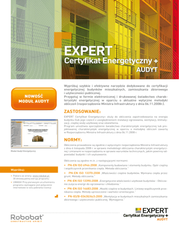 EXPERT Certyfikat Energetyczny + AUDYT Wypróbuj szybkie i efektywne narzędzie dedykowane do certyfikacji energetycznej budynków mieszkalnych, zamieszkania zbiorowego i użyteczności publicznej. Przygotuj w formie elektronicznej i drukowanej świadectwo charakterystyki energetycznej w oparciu o aktualne wytyczne metodyki obliczeń (rozporządzenie Ministra Infrastruktury z dnia 06.11.2008r.). ZASTOSOWANIE: EXPERT Certyfikat Energetyczny+ służy do obliczenia zapotrzebowania na energię budynku (lub jego części) z uwzględnieniem instalacji ogrzewania, wentylacji, klimatyzacji, ciepłej wody użytkowej oraz oświetlenia. Program umożliwia sporządzenie świadectwa charakterystyki energetycznej lub projektowanej charakterystyki energetycznej w oparciu o metodykę obliczeń zawartą w Rozporządzeniu Ministra Infrastruktury z dnia 06.11.2008 r. NORMY: Moduł Audyt Energetyczny Obliczenia prowadzone są zgodnie z wytycznymi rozporządzenia Ministra Infrastruktury z dnia 6 listopada 2008 r. w sprawie metodologii obliczania charakterystyki energetycznej i zmianami w rozporządzeniu w sprawie warunków technicznych, jakim powinny odpowiadać budynki i ich usytuowanie. Obliczenia są zgodne m.in. z następującymi normami: Wypróbuj: • Pobierz ze strony: www.robobat.pl 30 dniową pełną wersję programu • UWAGA! Przy pierwszym uruchomieniu programu wymagane jest połączenie internetowe w celu pobrania licencji • PN-EN ISO 6946:2008 „Komponenty budowlane i elementy budynku. Opór cieplny i współczynnik przenikania ciepła. Metoda obliczania.” • PN-EN ISO 13370:2008 „Właściwości cieplne budynków. Wymiana ciepła przez grunt. Metody obliczania.” • PN-EN ISO 13390:2008 „Energetyczne właściwości użytkowe budynków - Obliczanie zużycia energii do ogrzewania i chłodzenia.” • PN-EN ISO 14683:2008 „Mostki cieplne w budynkach. Liniowy współczynnik przenikania ciepła. Metody uproszczone i wartości orientacyjne.” • PN-83/B-03430/Az3:2000 „Wentylacja w budynkach mieszkalnych zamieszkania zbiorowego i użyteczności publicznej. Wymagania.” NAJWAŻNIEJSZE CECHY PROGRAMU: • obliczenia zapotrzebowania na energię dla budynków jedno i wielostrefowych z uwzględnieniem instalacji ogrzewania, wentylacji, klimatyzacji, ciepłej wody użytkowej oraz oświetlenia; • obliczenia prowadzone w oparciu o aktualne wytyczne Ministra Infrastruktury (z dnia 6.11.2008 r.), według najnowszych wersji norm: PN-EN ISO 6946:2008, PNEN ISO 13370:2008, PN-EN ISO 13390:2008, PN-EN ISO 14683:2008, PN-83/B-3430/ Az3:2000; • wbudowany edytor graficzny umożliwiający wprowadzenie rysunku rzutu kondygnacji i wykorzystanie go do automatycznego wyznaczania części danych geometrycznych; • możliwość importu rysunków rzutów kondygnacji (pliki w formacie DXF) jako podkładów ułatwiających wykonanie obrysu przegród (ścian zewnętrznych i wewnętrznych); • możliwość importu danych geometrycznych z pliku zapisanego w formacie gbXML (współpraca z Revit Structure, Architecture, MEP) - informacje o rodzaju, powierzchni, orientacji przegród oraz geometrii, lokalizacji okien/drzwi wraz z możliwością ustalenia domyślnych parametrów (U,g,c) • obliczenia współczynnika przenikania ciepła dla przegród o stałej grubości w oparciu o rozbudowane biblioteki materiałów budowlanych (normowych, typowych i producentów); • możliwość obliczenia współczynnika przenikania ciepła dla okien • możliwość tworzenia własnych bibliotek materiałowych; • generowanie raportu z wynikami obliczeń pośrednich, umożliwiającego weryfikację poprawności poszczególnych etapów obliczeń; • przygotowanie projektowanej charakterystyki energetycznej budynku; • przygotowanie świadectwa energetycznego (zgodnego ze wzorem z rozporządzenia Ministra Infrastruktury z dn. 6 listopada 2008 r.) w formacie PDF. Proces obliczeń - Profil budynku Charakterystyka budynku - edytor graficzny Analiza cieplno-wilgotnościowa W skład pakietu EXPERT Certyfikat Energetyczny wchodzi również EXPERT Analiza cieplno-wilgotnościowa, który służy do kompleksowe obliczania: oporu cieplnego R, współczynnika przenikania ciepła U oraz analizy cieplno-wilgotnościowej dla płaskich przegród o stałej grubości. Ponadto umożliwia tworzenie wspólnej bazy danych przegród, która jest wykorzystywana przez program EXPERT Certyfikat Energetyczny. Rezultaty - Certyfikat Najnowsza wersja pakietu EXPERT Certyfikat Energetyczny+ zawiera Moduł AUDYT służący do wykonywania audytów energetycznych w oparciu o Rozp. Min. Infrastruktury z dnia 17.03.2009r. Użytkownik ma możliwość przekazywania geometrii przegród między modułami Certyfikat i Audyt. Program EXPERT Certyfikat Energetyczny dostępny jest w wersji jednostanowiskowej i sieciowej. Wymagania systemowe: Microsoft® Windows® XP lub nowsze. Wymagania dodatkowe: połączenie z Internetem (rejestracja programu, aktualizacje). Robobat Polska Sp. z o.o. ul. Radzikowskiego 47 A, 31-315 Kraków tel. 012 639 25 00 • fax 012 639 25 02 www.robobat.pl