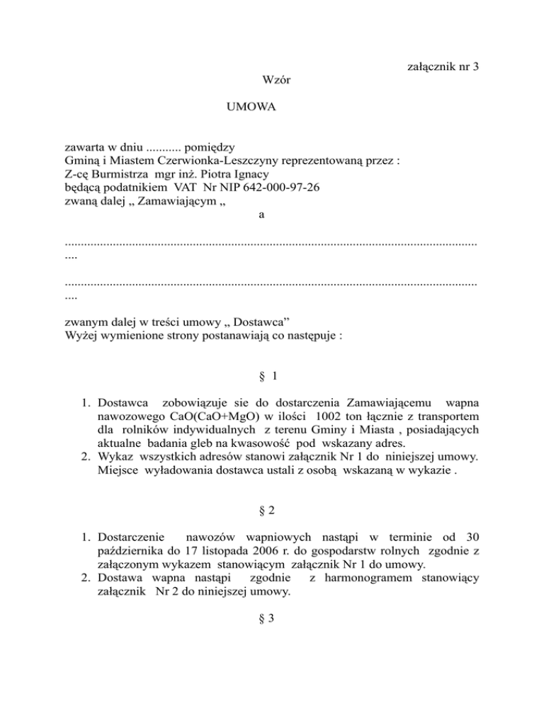 załącznik nr 3 Wzór UMOWA zawarta w dniu ........... pomiędzy Gminą i Miastem Czerwionka-Leszczyny reprezentowaną przez : Z-cę Burmistrza mgr inż. Piotra Ignacy będącą podatnikiem VAT Nr NIP 642-000-97-26 zwaną dalej „ Zamawiającym „ a ................................................................................................................................. .... ................................................................................................................................. .... zwanym dalej w treści umowy „ Dostawca” Wyżej wymienione strony postanawiają co następuje : § 1 1. Dostawca zobowiązuje sie do dostarczenia Zamawiającemu wapna nawozowego CaO(CaO+MgO) w ilości 1002 ton łącznie z transportem dla rolników indywidualnych z terenu Gminy i Miasta , posiadających aktualne badania gleb na kwasowość pod wskazany adres. 2. Wykaz wszystkich adresów stanowi załącznik Nr 1 do niniejszej umowy. Miejsce wyładowania dostawca ustali z osobą wskazaną w wykazie . §2 1. Dostarczenie nawozów wapniowych nastąpi w terminie od 30 października do 17 listopada 2006 r. do gospodarstw rolnych zgodnie z załączonym wykazem stanowiącym załącznik Nr 1 do umowy. 2. Dostawa wapna nastąpi zgodnie z harmonogramem stanowiący załącznik Nr 2 do niniejszej umowy. §3 1. Wapno nawozowe dostarczone będzie bez opakowania 2. Do każdej partii dostarczonego wapna powinien być dostarczony atest. §4 1.Zapłata za dostarczone wapno nastąpi na podstawie dwóch faktur : − faktura na kwotę ........ zostanie zapłacona przez Gminę i Miasto Czerwionka-Leszczyny ul. Parkowa 9 44-230 Czerwionka-Leszczyny NIP 642-000-97-26 , natomiast pozostała kwota ...................... zostanie zapłacona przez rolników indywidualnych ( odbiorców ). 2.Zamawiający zapłaci Dostawcy za przedłożoną fakturę opiewającą na kwotę........ w terminie 30 dni , licząc od dnia otrzymania faktury. Do faktury należy dołączyć następujące dokumenty : a) pokwitowanie odbioru wapna przez rolników ( wg wykazu zał. Nr 1 do umowy), b) zestawienie zbiorcze dostarczonego wapna, c) kopię faktur wystawionym rolnikom indywidualnym na pozostałą część należności za wapno. 3. Zapłata nastąpi w formie przelewu w terminie jak w ust. 2 na konto dostawcy ................................................................................... §5 1. W razie nie wykonania lub nienależytego wykonania umowy : Dostawca zobowiązuje się zapłacić Zamawiającemu kary umowne : a) w wysokości 10% wartości umownej, gdy Zamawiający odstąpi od umowy z powodu okoliczności, za które odpowiada Dostawca . b) w wysokości 0,2 % wartości umownej nie dostarczonego w terminie wapna nawozowego za każdy rozpoczęty dzień zwłoki. 2. W razie , gdy kara umowna nie pokryje szkody oraz w innych przypadkach nie wykonania lub nienależytego wykonania umowy strony dopuszczają możliwość dochodzenia odszkodowania na zasadach ogólnych wynikających z przepisów kodeksu cywilnego. §6 Zmiany bądź uzupełnienia niniejszej umowy mogą nastąpić jedynie w formie pisemnej pod rygorem nieważności z zastosowaniem art. 144 ustawy prawo zamówień publicznych. §7 W razie wystąpienia istotnej zmiany okoliczności powodującej, że wykonanie umowy nie leży w interesie publicznym odbiorcy, czego nie można było przewidzieć w chwili zawierania umowy odbiorca zastrzega sobie możliwość odstąpienia od niniejszej umowy w terminie 30 dni od powzięcia wiadomości o tych okolicznościach. W takim przypadku dostawca może zadać jedynie wynagrodzenia należnego mu z tytułu wykonania części umowy. §8 Ewentualne spory powstałe na tle wykonania przedmiotu umowy, strony rozstrzygać będą na drodze polubownej a w przypadku nie dojścia do porozumienia poddają rozstrzygnięciu Sądowi właściwemu dla Zamawiającego . §9 W sprawach nieunormowanych niniejszą umową zastosowanie mają przepisy kodeksu cywilnego oraz ustawy prawo zamówień publicznych . § 10 Umowę sporządzono w 4 jednobrzmiących egzemplarzach, czego 1 dla dostawcy, a 3 dla zamawiającego. § 11 Integralną częścią umowy stanowi : Załącznik Nr 1 – wykaz adresów gospodarstwo rolnych do których należy dostarczyć wapno nawozowe wraz z imieniem i nazwiskiem osoby uprawnionej do odbioru wapna . Załącznik Nr 2 - harmonogram dostawy wapna . Dostawca Zamawiający