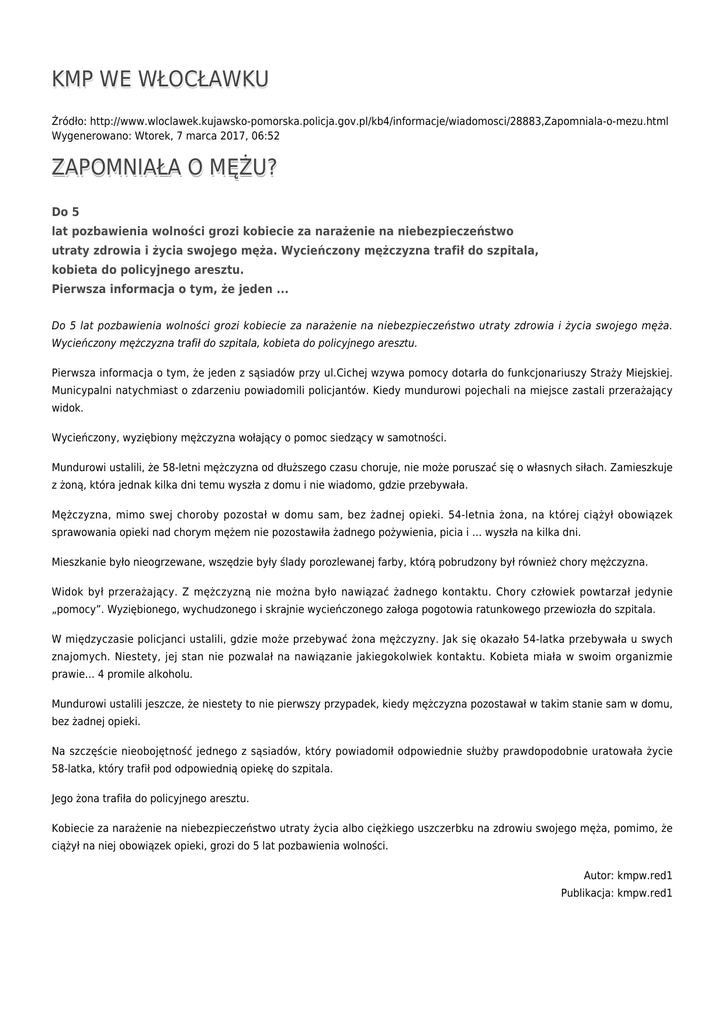 KMP WE WŁOCŁAWKU Źródło: http://www.wloclawek.kujawsko-pomorska.policja.gov.pl/kb4/informacje/wiadomosci/28883,Zapomniala-o-mezu.html Wygenerowano: Wtorek, 7 marca 2017, 06:52 ZAPOMNIAŁA O MĘŻU? Do 5 lat pozbawienia wolności grozi kobiecie za narażenie na niebezpieczeństwo utraty zdrowia i życia swojego męża. Wycieńczony mężczyzna trafił do szpitala, kobieta do policyjnego aresztu. Pierwsza informacja o tym, że jeden ... Do 5 lat pozbawienia wolności grozi kobiecie za narażenie na niebezpieczeństwo utraty zdrowia i życia swojego męża. Wycieńczony mężczyzna trafił do szpitala, kobieta do policyjnego aresztu. Pierwsza informacja o tym, że jeden z sąsiadów przy ul.Cichej wzywa pomocy dotarła do funkcjonariuszy Straży Miejskiej. Municypalni natychmiast o zdarzeniu powiadomili policjantów. Kiedy mundurowi pojechali na miejsce zastali przerażający widok. Wycieńczony, wyziębiony mężczyzna wołający o pomoc siedzący w samotności. Mundurowi ustalili, że 58-letni mężczyzna od dłuższego czasu choruje, nie może poruszać się o własnych siłach. Zamieszkuje z żoną, która jednak kilka dni temu wyszła z domu i nie wiadomo, gdzie przebywała. Mężczyzna, mimo swej choroby pozostał w domu sam, bez żadnej opieki. 54-letnia żona, na której ciążył obowiązek sprawowania opieki nad chorym mężem nie pozostawiła żadnego pożywienia, picia i … wyszła na kilka dni. Mieszkanie było nieogrzewane, wszędzie były ślady porozlewanej farby, którą pobrudzony był również chory mężczyzna. Widok był przerażający. Z mężczyzną nie można było nawiązać żadnego kontaktu. Chory człowiek powtarzał jedynie „pomocy”. Wyziębionego, wychudzonego i skrajnie wycieńczonego załoga pogotowia ratunkowego przewiozła do szpitala. W międzyczasie policjanci ustalili, gdzie może przebywać żona mężczyzny. Jak się okazało 54-latka przebywała u swych znajomych. Niestety, jej stan nie pozwalał na nawiązanie jakiegokolwiek kontaktu. Kobieta miała w swoim organizmie prawie… 4 promile alkoholu. Mundurowi ustalili jeszcze, że niestety to nie pierwszy przypadek, kiedy mężczyzna pozostawał w takim stanie sam w domu, bez żadnej opieki. Na szczęście nieobojętność jednego z sąsiadów, który powiadomił odpowiednie służby prawdopodobnie uratowała życie 58-latka, który trafił pod odpowiednią opiekę do szpitala. Jego żona trafiła do policyjnego aresztu. Kobiecie za narażenie na niebezpieczeństwo utraty życia albo ciężkiego uszczerbku na zdrowiu swojego męża, pomimo, że ciążył na niej obowiązek opieki, grozi do 5 lat pozbawienia wolności. Autor: kmpw.red1 Publikacja: kmpw.red1 Ocena: 0/5 (0) Tweetnij