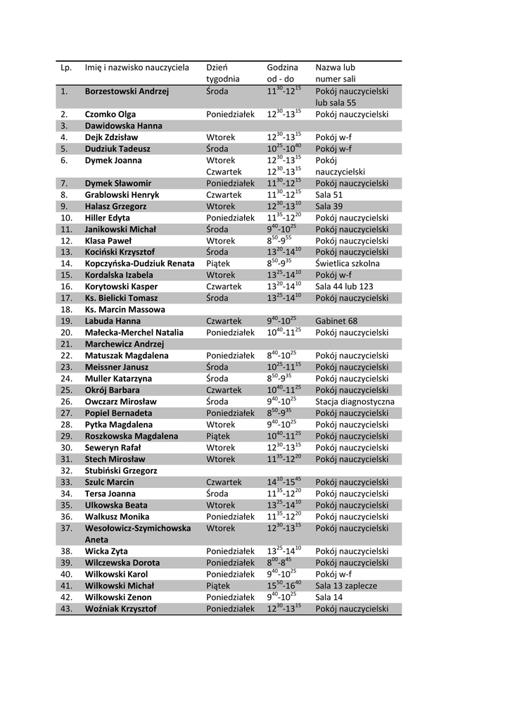 Lp. Imię i nazwisko nauczyciela 1. Borzestowski Andrzej 2. 3. 4. 5. 6. Czomko Olga Dawidowska Hanna Dejk Zdzisław Dudziuk Tadeusz Dymek Joanna 7. 8. 9. 10. 11. 12. 13. 14. 15. 16. 17. 18. 19. 20. 21. 22. 23. 24. 25. 26. 27. 28. 29. 30. 31. 32. 33. 34. 35. 36. 37. Dymek Sławomir Grablowski Henryk Halasz Grzegorz Hiller Edyta Janikowski Michał Klasa Paweł Kocioski Krzysztof Kopczyoska-Dudziuk Renata Kordalska Izabela Korytowski Kasper Ks. Bielicki Tomasz Ks. Marcin Massowa Labuda Hanna Małecka-Merchel Natalia Marchewicz Andrzej Matuszak Magdalena Meissner Janusz Muller Katarzyna Okrój Barbara Owczarz Mirosław Popiel Bernadeta Pytka Magdalena Roszkowska Magdalena Seweryn Rafał Stech Mirosław Stubioski Grzegorz Szulc Marcin Tersa Joanna Ulkowska Beata Walkusz Monika Wesołowicz-Szymichowska Aneta Wicka Zyta Wilczewska Dorota Wilkowski Karol Wilkowski Michał Wilkowski Zenon Woźniak Krzysztof 38. 39. 40. 41. 42. 43. Dzieo tygodnia Środa Godzina od - do 1130-1215 Poniedziałek 1230-1315 Nazwa lub numer sali Pokój nauczycielski lub sala 55 Pokój nauczycielski Wtorek Środa Wtorek Czwartek Poniedziałek Czwartek Wtorek Poniedziałek Środa Wtorek Środa Piątek Wtorek Czwartek Środa 1230-1315 1025-1040 1230-1315 1230-1315 1130-1215 1130-1215 1230-1310 1135-1220 940-1025 850-955 1320-1410 850-935 1325-1410 1320-1410 1325-1410 Pokój w-f Pokój w-f Pokój nauczycielski Pokój nauczycielski Sala 51 Sala 39 Pokój nauczycielski Pokój nauczycielski Pokój nauczycielski Pokój nauczycielski Świetlica szkolna Pokój w-f Sala 44 lub 123 Pokój nauczycielski Czwartek Poniedziałek 940-1025 1040-1125 Gabinet 68 Pokój nauczycielski Poniedziałek Środa Środa Czwartek Środa Poniedziałek Wtorek Piątek Wtorek Wtorek 840-1025 1025-1115 850-935 1040-1125 940-1025 850-935 940-1025 1040-1125 1230-1315 1135-1220 Pokój nauczycielski Pokój nauczycielski Pokój nauczycielski Pokój nauczycielski Stacja diagnostyczna Pokój nauczycielski Pokój nauczycielski Pokój nauczycielski Pokój nauczycielski Pokój nauczycielski Czwartek Środa Wtorek Poniedziałek Wtorek 1410-1545 1135-1220 1325-1410 1135-1220 1230-1315 Pokój nauczycielski Pokój nauczycielski Pokój nauczycielski Pokój nauczycielski Pokój nauczycielski Poniedziałek Poniedziałek Poniedziałek Piątek Poniedziałek Poniedziałek 1325-1410 800-845 940-1025 1550-1640 940-1025 1230-1315 Pokój nauczycielski Pokój nauczycielski Pokój w-f Sala 13 zaplecze Sala 14 Pokój nauczycielski