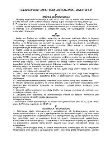 Regulamin Imprezy „SUPER MECZ LECHIA GDAŃSK – JUVENTUS F.C” §1 ZAKRES OBOWIĄZYWANIA 1. Niniejszy Regulamin obowiązuje w dniu 29.07.2015 roku na terenie PGE Arena Gdańsk na ulicy Pokoleń Lechii Gdańsk podczas imprezy Super Mecz (zwana dalej „Imprezą”). 2. Przebywanie na terenie Imprezy jest jednoznaczne z akceptacją niniejszego Regulaminu. 3. Impreza będzie rejestrowana dla potrzeb dokumentacyjno – promocyjnych. Uczestnictwo w Imprezie jest jednoznaczne z wyrażeniem zgody na wykorzystanie wizerunku w materiałach filmowych. §2 WSTĘP 1. Wstęp na Stadion jest możliwy wyłącznie za okazaniem ważnego biletu na imprezę zakupionego i wykorzystywanego zgodnie z warunkami ogólnymi publicznej sprzedaży biletów, o ile Organizator nie zezwolił na wstęp na innych warunkach tj. identyfikator, akredytacja, zaproszenie, innego rodzaju przepustki. Bilety nabyte z nielegalnych / nieupoważnionych źródeł uznaje się za nieważne. 2. Każda osoba (z zastrzeżeniem pkt 4 poniżej) może wejść na Arene wyłącznie za okazaniem ważnego biletu wraz z dowodem tożsamości w formie dokumentu urzędowego (takiego jak dowód osobisty, paszport lub prawo jazdy). Dane widniejące na bilecie(imię, nazwisko, PESEL) muszą być tożsame z dowodem osobistym, osobą nim się posługującym Bilet na Imprezę, jak również dowód tożsamości, muszą zostać okazane i przekazane do kontroli przy wejściu i na terenie Stadionu na prośbę członka służb informacyjnych i porządkowych lub funkcjonariusza policji. Odmowa współpracy w tym zakresie spowoduje odmowę wstępu na Stadion lub usunięcie ze Stadionu. 3. Osoby małoletnie, które nie ukończyły 13 roku życia, mają prawo wstępu na Stadion wyłącznie pod opieką osób pełnoletnich. 4. Dzieci, które w dniu wydarzenia nie mają ukończonych 7 lat życia, mają prawo wstępu na Stadion bez konieczności posiadania biletu z zastrzeżeniem braku gwarancji miejsca siedzącego. 5. Osoby niepełnosprawne powinny znajdować się na terenie Areny wraz z opiekunem. 6. Wjazd i parkowanie pojazdów na terenie Stadionu i/lub w granicach wyznaczonej strefy Stadionu jest dozwolone wyłącznie za specjalnym upoważnieniem wydanym przez Organizatora. 7. Warunki ogólnej publicznej sprzedaży biletów na Imprezę określają ich ważność oraz zasady korzystania z nich. 8. Zakupiony bilet upoważnia do jednorazowego wejścia na stadion, niemożliwe jest ponowne wejście na obiekt po jego opuszczeniu. §4 Wysyłka biletów - Zamówienie biletów kartonikowych na Super Mecz jest możliwe tylko do 12.07.15. Bilety dotrą do Państwa najpóźniej do 24.07.15. §3 KONTROLA i ZACHOWANIE 1. Członkowie służb informacyjnych i porządkowych lub funkcjonariusze policji są upoważnieni do kontroli – w tym z wykorzystaniem środków technicznych – czy dane osoby stwarzają zagrożenie dla bezpieczeństwa, a w szczególności, czy są pod wpływem alkoholu lub narkotyków bądź w posiadaniu broni lub innych niedozwolonych przedmiotów. Członkowie służb informacyjnych i porządkowych lub funkcjonariusze policji są upoważnieni do przeglądania odzieży danej osoby, bagażu oraz innych posiadanych przez nią przedmiotów. 2. Osoby wykorzystujące bilety w sposób niedozwolony, niestosujące się do wytycznych Organizatora (lub dowolnej upoważnionej osoby powołanej przez Organizatora), członka służb informacyjnych i porządkowych lub funkcjonariusza policji na Stadionie, stwarzające zagrożenie dla bezpieczeństwa bądź objęte lokalnym, krajowym lub zagranicznym zakazem wstępu na imprezę masową, nie zostaną wpuszczone na Stadionie są zobowiązane niezwłocznie zwrócić bilet do Organizatora, bez prawa do jakiegokolwiek zwrotu pieniężnego z tego tytułu. 3. Osoby przebywające na terenie Areny podczas trwania imprezy masowej są bezwzględnie zobowiązane do zachowania zgodnego z zasadami bezpieczeństwa, w sposób niezagrażający zdrowiu i życiu innych uczestników imprezy masowej oraz do wykonywania poleceń służby informacyjnej, służby porządkowej, spikera oraz Policji. 4. Od momentu wejścia na Stadion, wszystkie osoby zobowiązane są zajmować wyłącznie miejsca im przypisane w posiadanym bilecie na imprezę i korzystać z wyznaczonych ścieżek poruszania się. Każdy posiadacz biletu zobowiązuje się do zmiany miejsca wskazanego na bilecie, jeżeli zostanie o to poproszony przez przedstawicieli służb informacyjnych i porządkowych lub funkcjonariuszy policji. Jeżeli ktokolwiek otrzyma informację / wiadomość o szkodach wyrządzonych w mieniu lub w wyniku wypadku, powinien niezwłocznie podjąć kroki w celu powiadomienia o tym Organizatora (lub dowolnej upoważnionej osoby powołanej przez Organizatora), członka służb informacyjnych i porządkowych lub funkcjonariusza policji na Stadionie. 5. Możliwe jest wprowadzenie dalszych wyjątkowych środków kontroli w celu zapobieżenia zagrożeniu życia, zdrowia lub mienia bądź zmniejszenia lub wyeliminowania takiego zagrożenia. Wytyczne wydane przez członków służb informacyjnych i porządkowych lub funkcjonariuszy policji muszą być przestrzegane, a odmowa współpracy może skutkować usunięciem ze Stadionu. 6. Kto nie wykonuje polecenia porządkowego, wydanego na podstawie ustawy, regulaminu obiektu (terenu) lub regulaminu imprezy masowej przez służby porządkowe lub służby informacyjne, podlega karze grzywny nie niższej niż 2000 zł (Art. 54. Ustawy bezpieczeństwie imprez masowych z dnia 20 marca 2009 roku, tekst jednolity Dz. U. 2013 r., Nr 611, z późn. zm.). §4 ZAKAZY 1. Osoby obecne na wydarzeniu nie mogą rejestrować, wykorzystywać ani przesyłać dźwięku, obrazu lub opisu Areny lub imprezy (w tym wyniku, statystyki, informacji lub innych danych dotyczących wydarzenia) do użytku innego niż prywatny. Surowo zabronione jest rozpowszechnianie przez Internet, radio, telewizję lub za pośrednictwem innych współczesnych lub