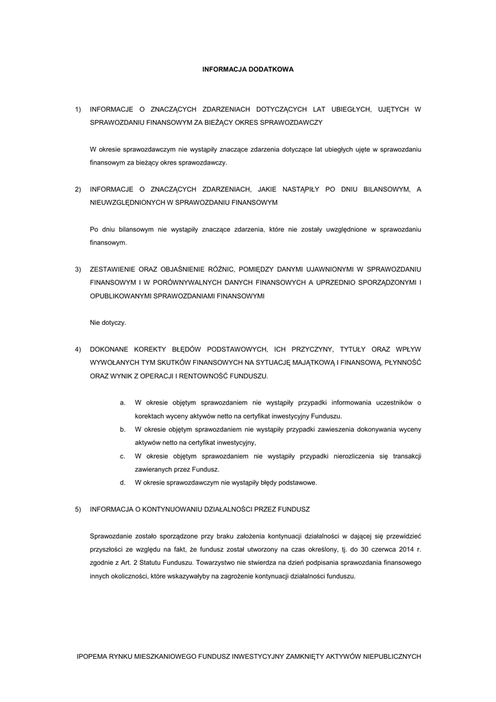 INFORMACJA DODATKOWA 1) INFORMACJE O ZNACZĄCYCH ZDARZENIACH DOTYCZĄCYCH LAT UBIEGŁYCH, UJĘTYCH W SPRAWOZDANIU FINANSOWYM ZA BIEŻĄCY OKRES SPRAWOZDAWCZY W okresie sprawozdawczym nie wystąpiły znaczące zdarzenia dotyczące lat ubiegłych ujęte w sprawozdaniu finansowym za bieżący okres sprawozdawczy. 2) INFORMACJE O ZNACZĄCYCH ZDARZENIACH, JAKIE NASTĄPIŁY PO DNIU BILANSOWYM, A NIEUWZGLĘDNIONYCH W SPRAWOZDANIU FINANSOWYM Po dniu bilansowym nie wystąpiły znaczące zdarzenia, które nie zostały uwzględnione w sprawozdaniu finansowym. 3) ZESTAWIENIE ORAZ OBJAŚNIENIE RÓŻNIC, POMIĘDZY DANYMI UJAWNIONYMI W SPRAWOZDANIU FINANSOWYM I W PORÓWNYWALNYCH DANYCH FINANSOWYCH A UPRZEDNIO SPORZĄDZONYMI I OPUBLIKOWANYMI SPRAWOZDANIAMI FINANSOWYMI Nie dotyczy. 4) DOKONANE KOREKTY BŁĘDÓW PODSTAWOWYCH, ICH PRZYCZYNY, TYTUŁY ORAZ WPŁYW WYWOŁANYCH TYM SKUTKÓW FINANSOWYCH NA SYTUACJĘ MAJĄTKOWĄ I FINANSOWĄ, PŁYNNOŚĆ ORAZ WYNIK Z OPERACJI I RENTOWNOŚĆ FUNDUSZU. a. W okresie objętym sprawozdaniem nie wystąpiły przypadki informowania uczestników o korektach wyceny aktywów netto na certyfikat inwestycyjny Funduszu. b. W okresie objętym sprawozdaniem nie wystąpiły przypadki zawieszenia dokonywania wyceny aktywów netto na certyfikat inwestycyjny, c. W okresie objętym sprawozdaniem nie wystąpiły przypadki nierozliczenia się transakcji zawieranych przez Fundusz. d. 5) W okresie sprawozdawczym nie wystąpiły błędy podstawowe. INFORMACJA O KONTYNUOWANIU DZIAŁALNOŚCI PRZEZ FUNDUSZ Sprawozdanie zostało sporządzone przy braku założenia kontynuacji działalności w dającej się przewidzieć przyszłości ze względu na fakt, że fundusz został utworzony na czas określony, tj. do 30 czerwca 2014 r. zgodnie z Art. 2 Statutu Funduszu. Towarzystwo nie stwierdza na dzień podpisania sprawozdania finansowego innych okoliczności, które wskazywałyby na zagrożenie kontynuacji działalności funduszu. IPOPEMA RYNKU MIESZKANIOWEGO FUNDUSZ INWESTYCYJNY ZAMKNIĘTY AKTYWÓW NIEPUBLICZNYCH W związku z planowaną likwidacją Funduszu utworzono rezerwę na przewidywane koszty likwidacji w kwocie 53 tys. zł.. Nie stwierdzono konieczności wprowadzania innych korekt. 6) INNE INFORMACJE NIŻ WSKAZANE W SPRAWOZDANIU FINANSOWYM, KTÓRE MOGŁYBY W ISTOTNY SPOSÓB WPŁYNĄĆ NA OCENĘ SYTUACJI MAJĄTKOWEJ, FINANSOWEJ, WYNIKU Z OPERACJI I ICH ZMIAN Istotne informacje o spółkach portfelowych: 1. SPV Support 3 Sp. z o.o. Projekt 1 SKA – na dzień 30 czerwca 2013 roku Wszelkie umowy zawarte przez SPV Support 3 Sp. z o.o. Projekt 1 SKA, obowiązujące na dzień 30 czerwca 2013 r., są zgodne z polityką inwestycyjną Funduszu: a) Zawarcie umowy z Ronson Development Sp. z o.o. – Landscape SK z siedzibą w Warszawie: − Data zawarcia umowy: 21.03.2011 r. − Wartość umowy: 9.974.342,93 zł − Przedmiot umowy: Umowa przedwstępna, której przedmiotem jest wybudowanie budynku, ustanowienie odrębnej własności lokali oraz zawarcie umowy sprzedaży lokali wraz z odpowiadającymi tym lokalom udziałami w częściach wspólnych budynku oraz takim samym udziałem w prawie użytkowania wieczystego działki. − 26 czerwca 2012 r. dokonano odbioru technicznego wszystkich, objętych w/w umową, 21 lokali mieszkalnych. − W dniach 06 – 14.12 2012 r. Spółka przystąpiła do 21 notarialnych umów ustanowienia odrębnej własności lokali mieszkalnych i ich sprzedaży oraz do umów sprzedaży udziałów w lokalu niemieszkalnym – garażu, a także umów o podział do korzystania. b) Zawarcie umów z SABE Investments Sp. z o.o. z siedzibą w Warszawie: − Data zawarcia umów: 22.06.2011 r. − Wartość ostateczna umów: 10 350 577,44 zł − Przedmiot umów: Umowy przedwstępne, których przedmiotem jest wybudowanie budynku mieszkalnego wielorodzinnego, wydzielenie lokali mieszkalnych i użytkowych oraz zawarcie umowy ustanowienia odrębnej własności lokali i ich sprzedaży na rzecz kupującego wraz z prawami związanymi, a także zawarcie umowy sprzedaży udziału we współwłasności garażu wraz z prawami związanymi. IPOPEMA RYNKU MIESZKANIOWEGO FUNDUSZ INWESTYCYJNY ZAMKNIĘTY AKTYWÓW NIEPUBLICZNYCH − 20 marca 2013 r. dokonano odbioru technicznego wszystkich, objętych w/w umową 28 lokali mieszkalnych. 2. SPV Support 3 Sp. z o.o. Holding SKA – na dzień 30 czerwca 2013 roku Wszelkie umowy zawarte przez SPV Support 3 Sp. z o.o. Holding SKA, obowiązujące na dzień 30 czerwca 2013 r., są zgodne z polityką inwestycyjną Funduszu: a) Zawarcie umowy z SPV Support 3 sp. z o.o. Projekt 1 SKA: − Data zawarcia umowy: 28.10.2011 r. − Wartość umowy: 5.194.760,27 zł − Przedmiot umowy: Przedmiotem umowy jest 5.000 obligacji o wartości nominalnej 1.000,00 zł każda, zabezpieczonych hipoteką, służących do sfinansowania projektu deweloperskiego o charakterze mieszkaniowo-usługowym w Warszawie przy ul. Belwederskiej, emitowanych przez „Belwederska” Sp. z o.o. z siedzibą we Wrocławiu, KRS 0000281240. Zobowiązanie do wypłaty świadczeń z obligacji zostało poręczone przez „Gant Development SA” z siedzibą w Legnicy, KRS 000025000. Obligacje zostaną wykupione w dniu 31 marca 2014 r. wraz z odsetkami. b) Zawarcie umów z PLATINUM PROJECT I Sp. z o.o. z siedzibą w Warszawie − Data zawarcia umów: 02.03.2012 r. − Wartość ostateczna umów: 1 528 841,10 zł − Przedmiot umów: Umowy przedwstępne, których przedmiotem jest wybudowanie budynku mieszkalnego wielorodzinnego, wydzielenie lokali mieszkalnych i użytkowych oraz zawarcie umów ustanowienia odrębnej własności lokali i ich sprzedaży na rzecz kupującego wraz z prawami związanymi, a także zawarcie umowy sprzedaży udziału we współwłasności garażu wraz z prawami związanymi. Zgodnie z umową płatności za w/w lokale mieszkalne i użytkowe Spółka dokona w dwóch transzach: i. 10% wartości umów (151 527,46 zł) płatne w terminie 3 dni roboczych od dnia, w którym zawarta zostanie 