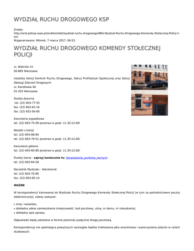 WYDZIAŁ RUCHU DROGOWEGO KSP Źródło: http://wrd.policja.waw.pl/wrd/kontakt/wydzial-ruchu-drogowego/864,Wydzial-Ruchu-Drogowego-Komendy-Stolecznej-Policji.h tml Wygenerowano: Wtorek, 7 marca 2017, 06:53 WYDZIAŁ RUCHU DROGOWEGO KOMENDY STOŁECZNEJ POLICJI ul. Waliców 15 00-865 Warszawa siedziba Sekcji Kontroli Ruchu Drogowego, Sekcji Profilaktyki Społecznej oraz Sekcji Obsługi Zdarzeń Drogowych ul. Karolkowa 46 01-203 Warszawa Służba dyżurna tel. (22) 603-77-55 fax. (22) 603-62-16 fax. (22) 632-56-00 Kancelaria wypadkowa tel. (22) 603-75-09 /przerwa w godz. 11.30-12.00/ Notatki z kolizji tel. (22) 603-68-84 tel. (22) 603-79-51 /przerwa w godz. 11.30-12.00/ Kancelaria główna tel. (22) 603-60-80 /przerwa w godz. 11.30-12.00/ Punkty karne - zajrzyj koniecznie tu: Sprawdzanie_punktow_karnych tel. (22) 603-64-58 Naczelnik Wydziału - Sekretariat tel. (22) 603-70-80 fax. (22) 603-65-14 WAŻNE W korespondencji kierowanej do Wydziału Ruchu Drogowego Komendy Stołecznej Policji (w tym za pośrednictwem poczty elektronicznej), należy wskazać: ● imię i nazwisko, ● dokładny adres zamieszkania (miejscowość, kod pocztowy, ulicę, nr domu, nr mieszkania), ● dokładny opis sprawy. Odpowiedzi będą udzielane w formie pisemnej wyłącznie drogą pocztową. Korespondencja nie spełniająca powyższych wymogów będzie traktowana jako anonimowa i wykorzystana jedynie w celach służbowych. Podstawy prawne: ● ustawa z dnia 14 czerwca 1960 r. Kodeks postępowania administracyjnego (Dz. U. z 2000r. nr 98, poz. 1071 z późn. zm.), ● rozporządzenie Rady Ministrów z dnia 8 stycznia 2002 r. w sprawie organizacji przyjmowania i rozpatrywania skarg i wniosków (Dz. U. nr 5 z 2002 r. poz.46). e-mail: [email protected] Zgłaszanie wypadków i kolizji oraz zauważonych wykroczeń: Tel. 997, 112 Ocena: 3.1/5 (9) Tweetnij