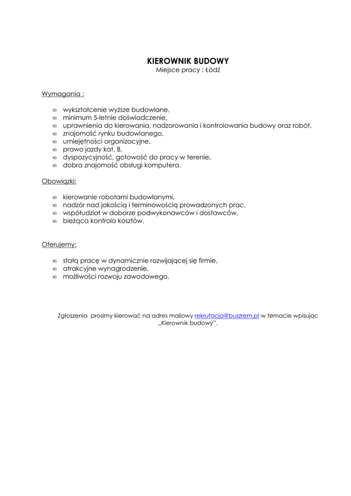 KIEROWNIK BUDOWY Miejsce pracy : Łódź Wymagania : • • • • • • • • wykształcenie wyższe budowlane, minimum 5-letnie doświadczenie, uprawnienia do kierowania, nadzorowania i kontrolowania budowy oraz robót, znajomość rynku budowlanego, umiejętności organizacyjne, prawo jazdy kat. B, dyspozycyjność, gotowość do pracy w terenie, dobra znajomość obsługi komputera. Obowiązki: • • • • kierowanie robotami budowlanymi, nadzór nad jakością i terminowością prowadzonych prac, współudział w doborze podwykonawców i dostawców, bieżąca kontrola kosztów. Oferujemy: • • • stałą pracę w dynamicznie rozwijającej się firmie, atrakcyjne wynagrodzenie, możliwości rozwoju zawodowego. Zgłoszenia prosimy kierować na adres mailowy [email protected] w temacie wpisując „Kierownik budowy”.