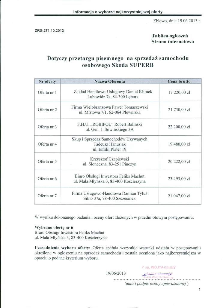 Informacja o wyborze najkorzystniejszej oferty Zblewo, dnia 19.06.2013 r. ZRG.271.10.2013 Tabliea ogłoszeń Strona internetowa Dotyczy przetargu pisemnego na sprzedaż samochodu osobowego Skoda SUPERB Nr oferty Oferta nr 1 Cena brutto Nazwa Oferenta Zakład Handlowo-Usługowy Daniel Klimek Lubowidz 7s, 84-300 Lębork 17220,00 zł Oferta nr 2 Firma Wielobranżowa Paweł Tomaszewski ul. Mistowa 7/1, 62-064 Plewniska 21 730,00 zł Oferta nr 3 F.H.U. "ROBIPOL" Robert Baliński ul. Gen. J. Sowińskiego 3A 22200,00 zł Oferta nr 4 Skup i Sprzedaż Samochodów Używanych Tadeusz Hanusiak ul. Emilii Plater 19 19480,00 zł Oferta nr 5 Krzysztof Czapiewski ul. Słoneczna, 83-251 Pinczyn 20222,00 zł Oferta nr 6 Biuro Obsługi Inwestora Feliks Machut ul. Mała Młyńska 3,83-400 Kościerzyna 23493,00 zł Oferta nr 7 Firma Usługowo-Handlowa Damian Tyluś Sitno 37a, 78-400 Szczecinek 21 047,00 zl W wyniku dokonanego badania i oceny ofert złożonych w przedmiotowym postępowaniu: Wybrano ofertę nr 6 Biuro Obsługi Inwestora Feliks Machut ul. Mała Młyńska 3,83-400 Kościerzyna Uzasadnienie wyboru oferty: Oferta spełnia wszystkie warunki udziału w postępowaniu określone w ogłoszeniu na sprzedaż samochodu i została oceniona jako najkorzystniejsza w oparciu o podane kryterium wyboru. Z uo. VH1JTA G LJ'( 19/06/2013 (data i podpis osoby upoważnionej) 1