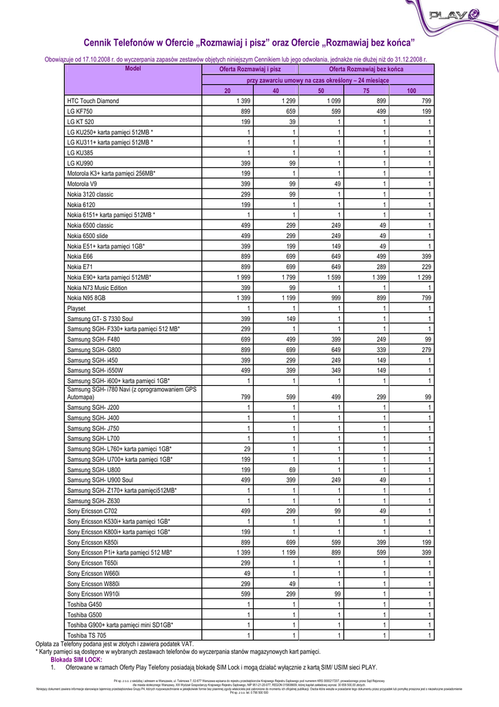 Cennik Telefonów w Ofercie „Rozmawiaj i pisz” oraz Ofercie „Rozmawiaj bez końca” Obowiązuje od 17.10.2008 r. do wyczerpania zapasów zestawów objętych niniejszym Cennikiem lub jego odwołania, jednakże nie dłużej niż do 31.12.2008 r. Model Oferta Rozmawiaj i pisz Oferta Rozmawiaj bez końca przy zawarciu umowy na czas określony – 24 miesiące 20 HTC Touch Diamond 40 50 75 100 1 399 1 299 1 099 899 799 LG KF750 899 659 599 499 199 LG KT 520 199 39 1 1 1 LG KU250+ karta pamięci 512MB * 1 1 1 1 1 LG KU311+ karta pamięci 512MB * 1 1 1 1 1 LG KU385 1 1 1 1 1 LG KU990 399 99 1 1 1 Motorola K3+ karta pamięci 256MB* 199 1 1 1 1 Motorola V9 399 99 49 1 1 Nokia 3120 classic 299 99 1 1 1 Nokia 6120 199 1 1 1 1 1 1 1 1 1 Nokia 6500 classic 499 299 249 49 1 Nokia 6500 slide 499 299 249 49 1 Nokia E51+ karta pamięci 1GB* 399 199 149 49 1 Nokia E66 899 699 649 499 399 Nokia 6151+ karta pamięci 512MB * Nokia E71 Nokia E90+ karta pamięci 512MB* Nokia N73 Music Edition Nokia N95 8GB Playset 899 699 649 289 229 1 999 1 799 1 599 1 399 1 299 399 99 1 1 1 1 399 1 199 999 899 799 1 1 1 1 1 Samsung GT- S 7330 Soul 399 149 1 1 1 Samsung SGH- F330+ karta pamięci 512 MB* 299 1 1 1 1 Samsung SGH- F480 699 499 399 249 99 Samsung SGH- G800 899 699 649 339 279 Samsung SGH- i450 399 299 249 149 1 Samsung SGH- i550W 499 399 349 149 1 1 1 1 1 1 Samsung SGH- i600+ karta pamięci 1GB* Samsung SGH- i780 Navi (z oprogramowaniem GPS Automapa) 799 599 499 299 99 Samsung SGH- J200 1 1 1 1 1 Samsung SGH- J400 1 1 1 1 1 Samsung SGH- J750 1 1 1 1 1 Samsung SGH- L700 1 1 1 1 1 Samsung SGH- L760+ karta pamięci 1GB* 29 1 1 1 1 Samsung SGH- U700+ karta pamięci 1GB* 199 1 1 1 1 Samsung SGH- U800 199 69 1 1 1 Samsung SGH- U900 Soul 499 399 249 49 1 Samsung SGH- Z170+ karta pamięci512MB* 1 1 1 1 1 Samsung SGH- Z630 1 1 1 1 1 499 299 99 49 1 Sony Ericsson K530i+ karta pamięci 1GB* 1 1 1 1 1 Sony Ericsson K800i+ karta pamięci 1GB* 199 1 1 1 1 Sony Ericsson K850i 899 699 599 399 199 Sony Ericsson C702 Sony Ericsson P1i+ karta pamięci 512 MB* 1 399 1 199 899 599 399 Sony Ericsson T650i 299 1 1 1 1 Sony Ericsson W660i 49 1 1 1 1 Sony Ericsson W880i 299 49 1 1 1 Sony Ericsson W910i 599 299 99 1 1 Toshiba G450 1 1 1 1 1 Toshiba G500 1 1 1 1 1 Toshiba G900+ karta pamięci mini SD1GB* 1 1 1 1 1 Toshiba TS 705 1 1 1 1 Opłata za Telefony podana jest w złotych i zawiera podatek VAT. * Karty pamięci są dostępne w wybranych zestawach telefonów do wyczerpania stanów magazynowych kart pamięci. Blokada SIM LOCK: 1. Oferowane w ramach Oferty Play Telefony posiadają blokadę SIM Lock i mogą działać wyłącznie z kartą SIM/ USIM sieci PLAY. 1 P4 sp. z o.o. z siedzibą i adresem w Warszawie, ul. Taśmowa 7, 02-677 Warszawa wpisana do rejestru przedsiębiorców Krajowego Rejestru Sądowego pod numerem KRS 0000217207, prowadzonego przez Sąd Rejonowy dla miasta stołecznego Warszawy, XIII Wydział Gospodarczy Krajowego Rejestru Sądowego, NIP 951-21-20-077, REGON 015808609, której kapitał zakładowy wynosi: 30 658 500,00 złotych. Niniejszy dokument zawiera informacje stanowiące tajemnicę przedsiębiorstwa Grupy P4, których rozpowszechnianie w jakiejkolwiek formie bez pisemnej zgody właściciela jest zabronione do momentu ich oficjalnej publikacji. Osoba która weszła w posiadanie tego dokumentu przez przypadek lub pomyłkę proszona jest o niezwłoczne powiadomienie P4 sp. z o.o. tel. 0 790 500 500 2. Abonent może żądać usunięcia blokady SIM Lock w Punktach Sprzedaży P4 po upływie okresu zastrzeżonego. Blokada SIM Lock usuwana jest w ramach istniejących możliwości technicznych. W przypadku usunięcia blokady SIM Lock poza Punktem Sprzedaży P4 w sposób nie uzgodniony z P4 Abonent może stracić prawo do bezpłatnej obsługi serwisowej Telefonu w ramach gwarancji, rękojmi lub uprawnień z tytułu niezgodności z umową, jeżeli wada / niezgodność z umową powstała na skutek usunięcia blokady SIM Lock. Promocyjne ceny Telefonów: 1. Przy zawieraniu Umowy w ramach Oferty Play, Abonent ma możliwość zakupu Telefonu na warunkach cenowych określonych w niniejszym Cenniku Telefonów. 2. P4 zastrzega, iż dostępność poszczególnych modeli Telefonów uzależniona jest od aktualnych stanów magazynowych Punktów Sprzedaży P4. P4 sp. z o.o. z siedzibą i adresem w Warszawie, ul. Taśmowa 7, 02-677 Warszawa wpisana do rejestru przedsiębiorców Krajowego Rejestru Sądowego pod numerem KRS 0000217207, prowadzonego przez Sąd Rejonowy dla miasta stołecznego Warszawy, XIII Wydział Gospodarczy Krajowego Rejestru Sądowego, NIP 951-21-20-077, REGON 015808609, której kapitał zakładowy wynosi: 30 658 500,00 złotych. Niniejszy dokument zawiera informacje stanowiące tajemnicę przedsiębiorstwa Grupy P4, których rozpowszechnianie w jakiejkolwiek formie bez pisemnej zgody właściciela jest zabronione do momentu ich oficjalnej publikacji. Osoba która weszła w posiadanie tego dokumentu przez przypadek lub pomyłkę proszona jest o niezwłoczne powiadomienie P4 sp. z o.o. tel. 0 790 500 500
