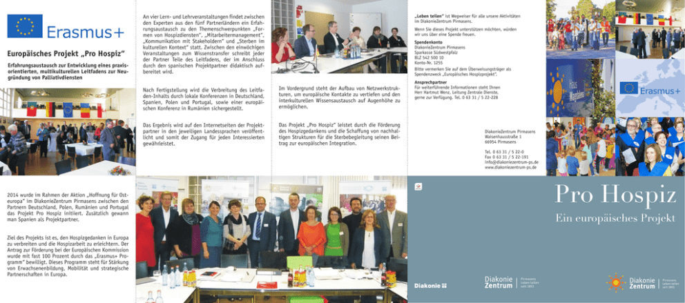 Europäisches Projekt „Pro Hospiz“ Erfahrungsaustausch zur Entwicklung eines praxisorientierten, multikulturellen Leitfadens zur Neugründung von Palliativdiensten „Leben teilen“ ist Wegweiser für alle unsere Aktivitäten im DiakonieZentrum Pirmasens. An vier Lern- und Lehrveranstaltungen findet zwischen den Experten aus den fünf Partnerländern ein Erfahrungsaustausch zu den Themenschwerpunkten „Formen von Hospizdiensten“, „Mitarbeitermanagement“, „Kommunikation mit Stakeholdern“ und „Sterben im kulturellen Kontext“ statt. Zwischen den einwöchigen Veranstaltungen zum Wissenstransfer schreibt jeder der Partner Teile des Leitfadens, der im Anschluss durch den spanischen Projektpartner didaktisch aufbereitet wird. Wenn Sie dieses Projekt unterstützen möchten, würden wir uns über eine Spende freuen. Spendenkonto DiakonieZentrum Pirmasens Sparkasse Südwestpfalz BLZ 542 500 10 Konto-Nr. 1255 Bitte vermerken Sie auf dem Überweisungsträger als Spendenzweck „Europäisches Hospizprojekt“. Nach Fertigstellung wird die Verbreitung des Leitfaden-Inhalts durch lokale Konferenzen in Deutschland, Spanien, Polen und Portugal, sowie einer europäischen Konferenz in Rumänien sichergestellt. Im Vordergrund steht der Aufbau von Netzwerkstrukturen, um europäische Kontakte zu vertiefen und den interkulturellen Wissensaustausch auf Augenhöhe zu ermöglichen. Das Ergebnis wird auf den Internetseiten der Projektpartner in den jeweiligen Landessprachen veröffentlicht und somit der Zugang für jeden Interessierten gewährleistet. Das Projekt „Pro Hospiz“ leistet durch die Förderung des Hospizgedankens und die Schaffung von nachhaltigen Strukturen für die Sterbebegleitung seinen Beitrag zur europäischen Integration. Ansprechpartner Für weiterführende Informationen steht Ihnen Herr Hartmut Wenz, Leitung Zentrale Dienste, gerne zur Verfügung. Tel. 0 63 31 / 5 22-228 DiakonieZentrum Pirmasens Waisenhausstraße 1 66954 Pirmasens Tel. 0 63 31 / 5 22-0 Fax 0 63 31 / 5 22-191 [email protected] www.diakoniezentrum-ps.de Pro Hospiz 2014 wurde im Rahmen der Aktion „Hoffnung für Osteuropa“ im DiakonieZentrum Pirmasens zwischen den Partnern Deutschland, Polen, Rumänien und Portugal das Projekt Pro Hospiz initiiert. Zusätzlich gewann man Spanien als Projektpartner. Ziel des Projekts ist es, den Hospizgedanken in Europa zu verbreiten und die Hospizarbeit zu erleichtern. Der Antrag zur Förderung bei der Europäischen Kommission wurde mit fast 100 Prozent durch das „Erasmus+ Programm“ bewilligt. Dieses Programm steht für Stärkung von Erwachsenenbildung, Mobilität und strategische Partnerschaften in Europa. Ein europäisches Projekt Pirmasens Leben teilen seit 1853 Pirmasens Leben teilen seit 1853 Onkologische Hospizstiftung Podlaskie Das DiakonieZentrum Pirmasens entstand bereits im Jahr 1853 als Unterstützungsverein und Heim für elternlose Kinder. Inzwischen ist daraus eine Einrichtung für alle Generationen geworden: eine verlässliche Größe im Bereich der Alten- und Jugendhilfe in der Region Südwestpfalz. Das DiakonieZentrum hat mit dem Hospiz Haus Magdalena ein Zuhause für Menschen geschaffen, die so krank sind, dass eine Heilung nach menschlichem Ermessen nicht mehr möglich ist. Ziel der Hospizarbeit ist es, die besonderen Bedürfnisse und Wünsche sterbenskranker Menschen ernst zu nehmen und sie soweit wie möglich zu erfüllen. Es ist die einzige Einrichtung ihrer Art in der Westpfalz. Hier erfahren Menschen eine bestmögliche Lebensqualität – bis zuletzt. Die Stiftung „Onkologisches Hospiz Podlasien“ wurde 2009 in Warschau ins Leben gerufen. Die Palliativbetreuung soll Kranken zugute kommen, deren Krankheit ursächlich nicht geheilt werden kann. Darüber hinaus wird den Personen, die die Kranken bis zum Ende ihres Lebens begleiten, Unterstützung angeboten. Hierzu zählen medizinisches Personal, Ehrenamtliche sowie Familienangehörige. Das Hospiz in Nowa Wola ist das einzige im ländlichen Raum von Polen und finanziert sich zum großen Teil aus Fundraising-Veranstaltungen. Seit 2010 ist im Haus eine Werkstatt für Menschen mit Behinderungen angegliedert. Hier werden 30 vorwiegend junge Menschen aus der Region betreut und Veranstaltungen mit dem Ziel der Integration der geistig und seelisch Behinderten in die Gesellschaft organisiert. Sfântu Gheorghe Rumänien Die Christliche Stiftung Diakonia des siebenbürgischen Reformierten Kirchendistriktes wurde 2001 gegründet. Als humanitäre Hilfsorganisation offeriert sie Dienstleistungen für gefährdete Gruppen, die sich in schwierigen sozialen Situationen befinden. Seit zwölf Jahren bieten sie ein Familienhilfswerk und ambulante Pflege in 54 Dörfern und drei Städten im Kreis Covasna an. Dabei engagiert sich die Stiftung bei vielfältigen Austauschprogrammen und Partnerorganisationen im Ausland. Die Organisation ist Bildungsträger für staatlich anerkannte und zertifizierte Fachfortbildungen, Fachaustausch für Pflegekräfte und Erwachsenenbildung im Bereich Altenpflege. In Sankt Georgen wurde im Jahr 2011 mit den Vorbereitungen für den Bau eines multifunktionalen Sozialzentrums begonnen, in dem neben einem Zentrum für Altenpflege und einer Einheit für Demenzpatienten auch Einrichtungen für die Pflege-und Hospizarbeit Platz finden sollen. Die Deutsche Evangelische Kirchengemeinde zu Porto wurde 1901 von deutschen Einwanderern gegründet. Seit 1956 ist die Gemeinde vertraglich mit der evangelischen Kirche Deutschlands (EKD) verbunden. In Zusammenarbeit mit dem gemeinnützigen Verein “Escolas de Torne e do Prado“ der Lusitanischen Kirche (Teil der anglikanischen Kirchengemeinschaft in Portugal) wurde ein Fortbildungsprogramm als Hilfe zur Selbsthilfe erarbeitet. Es soll mittellosen Menschen zur Reintegration verhelfen und bessere Voraussetzungen bei der Arbeitssuche schaffen. In Anbetracht der Kürzungen und Restriktionen im portugiesischen Sozial- und Gesundheitssystem als Folge der Fina