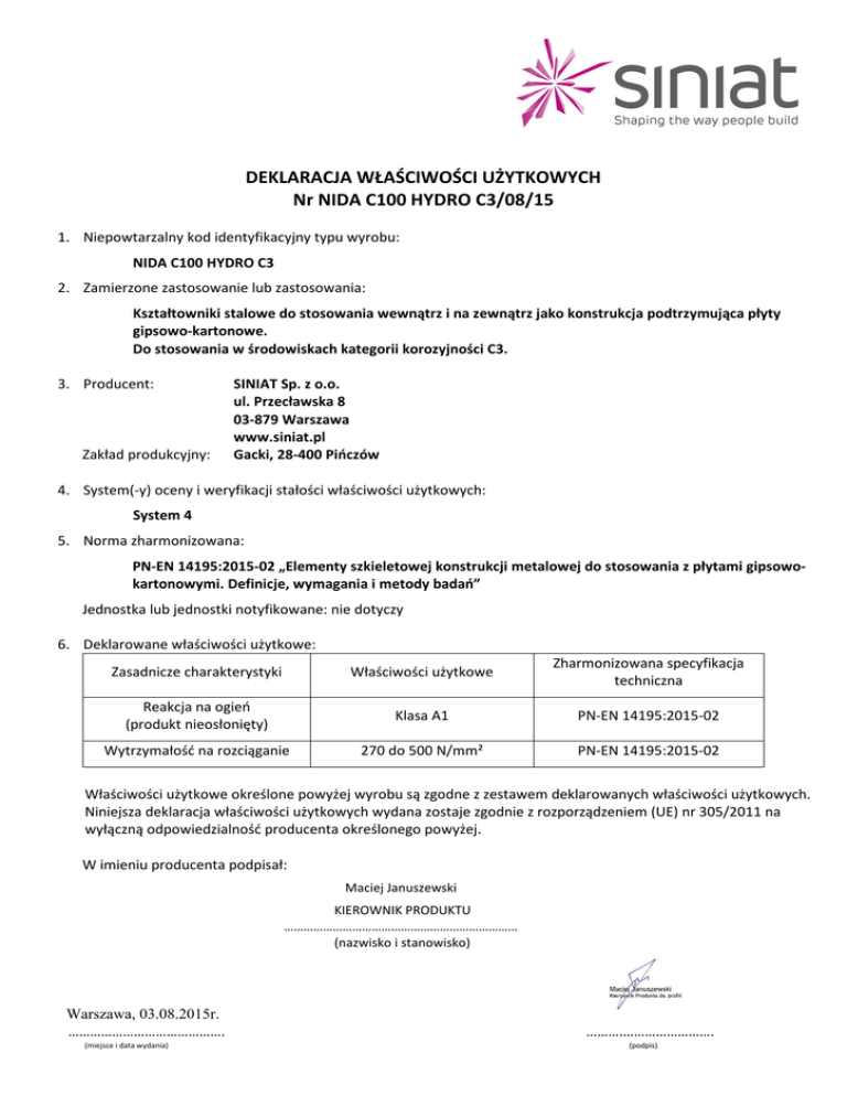 DEKLARACJA WŁAŚCIWOŚCI UŻYTKOWYCH Nr NIDA C100 HYDRO C3/08/15 1. Niepowtarzalny kod identyfikacyjny typu wyrobu: NIDA C100 HYDRO C3 2. Zamierzone zastosowanie lub zastosowania: Kształtowniki stalowe do stosowania wewnątrz i na zewnątrz jako konstrukcja podtrzymująca płyty gipsowo-kartonowe. Do stosowania w środowiskach kategorii korozyjności C3. 3. Producent: Zakład produkcyjny: SINIAT Sp. z o.o. ul. Przecławska 8 03-879 Warszawa www.siniat.pl Gacki, 28-400 Pińczów 4. System(-y) oceny i weryfikacji stałości właściwości użytkowych: System 4 5. Norma zharmonizowana: PN-EN 14195:2015-02 „Elementy szkieletowej konstrukcji metalowej do stosowania z płytami gipsowokartonowymi. Definicje, wymagania i metody badań” Jednostka lub jednostki notyfikowane: nie dotyczy 6. Deklarowane właściwości użytkowe: Zasadnicze charakterystyki Właściwości użytkowe Zharmonizowana specyfikacja techniczna Reakcja na ogień (produkt nieosłonięty) Klasa A1 PN-EN 14195:2015-02 Wytrzymałość na rozciąganie 270 do 500 N/mm² PN-EN 14195:2015-02 Właściwości użytkowe określone powyżej wyrobu są zgodne z zestawem deklarowanych właściwości użytkowych. Niniejsza deklaracja właściwości użytkowych wydana zostaje zgodnie z rozporządzeniem (UE) nr 305/2011 na wyłączną odpowiedzialność producenta określonego powyżej. W imieniu producenta podpisał: Maciej Januszewski KIEROWNIK PRODUKTU ……………………………………………………………… (nazwisko i stanowisko) Warszawa, 03.08.2015r. ……………………………………. (miejsce i data wydania) ……….……………………. (podpis)