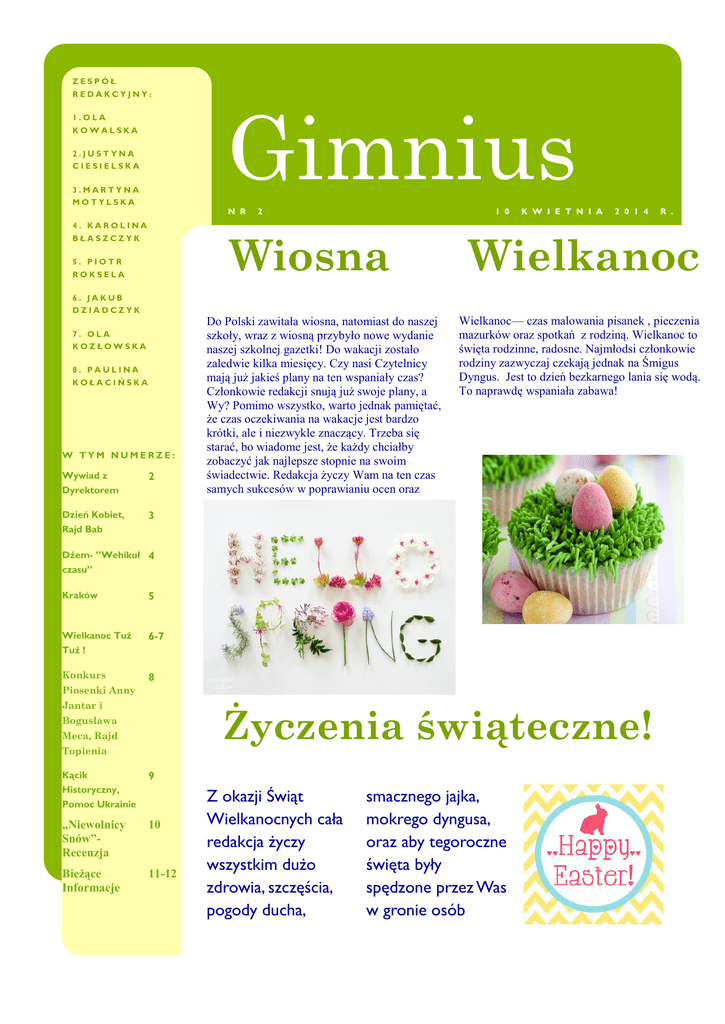 ZESPÓŁ REDAKCYJNY: 1.OLA KOWALSKA 2.JUSTYNA CIESIELSKA 3.MARTYNA MOTYLSKA Gimnius N R 4. KAROLINA 2 1 0 Wiosna BŁASZCZYK 5. PIOTR ROKSELA K W I E T N I A 2 0 1 4 R . Wielkanoc 6. JAKUB DZIADCZYK 7. OLA KOZŁOWSKA 8. PAULINA KOŁACIŃSKA W TYM NUMERZE: Wywiad z Dyrektorem 2 Dzień Kobiet, Rajd Bab 3 Do Polski zawitała wiosna, natomiast do naszej szkoły, wraz z wiosną przybyło nowe wydanie naszej szkolnej gazetki! Do wakacji zostało zaledwie kilka miesięcy. Czy nasi Czytelnicy mają już jakieś plany na ten wspaniały czas? Członkowie redakcji snują już swoje plany, a Wy? Pomimo wszystko, warto jednak pamiętać, że czas oczekiwania na wakacje jest bardzo krótki, ale i niezwykle znaczący. Trzeba się starać, bo wiadome jest, że każdy chciałby zobaczyć jak najlepsze stopnie na swoim świadectwie. Redakcja życzy Wam na ten czas samych sukcesów w poprawianiu ocen oraz Wielkanoc— czas malowania pisanek , pieczenia mazurków oraz spotkań z rodziną. Wielkanoc to święta rodzinne, radosne. Najmłodsi członkowie rodziny zazwyczaj czekają jednak na Śmigus Dyngus. Jest to dzień bezkarnego lania się wodą. To naprawdę wspaniała zabawa! Dżem- ”Wehikuł 4 czasu” Kraków 5 Wielkanoc Tuż Tuż ! 6-7 Konkurs 8 Piosenki Anny Jantar i Życzenia świąteczne! Bogusława Meca, Rajd Topienia Kącik Historyczny, Pomoc Ukrainie 9 „Niewolnicy Snów”Recenzja 10 Bieżące Informacje 11-12 Z okazji Świąt Wielkanocnych cała redakcja życzy wszystkim dużo zdrowia, szczęścia, pogody ducha, smacznego jajka, mokrego dyngusa, oraz aby tegoroczne święta były spędzone przez Was w gronie osób najbliższych!! STR. Wywiad z dyrektorem Gminnego Ośrodka Kultury w Woli Krzysztoporskiej Jolantą Kołacińską przeprowadzili uczniowie klasy IIId: Aleksandra Kazub, Natalia Wojtczyk, Natanel Wieczorek, Mateusz Mikołajczyk, Jacek Chabielski. Wywiad Z Panią Jolantą Kołacińską 2 Dyrektorem Gminnego Ośrodka Kultury W Woli Krzysztoporskiej Poznajemy Gok Ola Kazub – Jak długo pracuje Pani na tym stanowisku? Jolanta Kołacińska – Objęłam tę funkcję w styczniu 2010r., a zatem już ponad cztery lata. OK – Jakie grupy zainteresowań działają przy GOK-u? JK – Staramy się aby oferta skierowana w stronę dzieci i młodzieży była dobrana optymalnie biorąc pod uwagę różne zainteresowania. Dlatego prowadzimy zajęcia: w trzech grupach tanecznych i nazwach Selenas, Kumbia i Montana, które prezentują różne rodzaje tańca, zajecia akrobatyczno-cyrkowe w skład których wchodzi grupa Carawella oraz powstająca nowa grupa, która uczy się ekwilibrystyki oraz żonglerki, kolejnymi zajęciami są zajęcia teatralne oraz plastyczne, ale także wokalno-instrumentalne, które prowadzone są również w trzech grupach: o nazwach GOK-Star, The Masters, Jasna Strona Mocy. Ponadto przy Ośrodku funkcjonuje wokalny zespół ludowy. Wspieramy również naukę gry na instrumentach dętych w dwóch funkcjonujących na terenie naszej gminy orkiestrach dętych w Gomulinie oraz Bogdanowie. Ogólnie we wszystkich kołach zainteresowań bierze udział ponad 140 osób. Nie wiem Olu czy zdajesz sobie sprawę z tego, że większość tych grup artystycznych, zespołów oraz kół zainteresowań działających przy naszym GOK-u przetrwały modernizację tego budynku dzięki przychylności dyrekcji i pracowników szkoły, której jesteś uczennicą. Bowiem zajęcia w tym trudnym dla nas czasie odbywały się w lokalnym Zespole Szkolno-Gimnazjalnym. Dlatego czuję się bardzo zobowiązana. To wsparcie było dla nas wszystkich, zarówno dla mnie jak i dla moich pracowników ogromnie ważne. Jestem przekonana iż, w ramach rekompensaty uczniowie Waszej szkoły nie raz będą mogli skorzystać w różnych formach z tego pięknego wyremontowanego Ośrodka Kultury. Niewątpliwie atutem tego miejsca jest nowoczesna sala widowi skowana niemal 300 miejsc. Odległość jaka dzieli szkołę z GOK -iem jest niewielka, więc serdecznie zapraszamy. OK – Dziękujemy bardzo za te ciepłe słowa oraz za zaproszenie. Przekażę Panu dyrektorowi. Napewno niejednokrotnie skorzystamy. OK – Jakie osiągnięcia mają grupy skupione przy naszym GOK-u? JK – Nasze grupy już wiele osiągnęły. Do najważniejszych osiągnięć należy GRAND PRIX na Międzynarodowym Festiwalu Sztuki Cyrkowej w Dobrzeniu Wielkim koło Poznania. Rokrocznie nasze grupy taneczne i akrobatyczne zdobywają wysokie noty tj: pierwsze i drugie miejsce na Piotrkowskiej Panoramie Tanecznej. Zespoły wokalno-instrumentalne jako nieliczne w powiecie piotrkowskim otrzymuje nagrody na Powiatowych Przeglądach Zespołów Młodzieżowych, a zespół ludowy zdobył I miejsce na Festiwalu Pieśni Ludowej w Aleksandrowie Łódzkim. Przed nami wyjazd grup tanecznych i akrobatycznych na Przegląd Zespołów do Suchedniowa koła Kielc i wiele innych. Cieszę się ogromnie każdym sukcesem i jestem dumna, ponieważ nasza młodzież jest bardzo zdolna. Jednak największą radością dla mnie jest fakt, iż dzieci i młodzież chętnie tutaj przychodzą. Jest to niewątpliwie zasługa miłej, przyjazne atmosfery, która udało się nam wspólnie wypracować. Największym majątkiem w każdej instytucji są ludzie. Ponieważ od początku mojej pracy starałam się dobrać zaangażowany zespół instruktorów zaowocowało to skupienie coraz większej ilości młodych, zdolnych dzieciaków, które chętnie w tych dodatkowych zajęciach biorą udział. Wszyscy instruktorzy oprócz tego, że są profesjonalistami, starają się być mili i sympatyczni. To jest ta nasza tajemnica, która prowadzi do sukcesu. Prowadzimy artystyczny ruch amatorski, więc nie da się nikogo zmusić na siłę. Należy uświadomić sobie, że talent to dar, który otrzymujemy „z góry”. Takie instytucje jak nasz są po to, aby wyszukiwać talenty. Ale sam talent nie wystarczy do osiągnięcia sukcesu, ponieważ musi z nim iść w parze chęć i mozolna praca. Żałuję, że
