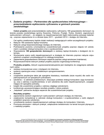 1. Zadania projektu – Partnerstwo dla społeczeństwa informacyjnego – przeciwdziałanie wykluczeniu cyfrowemu w gminach powiatu zwoleńskiego Celem projektu jest przeciwdziałanie wykluczeniu cyfrowemu 180 gospodarstw domowym na terenie powiatu zwoleńskiego (gminy Kazanów, Policzna, Przyłęk, Tczów, Zwoleń), zagrożonych wykluczeniem cyfrowym – ze względu na niepełnosprawność bądź niekorzystną sytuację materialną – poprzez zapewnienie im w okresie lipiec 2011 – grudzień 2012 r. dostępu do Internetu. Cel ogólny zrealizowany będzie dzięki realizacji następujących celów szczegółowych projektu: Nabycie 180 zestawów laptop+drukarka. Nabycie usługi bezprzewodowego dostępu do Internetu. Podniesienie poziomu e-kompetencji uczestników/czek projektu poprzez objęcie ich szkoleniami z podstaw obsługi komputera oraz e-społeczeństwa. Wyposażenie 180 gospodarstw domowych w zestawy laptop+drukarka z dostępem do internetu. Wyrównanie szans osób niepełnosprawnych w dostępie do Internetu poprzez nabycie odpowiednich urządzeń umożliwiających im obsługę komputera. Zapewnienie gospodarstwom domowym wsparcia poprzez usługi serwisowe (maintance). Rozpowszechnianie dobrych praktyk projektu poprzez organizację konferencji. Produkty projektu, których wypracowanie/zakupienie jest niezbędne do osiągnięcia zakładanych celów: zestawy komputerowe wraz z dostępem do Internetu, systemy operacyjne wraz z dodatkowym oprogramowaniem, drukarki, urządzenia peryferyjne takie jak specjalne klawiatury, trackballe (duże myszki) dla osób niepełnosprawnych ze specjalnymi potrzebami, szkolenia – w zakresie podstawowym, dotyczące podstaw obsługi komputera i jego konserwacji, oraz z zakresu e-społeczeństwa; w tym szkolenia dla osób niepełnosprawnych, uwzględniające ich specjalne potrzeby, książki dla uczestników projektu z zakresu objętego szkoleniami, konferencja upowszechniająca rezultaty projektu i dobre praktyki, „helpdeski” partnerów służące wsparcie dla uczestników/czek projektu. Rezultaty projektu: zapewnienie osobom zagrożonym wykluczeniem cyfrowym dostępu do Internetu, zwiększenie kompetencji w zakresie obsługi komputera i e-społeczeństwa u osób objętych projektem (poprzez szkolenia), umożliwienie osobom niepełnosprawnym pełnego dostępu do komputera i Internetu, Promocja eInclusion i dobrych praktyk, zwiększanie świadomości na temat korzyści płynących z realizacji projektu. Umowa Nr POIG.08.03.00-14-134/09-00 (2010-2012) Dotacje na innowacje. Inwestujemy w Waszą przyszłość Partnerstwo dla społeczeństwa informacyjnego – przeciwdziałanie wykluczeniu cyfrowemu w gminach Powiatu Zwoleńskiego Projekt współfinansowany ze środków Europejskiego Funduszu Rozwoju Regionalnego w ramach projektu Innowacyjna Gospodarka 1 Partnerstwo: Powiat Zwoleński – zarządzający projektem (główny informatyk, administracja i aktualizacja strony), gospodarstwa domowe – niepełnosprawni, rodziny zastępcze, uczniowie szkół ponadgimnazjalnych. Gmina Zwoleń – gospodarstwa domowe, uczniowie gimnazjów oraz VI klasy szkoły podstawowej. Stowarzyszenie Oświatowe Sycyna – grupa uzdolnionej młodzieży – Talenty szkolenia, doradztwo edukacyjne i informatyczne w tym on-line, ewaluacja projektu. 1. 2. 3. Działania: Uruchomienie: Biura Projektu, strony www (I kw. 2011). Procedury przetargowe, zakup sprzętu komputerowego i usług, w tym dostępu do bezprzewodowego Internetu (I–II kw. 2011). Informacja, promocja i rekrutacja (I–II kw. 2011) Termin zgłoszenia 31.01.2011, dochód w gospodarstwie domowym na osobę do 352 zł., samotnie gospodarujące do 471 zł., średnia ocen. Zgłoszenia: Urząd Gminy, Starostwo Powiatowe. 4. 5. 6. Kwalifikacja uczestników do projektu (II kw. 2011). Przekazania sprzętu Beneficjentom i zapewnienie dostępu do Internetu (III kw. 2011 – IV kw. 2012). Szkolenia (II kw. 2011 – IV kw. 2011) podstawy obsługi komputera, e-społeczeństwo, zaawansowane technologie, plany zajęć, materiały szkoleniowe, ćwiczenia, konsultacje on-line. 7. Monitoring i kontrola wykorzystania sprzętu, ewaluzacja (III kw. 2011 – IV kw. 2012) aktywnośćw e-doradztwie, użytkowania komputera, korzystania z Internetu, rejestracja wejść na stronę projektu. 8. Zapewnienie wsparcia w użytkowaniu sprzętu (III kw. 2011 – IV kw. 2012) i informatyczne. 9. Modernizacja sprzętu (IV kw. 2012). 10. Promocja projektu w tym organizacja konferencji (I kw. 2011 – IV kw. 2012). 2 e-doradztwo edukacyjne