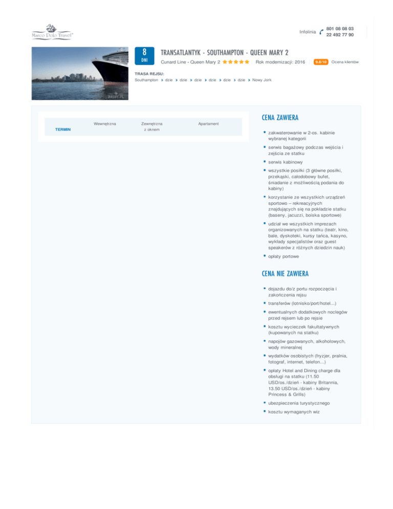 Infolinia 8 TRANSATLANTYK - SOUTHAMPTON - QUEEN MARY 2 DNI Cunard Line - Queen Mary 2 | Rok modernizacji: 2016 | 801 08 08 03 22 492 77 90 9.8/10 Ocena klientów TRASA REJSU: Southampton Wewnętrzna TERMIN Zewnętrzna z oknem dzie dzie dzie dzie Apartament dzie dzie Nowy Jork CENA ZAWIERA zakwaterowanie w 2-os. kabinie wybranej kategorii serwis bagażowy podczas wejścia i zejścia ze statku serwis kabinowy wszystkie posiłki (3 główne posiłki, przekąski, całodobowy bufet, śniadanie z możliwością podania do kabiny) korzystanie ze wszystkich urządzeń sportowo – rekreacyjnych znajdujących się na pokładzie statku (baseny, jacuzzi, boiska sportowe) udział we wszystkich imprezach organizowanych na statku (teatr, kino, bale, dyskoteki, kursy tańca, kasyno, wykłady specjalistów oraz guest speakerów z różnych dziedzin nauk) opłaty portowe CENA NIE ZAWIERA dojazdu do/z portu rozpoczęcia i zakończenia rejsu transferów (lotnisko/port/hotel...) ewentualnych dodatkowych noclegów przed rejsem lub po rejsie kosztu wycieczek fakultatywnych (kupowanych na statku) napojów gazowanych, alkoholowych, wody mineralnej wydatków osobistych (fryzjer, pralnia, fotograf, internet, telefon...) opłaty Hotel and Dining charge dla obsługi na statku (11.50 USD/os./dzień - kabiny Britannia, 13.50 USD/os./dzień - kabiny Princess & Grills) ubezpieczenia turystycznego kosztu wymaganych wiz