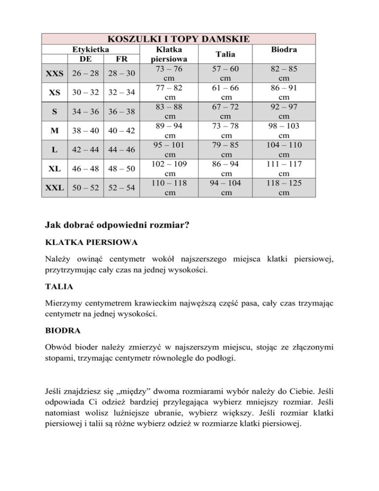 KOSZULKI I TOPY DAMSKIE Etykietka DE FR XXS 26 – 28 28 – 30 XS 30 – 32 32 – 34 S 34 – 36 36 – 38 M 38 – 40 40 – 42 L 42 – 44 44 – 46 XL 46 – 48 48 – 50 XXL 50 – 52 52 – 54 Klatka piersiowa 73 – 76 cm 77 – 82 cm 83 – 88 cm 89 – 94 cm 95 – 101 cm 102 – 109 cm 110 – 118 cm Talia 57 – 60 cm 61 – 66 cm 67 – 72 cm 73 – 78 cm 79 – 85 cm 86 – 94 cm 94 – 104 cm Biodra 82 – 85 cm 86 – 91 cm 92 – 97 cm 98 – 103 cm 104 – 110 cm 111 – 117 cm 118 – 125 cm Jak dobrać odpowiedni rozmiar? KLATKA PIERSIOWA Należy owinąć centymetr wokół najszerszego miejsca klatki piersiowej, przytrzymując cały czas na jednej wysokości. TALIA Mierzymy centymetrem krawieckim najwęższą część pasa, cały czas trzymając centymetr na jednej wysokości. BIODRA Obwód bioder należy zmierzyć w najszerszym miejscu, stojąc ze złączonymi stopami, trzymając centymetr równolegle do podłogi. Jeśli znajdziesz się „między” dwoma rozmiarami wybór należy do Ciebie. Jeśli odpowiada Ci odzież bardziej przylegająca wybierz mniejszy rozmiar. Jeśli natomiast wolisz luźniejsze ubranie, wybierz większy. Jeśli rozmiar klatki piersiowej i talii są różne wybierz odzież w rozmiarze klatki piersiowej.