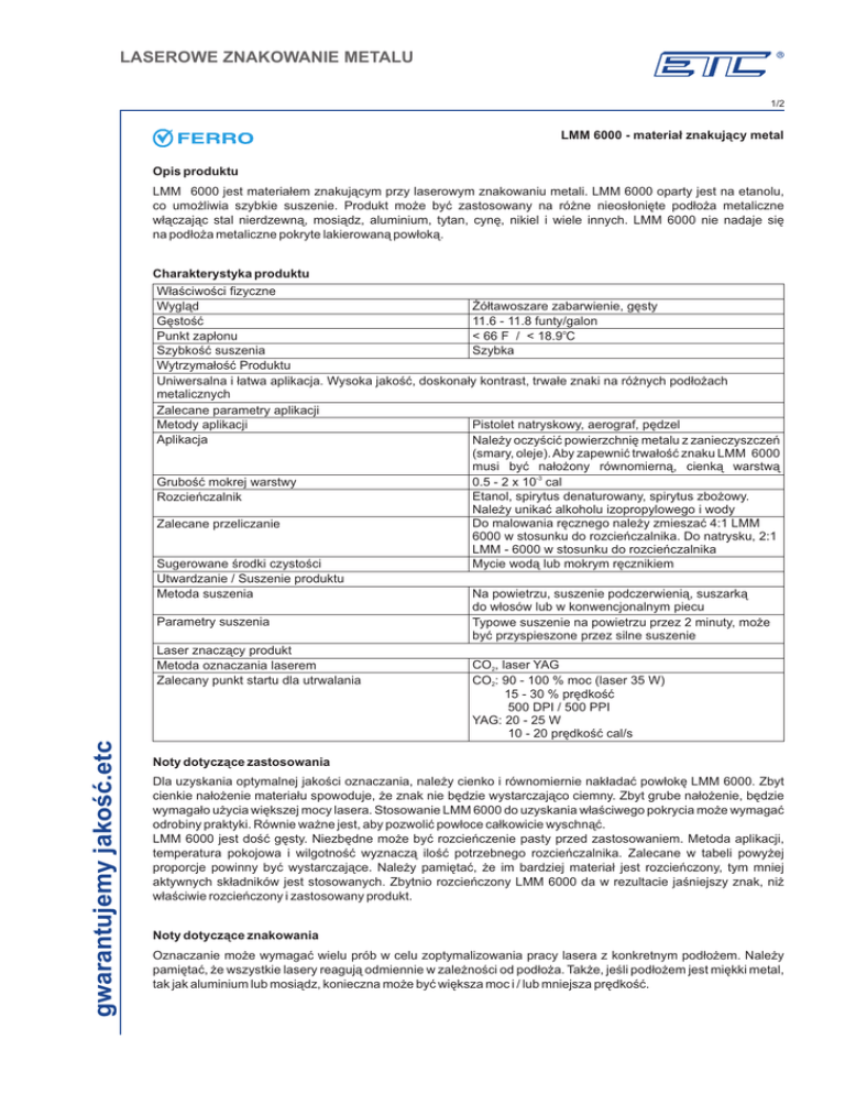 LASEROWE ZNAKOWANIE METALU 1/2 LMM 6000 - materia³ znakuj¹cy metal Opis produktu LMM 6000 jest materia³em znakuj¹cym przy laserowym znakowaniu metali. LMM 6000 oparty jest na etanolu, co umo¿liwia szybkie suszenie. Produkt mo¿e byæ zastosowany na ró¿ne nieos³oniête pod³o¿a metaliczne w³¹czaj¹c stal nierdzewn¹, mosi¹dz, aluminium, tytan, cynê, nikiel i wiele innych. LMM 6000 nie nadaje siê na pod³o¿a metaliczne pokryte lakierowan¹ pow³ok¹. Charakterystyka produktu gwarantujemy jakoœæ.etc W³aœciwoœci fizyczne Wygl¹d ¯ó³tawoszare zabarwienie, gêsty Gêstoœæ 11.6 - 11.8 funty/galon Punkt zap³onu < 66 F / < 18.9oC Szybkoœæ suszenia Szybka Wytrzyma³oœæ Produktu Uniwersalna i ³atwa aplikacja. Wysoka jakoœæ, doskona³y kontrast, trwa³e znaki na ró¿nych pod³o¿ach metalicznych Zalecane parametry aplikacji Metody aplikacji Pistolet natryskowy, aerograf, pêdzel Aplikacja Nale¿y oczyœciæ powierzchniê metalu z zanieczyszczeñ (smary, oleje). Aby zapewniæ trwa³oœæ znaku LMM 6000 musi byæ na³o¿ony równomiern¹, cienk¹ warstw¹ Gruboœæ mokrej warstwy 0.5 - 2 x 10-3 cal Etanol, spirytus denaturowany, spirytus zbo¿owy. Rozcieñczalnik Nale¿y unikaæ alkoholu izopropylowego i wody Do malowania rêcznego nale¿y zmieszaæ 4:1 LMM Zalecane przeliczanie 6000 w stosunku do rozcieñczalnika. Do natrysku, 2:1 LMM - 6000 w stosunku do rozcieñczalnika Sugerowane œrodki czystoœci Mycie wod¹ lub mokrym rêcznikiem Utwardzanie / Suszenie produktu Metoda suszenia Na powietrzu, suszenie podczerwieni¹, suszark¹ do w³osów lub w konwencjonalnym piecu Parametry suszenia Typowe suszenie na powietrzu przez 2 minuty, mo¿e byæ przyspieszone przez silne suszenie Laser znacz¹cy produkt CO2, laser YAG Metoda oznaczania laserem Zalecany punkt startu dla utrwalania CO2: 90 - 100 % moc (laser 35 W) 15 - 30 % prêdkoœæ 500 DPI / 500 PPI YAG: 20 - 25 W 10 - 20 prêdkoœæ cal/s Noty dotycz¹ce zastosowania Dla uzyskania optymalnej jakoœci oznaczania, nale¿y cienko i równomiernie nak³adaæ pow³okê LMM 6000. Zbyt cienkie na³o¿enie materia³u spowoduje, ¿e znak nie bêdzie wystarczaj¹co ciemny. Zbyt grube na³o¿enie, bêdzie wymaga³o u¿ycia wiêkszej mocy lasera. Stosowanie LMM 6000 do uzyskania w³aœciwego pokrycia mo¿e wymagaæ odrobiny praktyki. Równie wa¿ne jest, aby pozwoliæ pow³oce ca³kowicie wyschn¹æ. LMM 6000 jest doœæ gêsty. Niezbêdne mo¿e byæ rozcieñczenie pasty przed zastosowaniem. Metoda aplikacji, temperatura pokojowa i wilgotnoœæ wyznacz¹ iloœæ potrzebnego rozcieñczalnika. Zalecane w tabeli powy¿ej proporcje powinny byæ wystarczaj¹ce. Nale¿y pamiêtaæ, ¿e im bardziej materia³ jest rozcieñczony, tym mniej aktywnych sk³adników jest stosowanych. Zbytnio rozcieñczony LMM 6000 da w rezultacie jaœniejszy znak, ni¿ w³aœciwie rozcieñczony i zastosowany produkt. Noty dotycz¹ce znakowania Oznaczanie mo¿e wymagaæ wielu prób w celu zoptymalizowania pracy lasera z konkretnym pod³o¿em. Nale¿y pamiêtaæ, ¿e wszystkie lasery reaguj¹ odmiennie w zale¿noœci od pod³o¿a. Tak¿e, jeœli pod³o¿em jest miêkki metal, tak jak aluminium lub mosi¹dz, konieczna mo¿e byæ wiêksza moc i / lub mniejsza prêdkoœæ. LASEROWE ZNAKOWANIE METALU 2/2 Przygotowanie produktu Przed u¿yciem nale¿y zapewniæ staranne wymieszanie produktu. Temperatura pasty powinna byæ równoznaczna z temperatur¹ w pomieszczeniu druku, przed zmierzeniem lepkoœci czy aplikacj¹. Metoda badania lepkoœci Lepkoœæ produktu jest mierzona przez lepkoœciomierz Brookfield TM RTV D VIII, przy zastosowaniu wrzeciona w 100 RPM, w temperaturze 24oC. Przechowywanie gwarantujemy jakoœæ.etc Produkt powinien byæ przechowywany w suchym i zimnym pomieszczeniu, w temperaturze nie ni¿szej ni¿ 5oC i nie wy¿szej ni¿ 35oC. Podczas d³ugiego magazynowania mo¿e wyst¹piæ sedymentacja. Przed u¿yciem produkt nale¿y starannie wymieszaæ. Czêœciowo zu¿yte opakowania musz¹ byæ szczelnie zamkniête. Przy w³aœciwym przechowywaniu produkt jest odpowiedni do u¿ycia co najmniej 6 miesiêcy od daty produkcji. Informacja technicznInformacja przygotowana na podstawie oryginalnych materia³ów producenta LASER MARKING PRODUKT ETC sp. z o.o. ul. Drukarska 14 27-400 Ostrowiec Œw. tel.: 41 26 36 810 fax: 41 26 36 813 IT/OT/5.09/wyd-1/02.06
